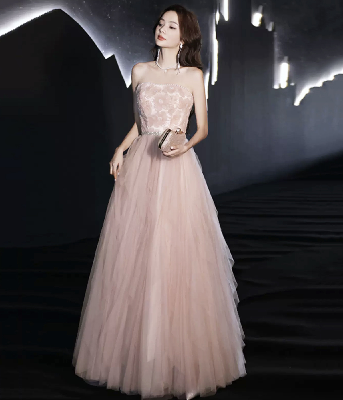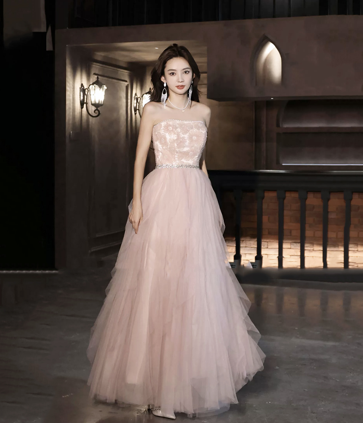 - Pink Strapless Tulle Long Ball Gown with Flowers -