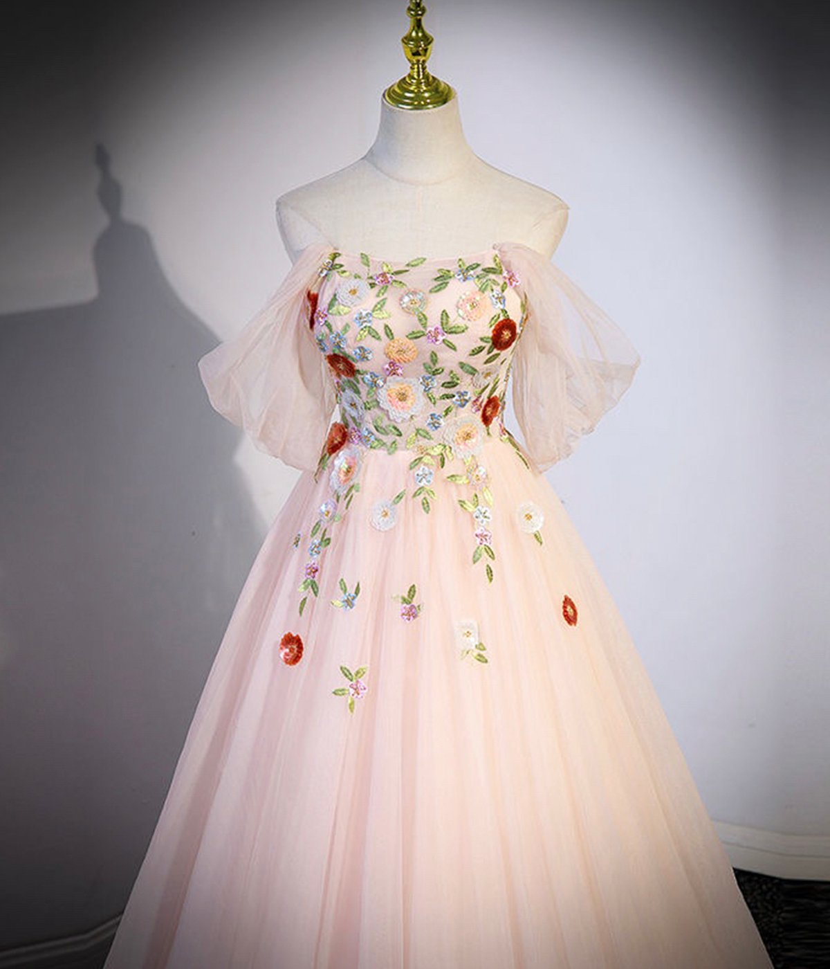 - Pink Tulle Sequins Long Prom Dress, Off the Shoulder Evening Party Dress -