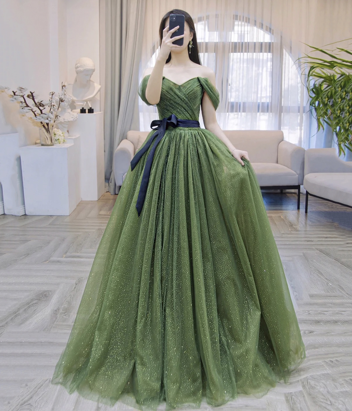 - Beautiful Green Tulle Off the Shoulder Floor Length Prom Dress -