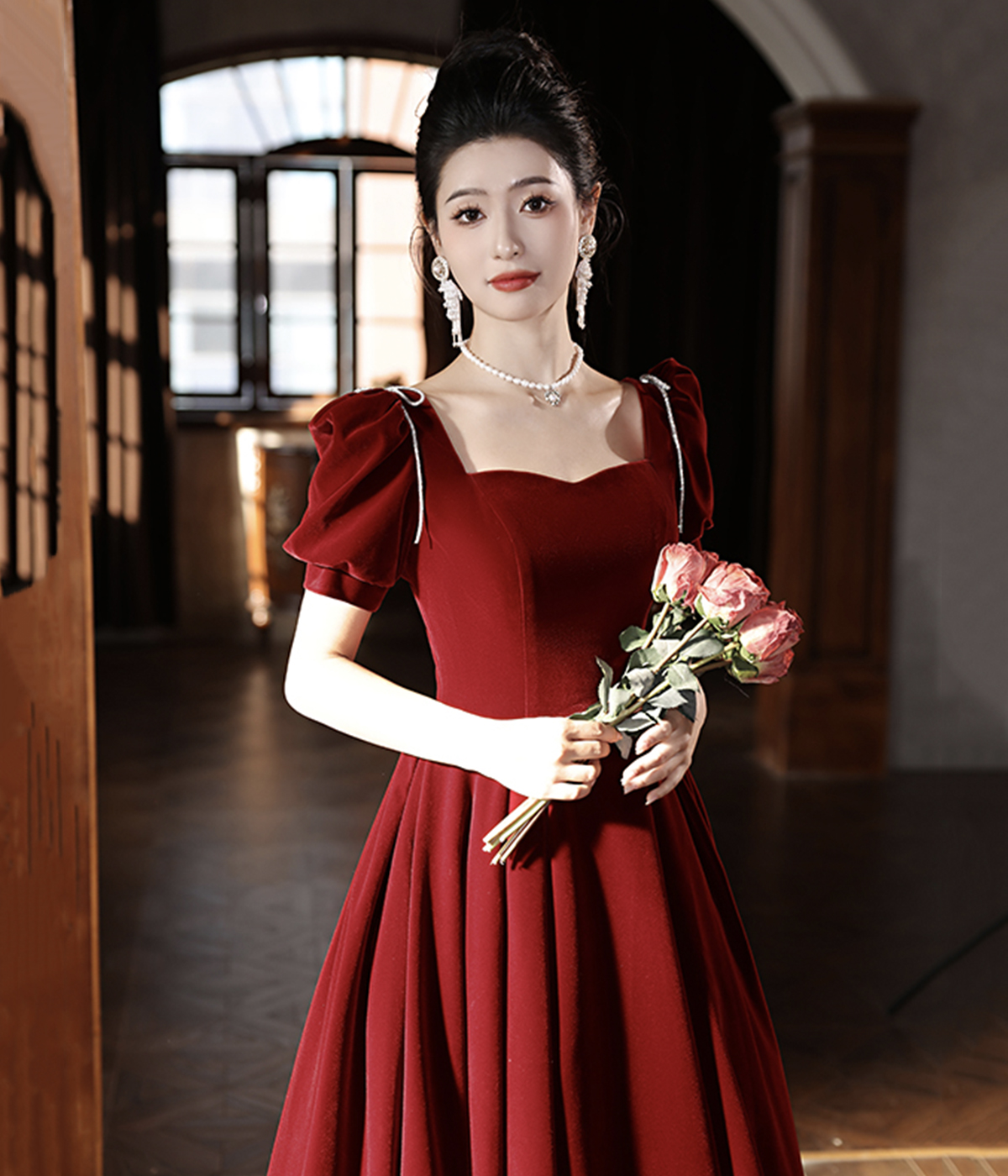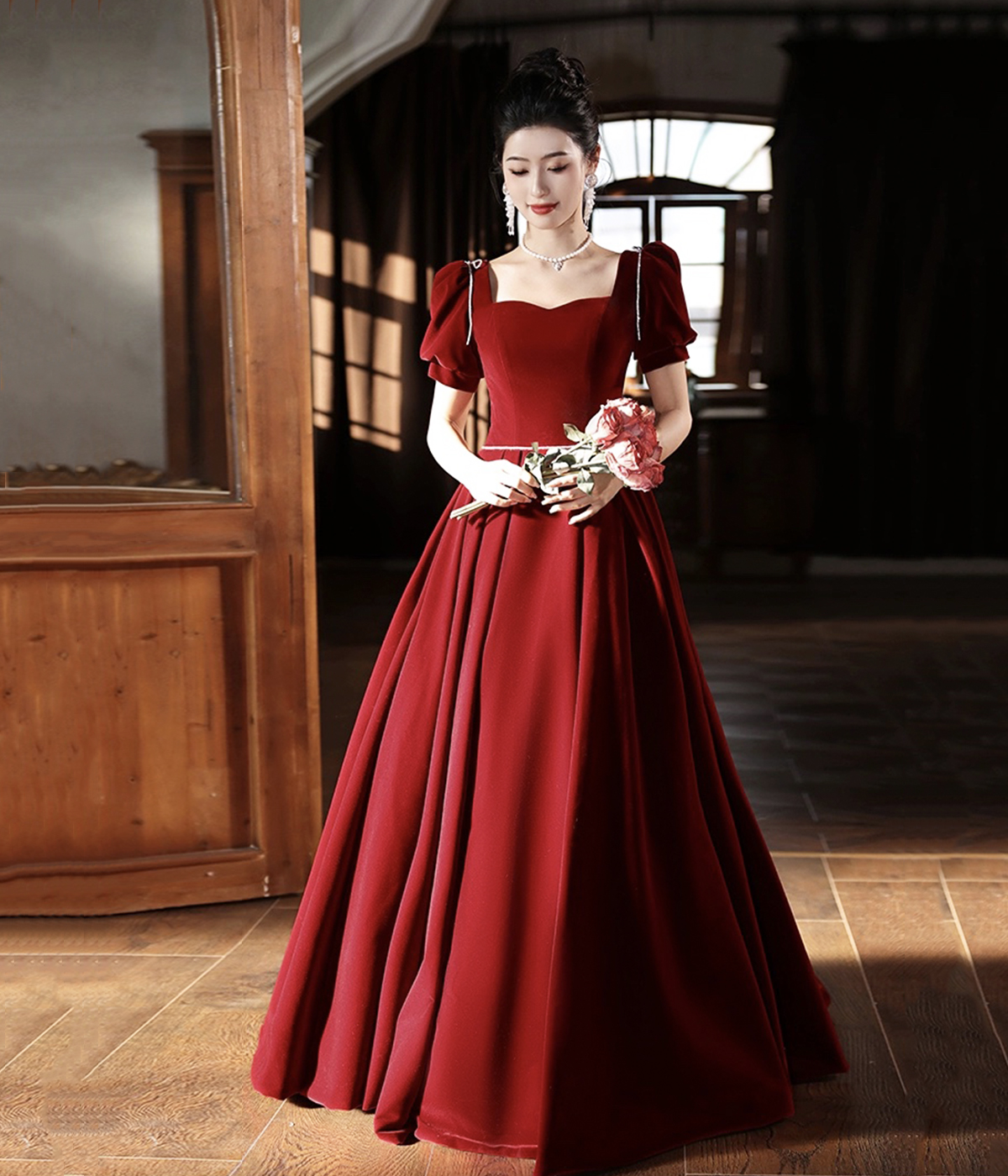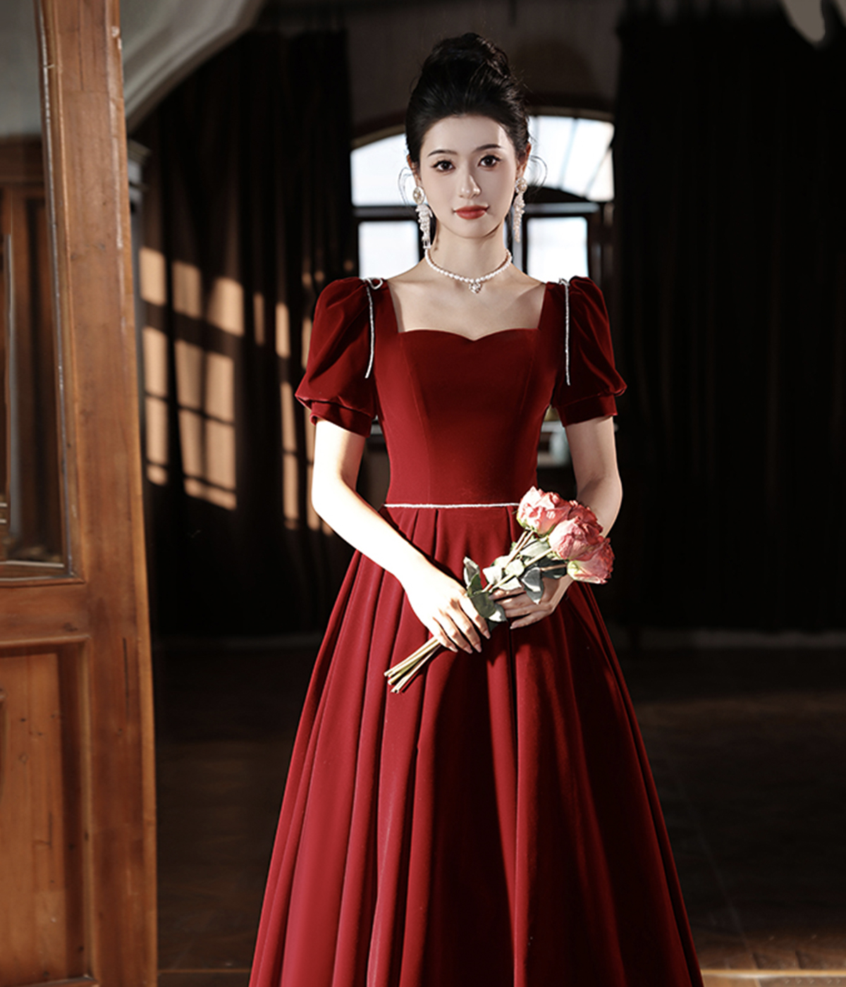 - Burgundy Velvet Floor Length Prom Dress, A-Line Short Sleeve Evening Dress -