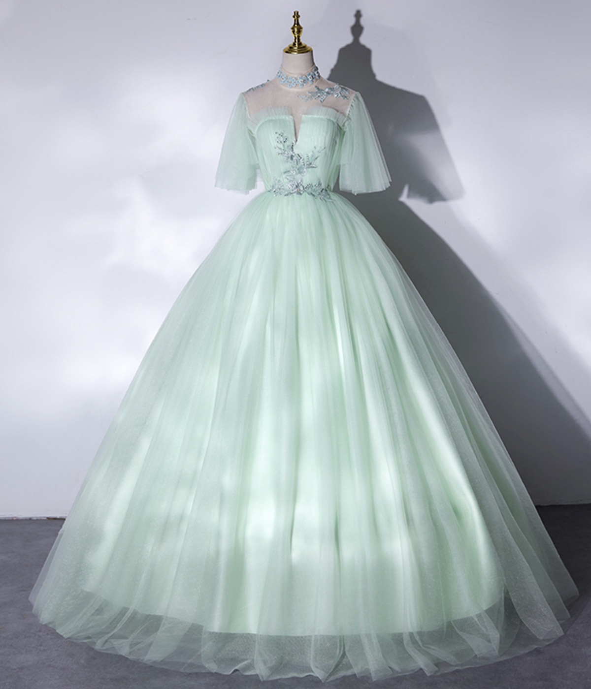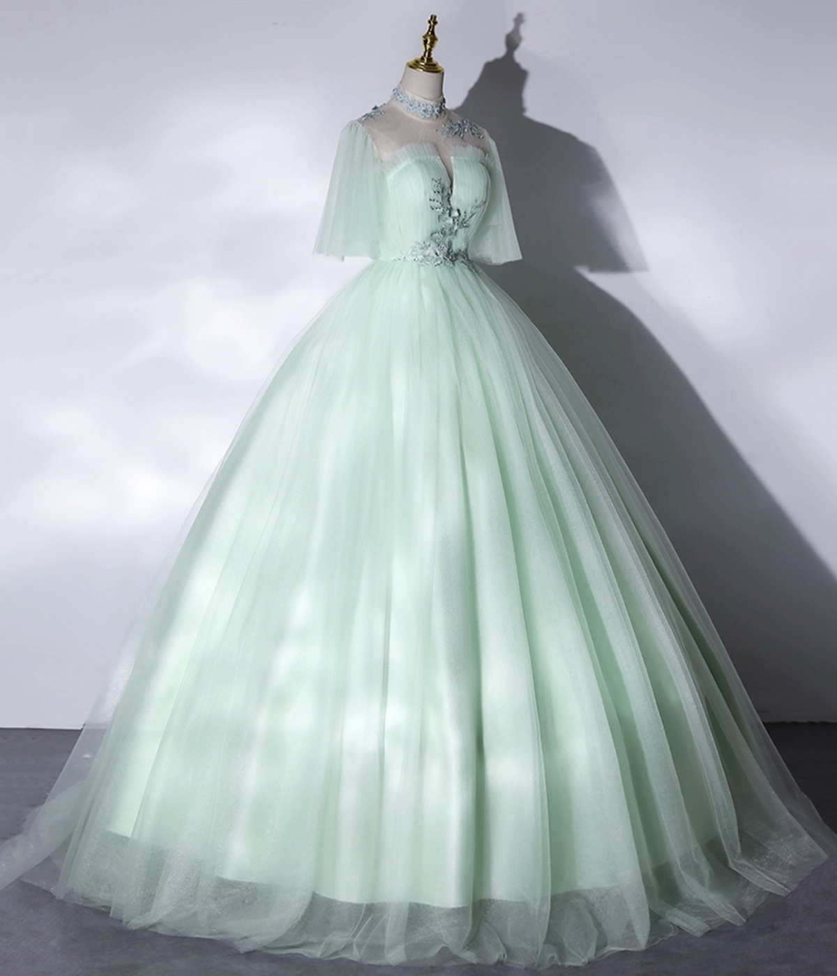 - Green Tulle Lace Long A-Line Ball Gown -