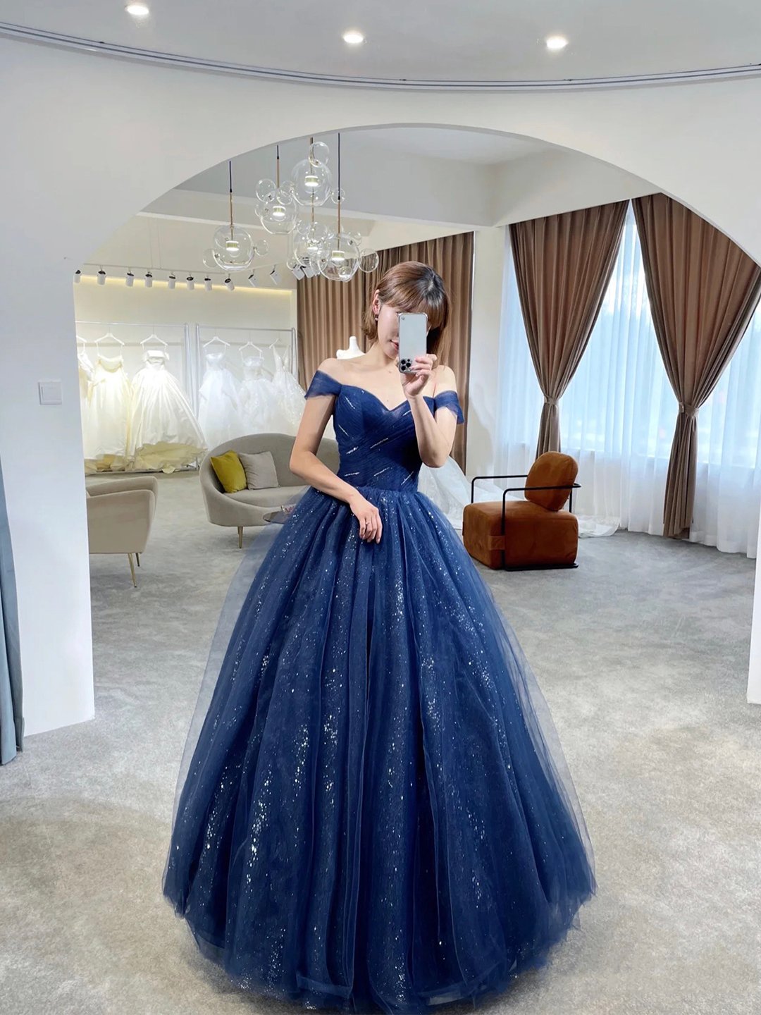 - Beautiful Navy Blue Tulle Off the Shoulder Formal Prom Dress -