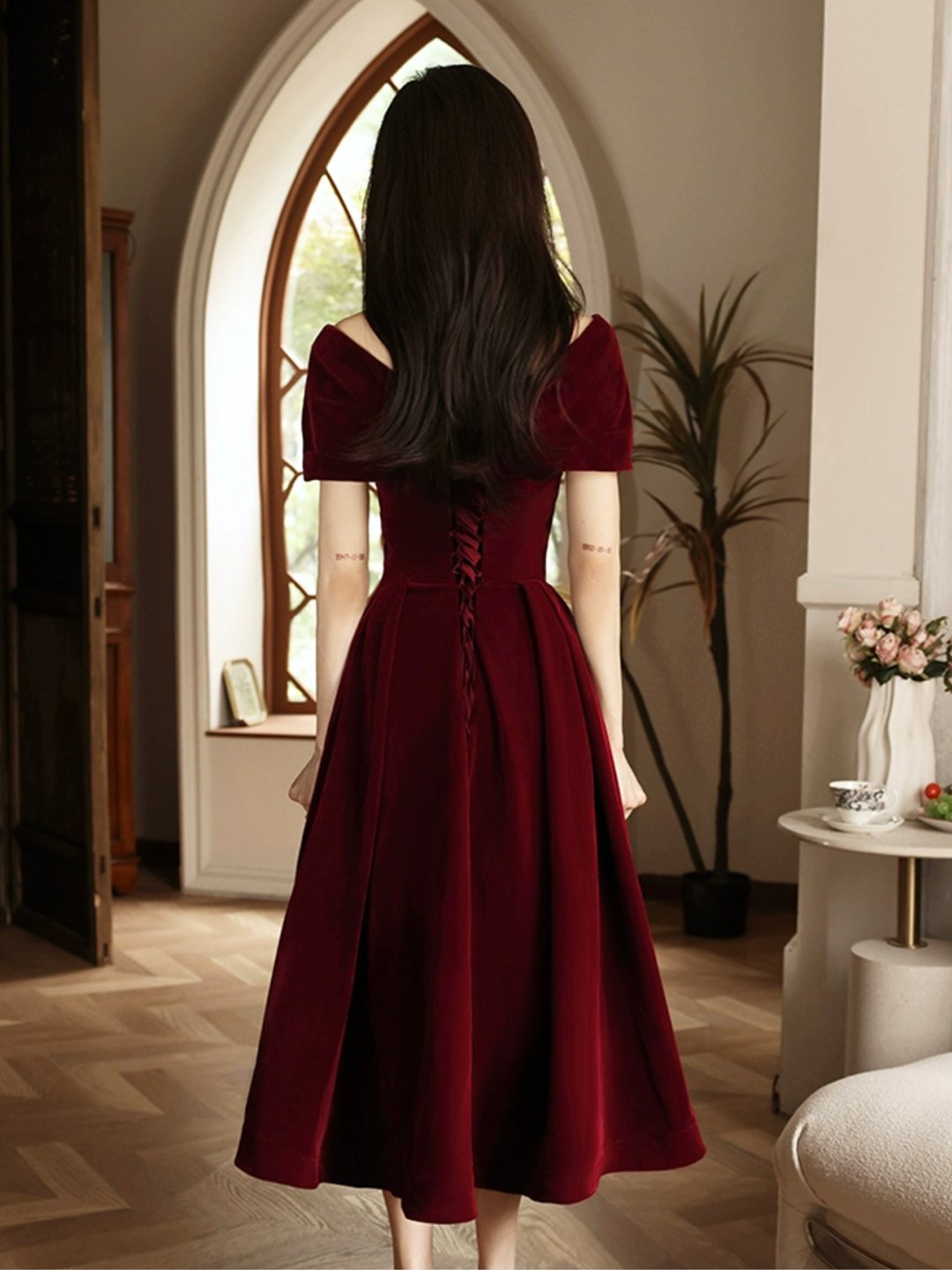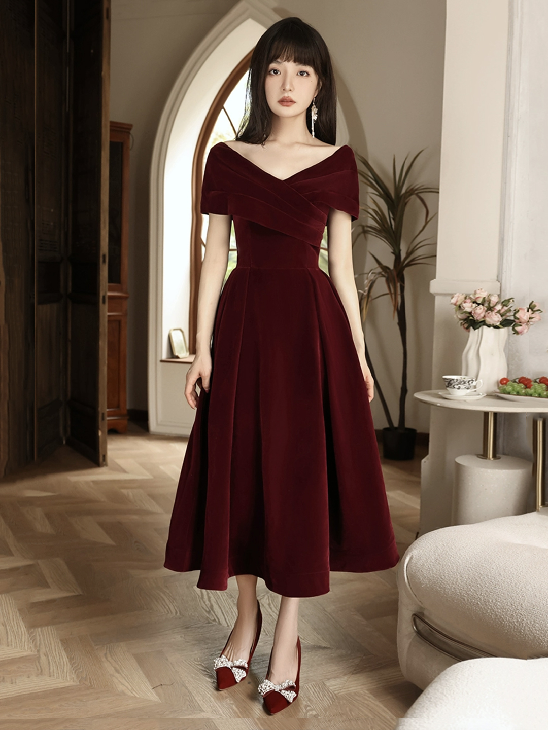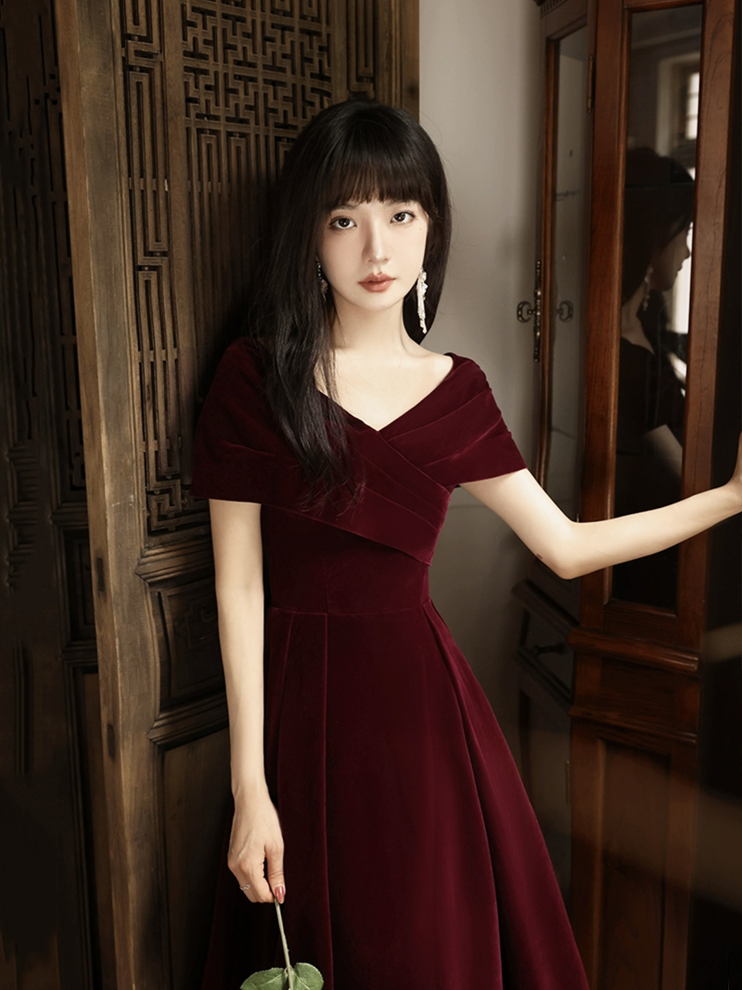- Burgundy Velvet V-Neck Short Prom Dress -