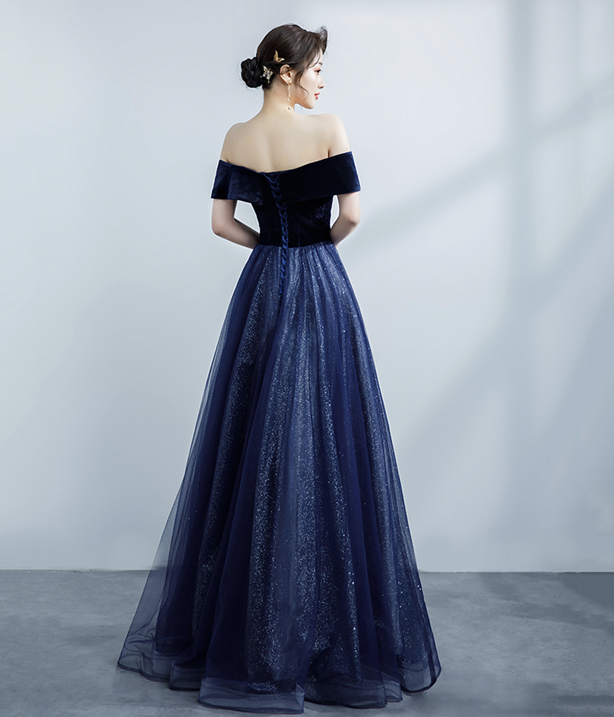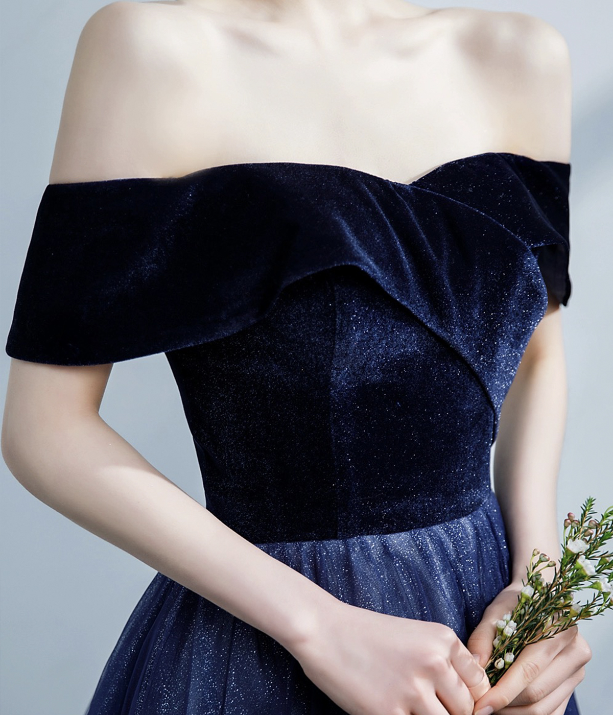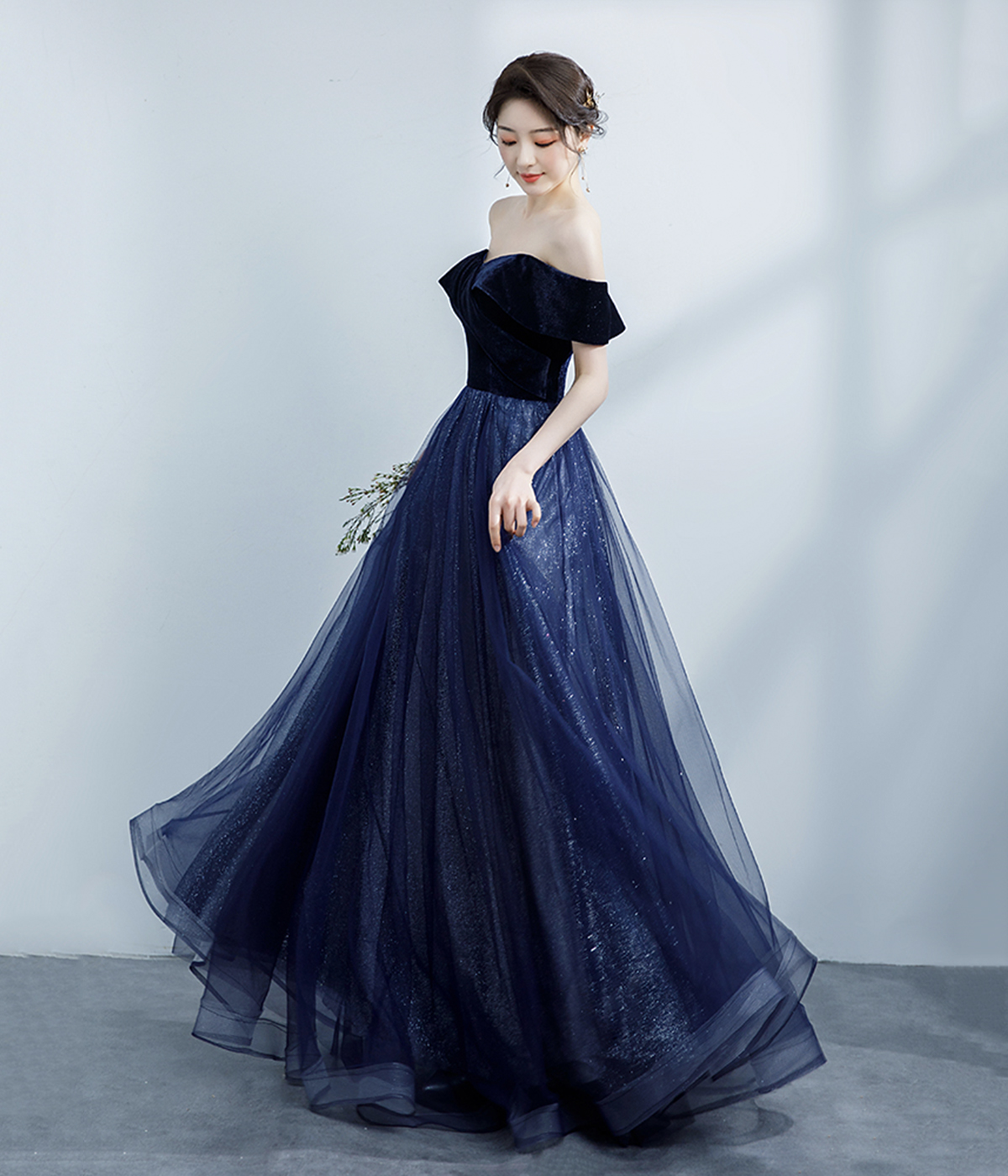 - Blue Velvet and Tulle Long Prom Dress, Off the Shoulder Evening Party Dress -