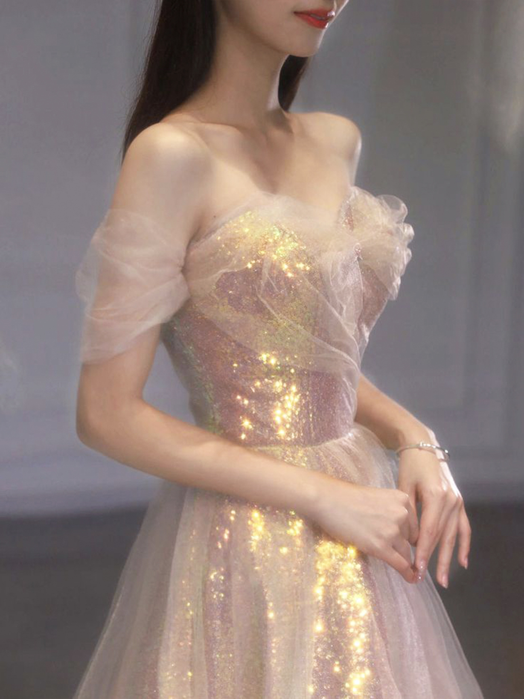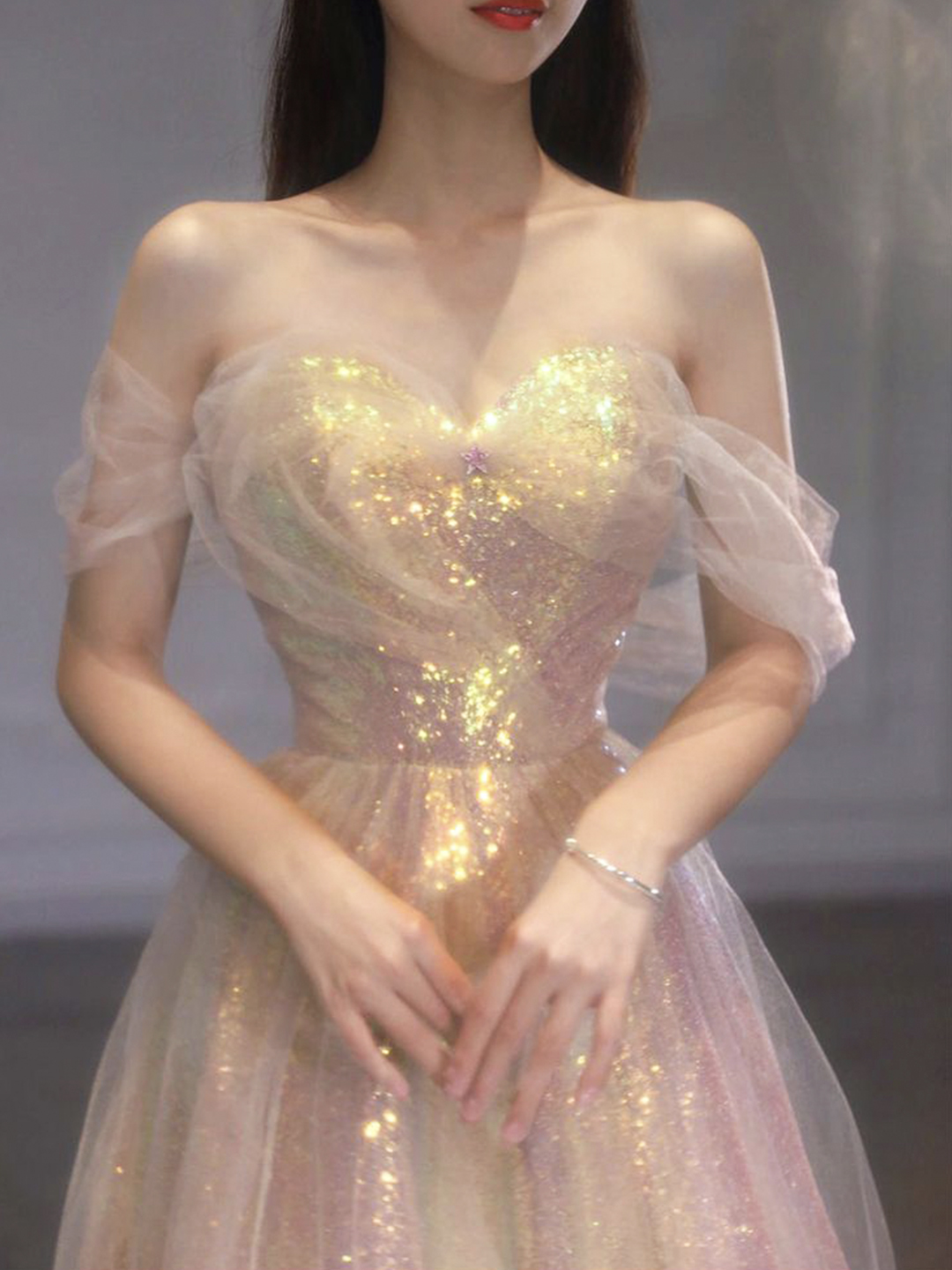 - Shiny Tulle Sequins Long Prom Dress, Off the Shoulder Evening Party Dress -