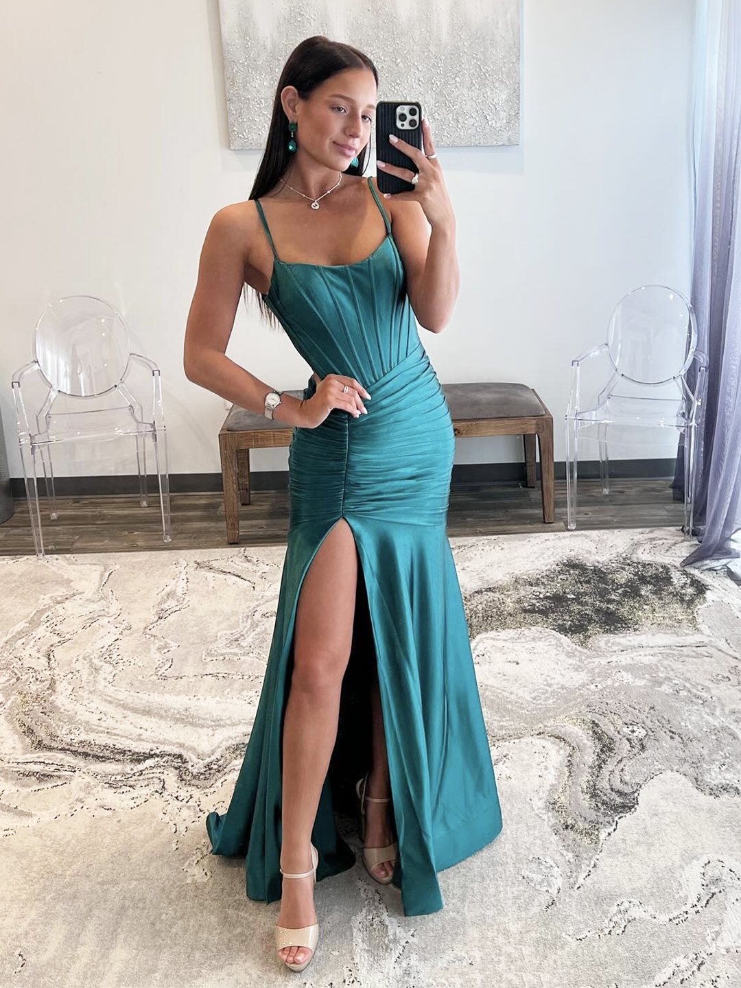 Green Satin Long Prom Dress, Mermaid Backless Evening Dress