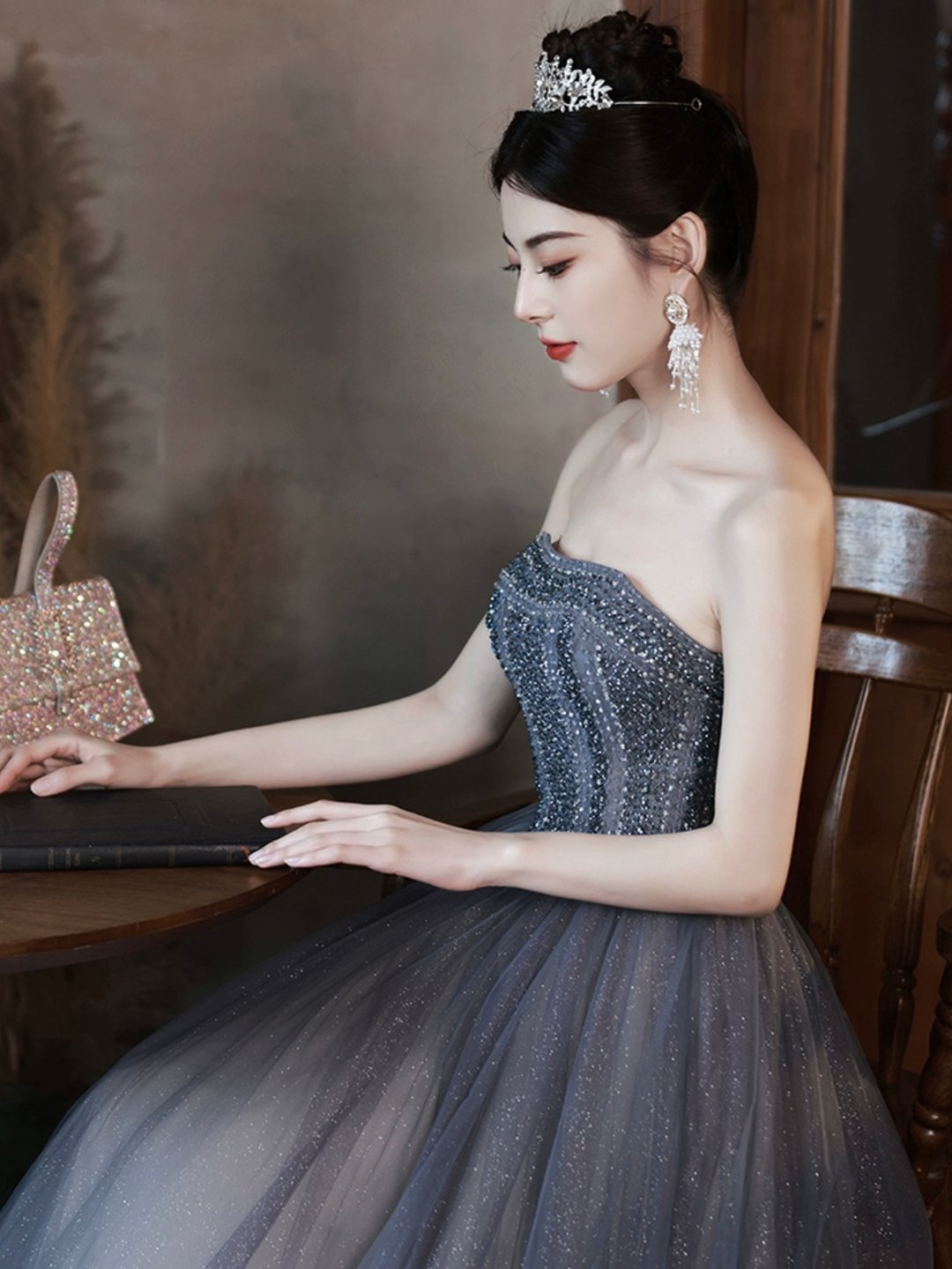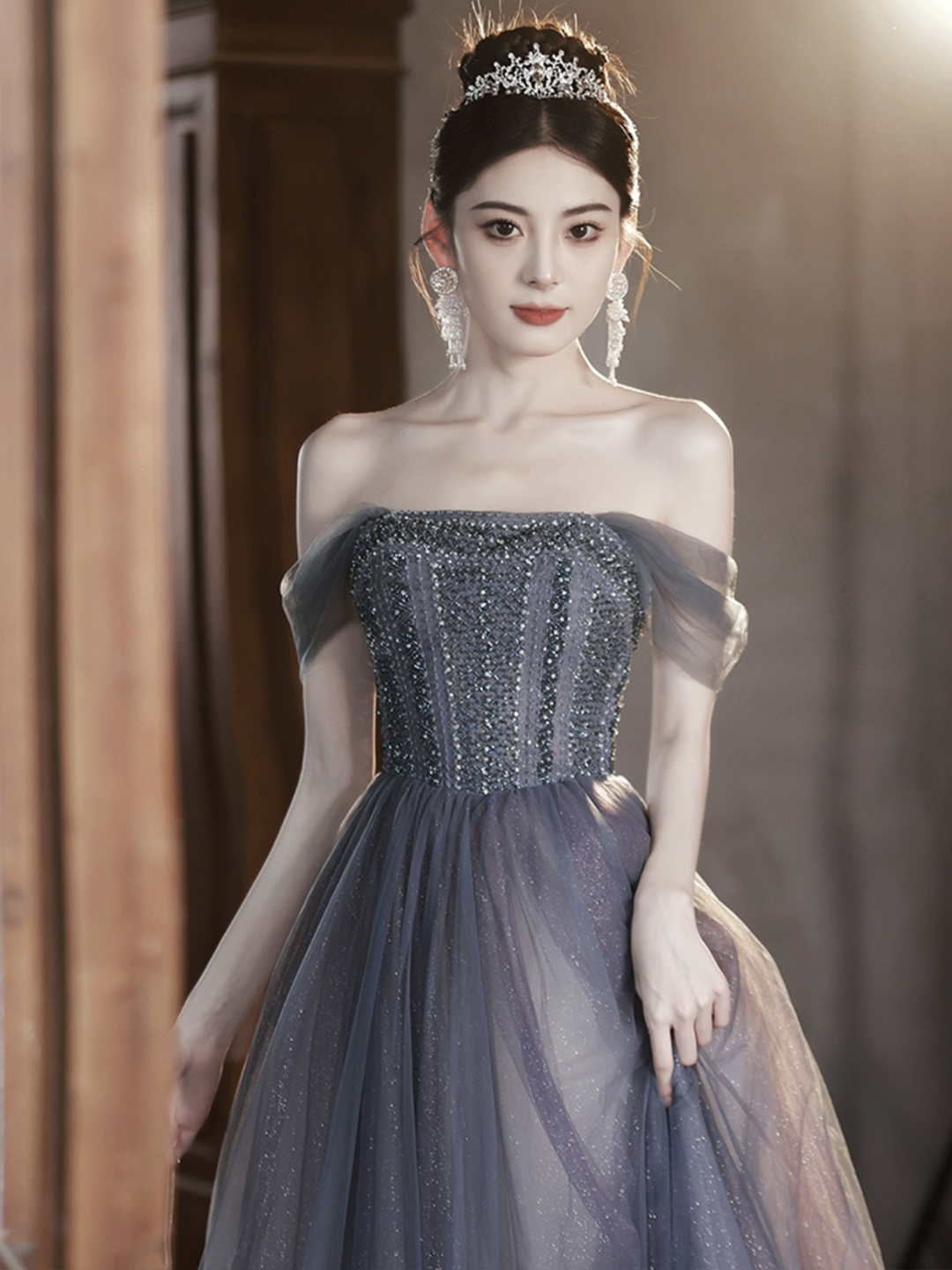 - Gray Tulle Beaded Long Prom Dress, Off the Shoulder Evening Party Dress -