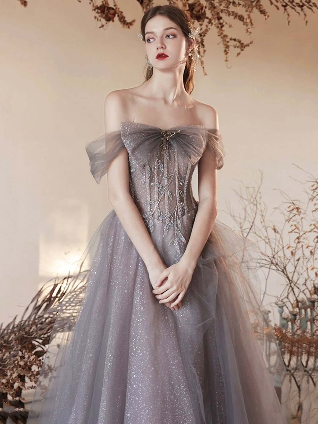 - Gray Tulle Beaded Long Off the Shoulder Prom Dress -