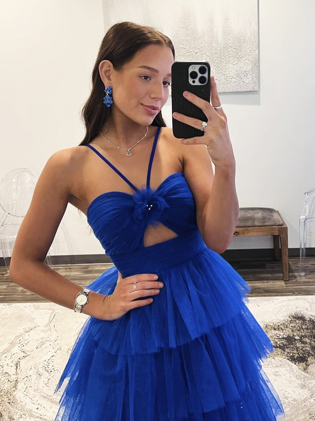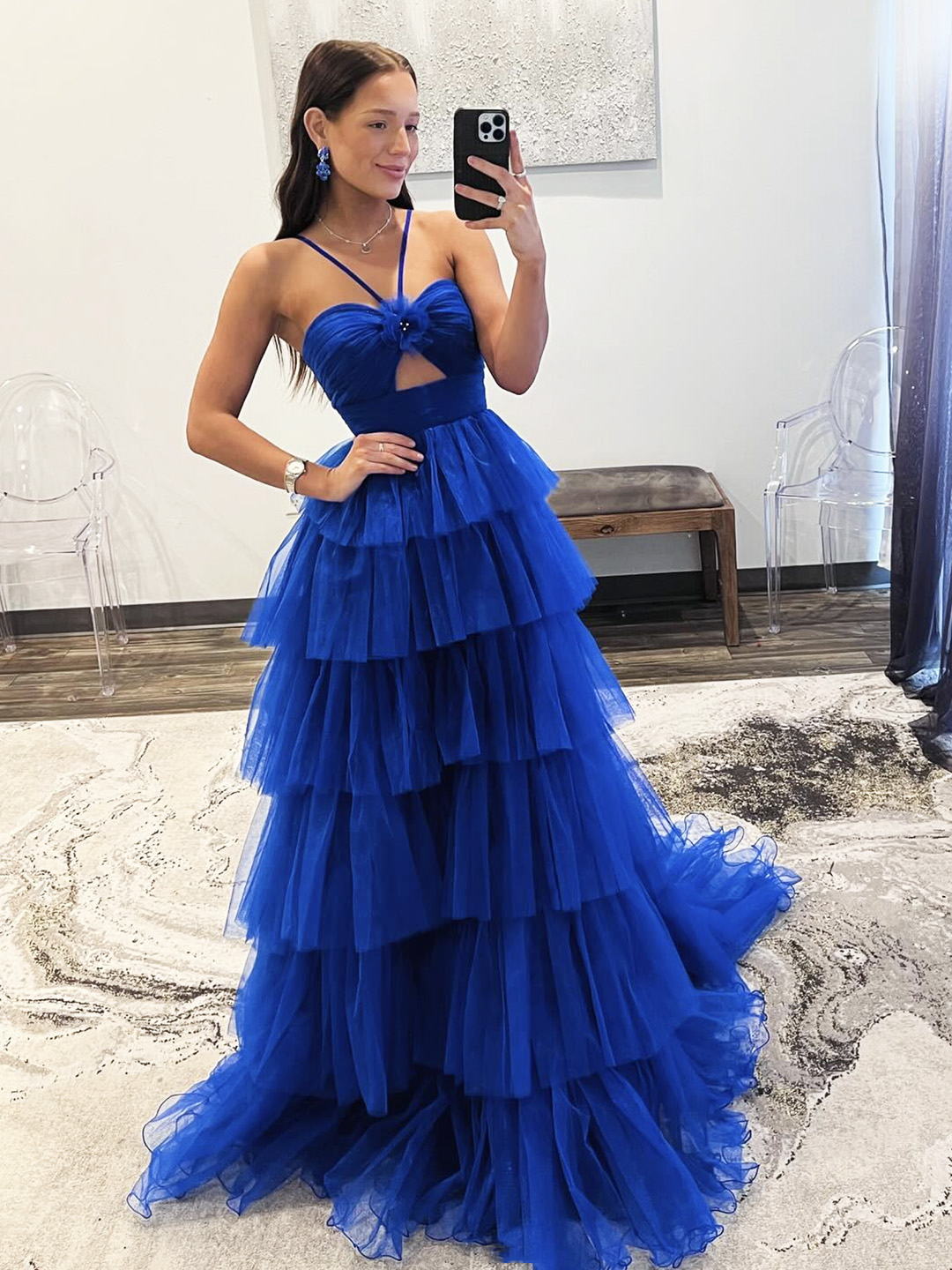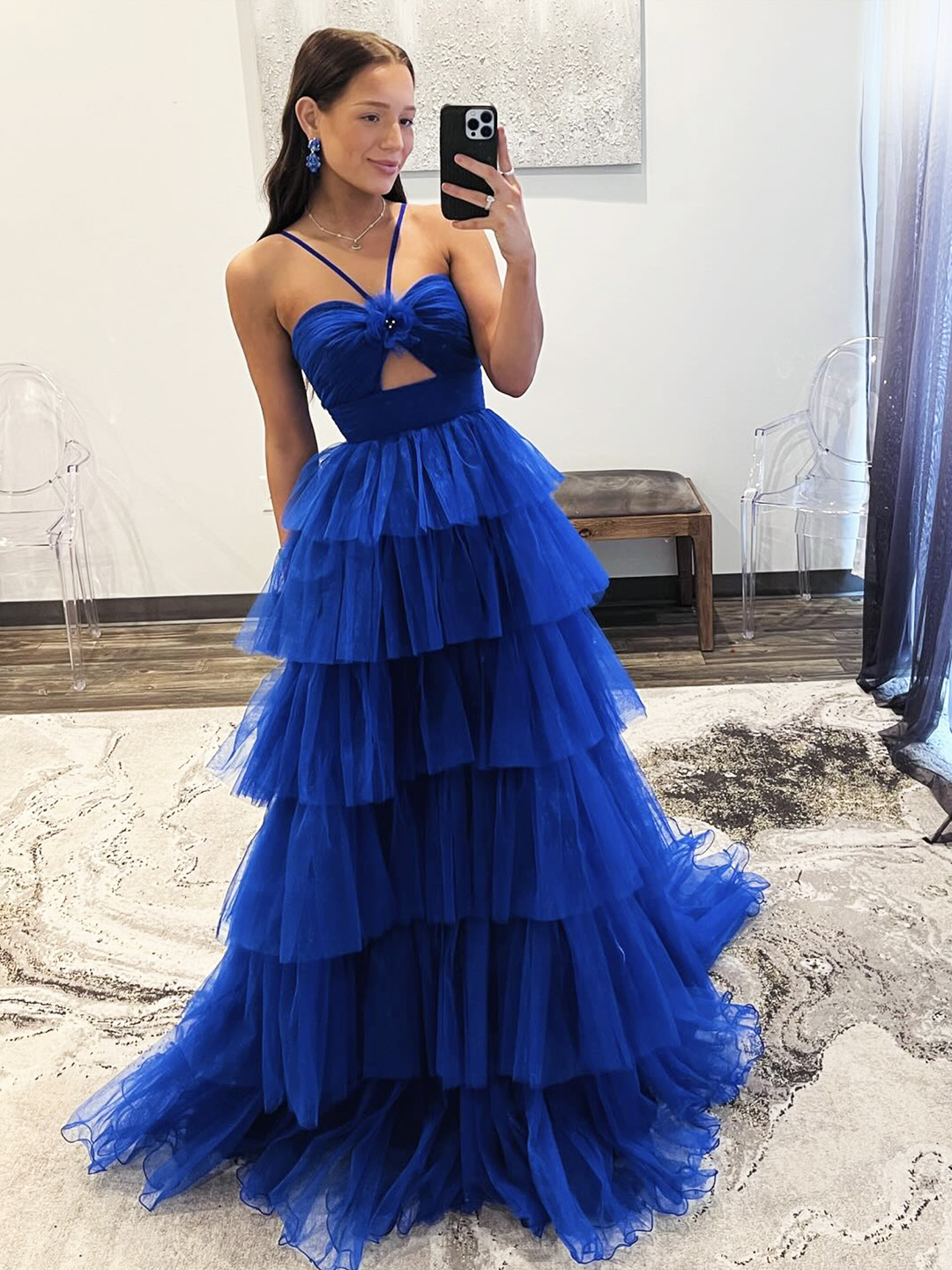 - Blue Tulle Layers Long Prom Dress, Beautiful A-Line Backless Evening Party Dress -