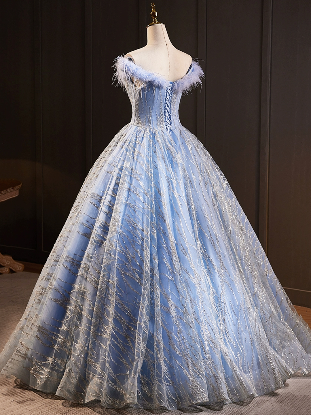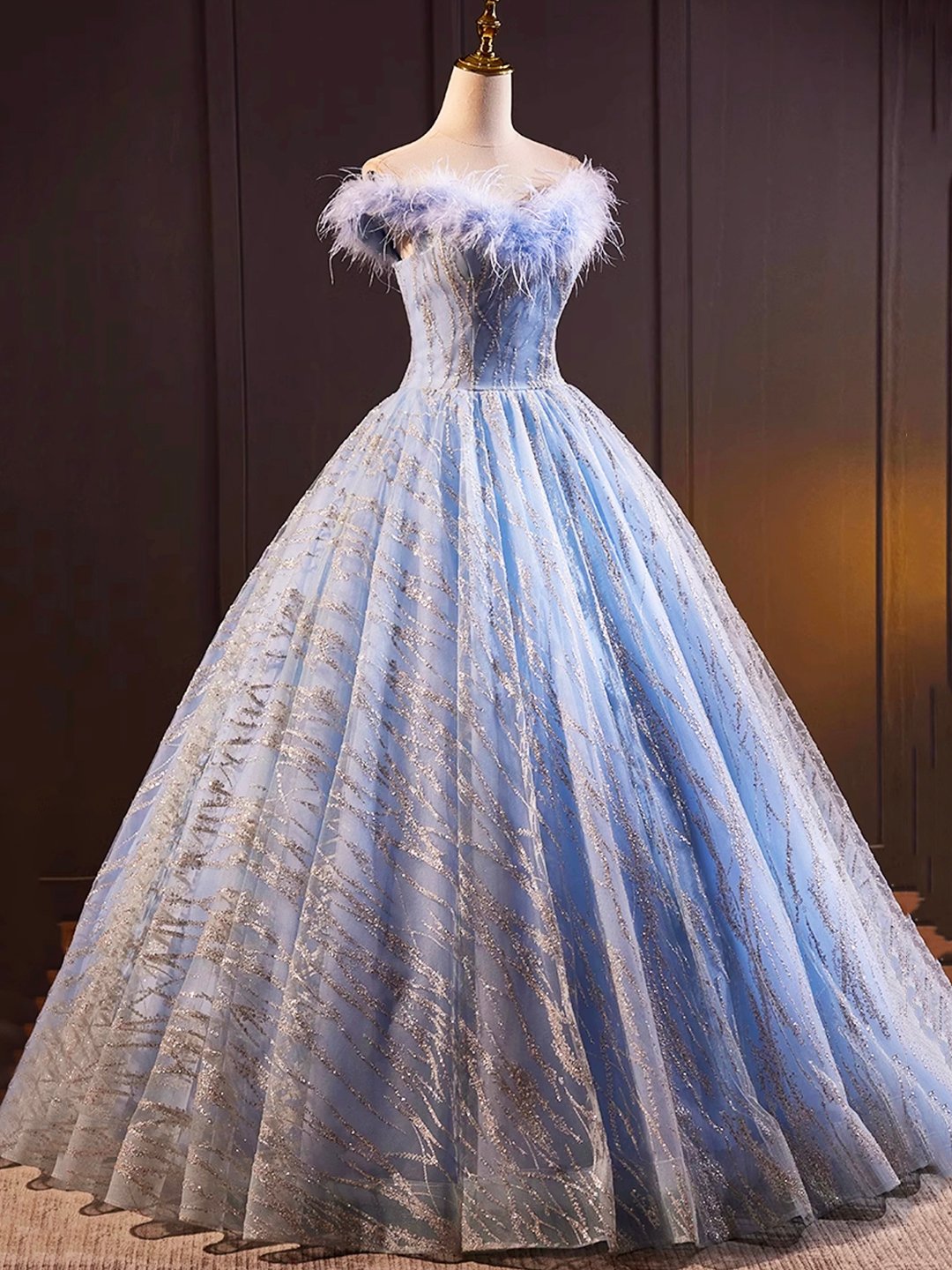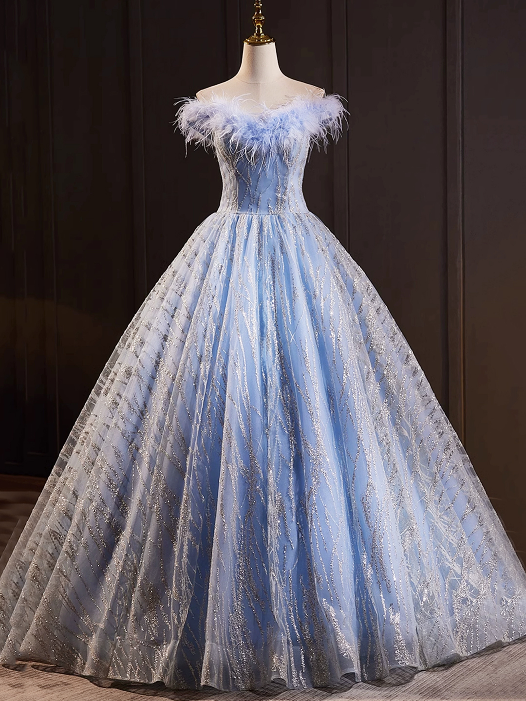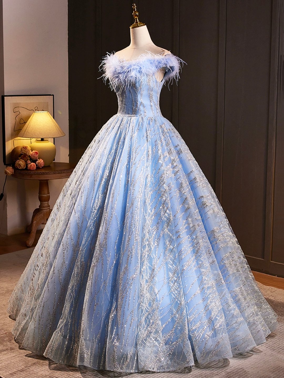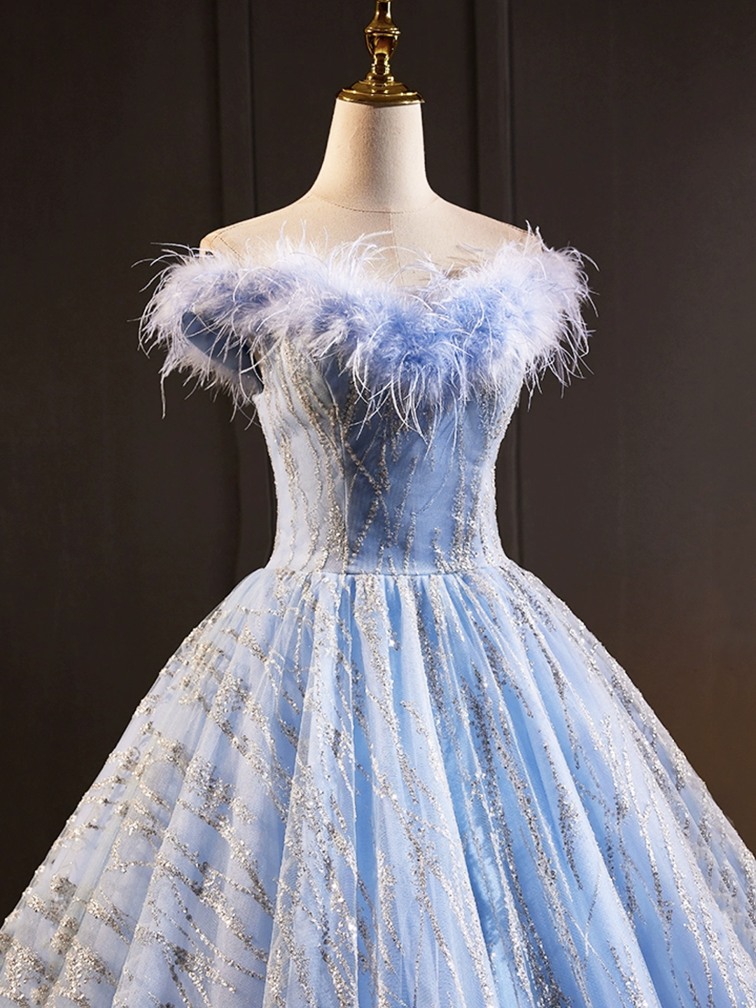 - Blue Tulle Sequins Long Prom Dresses, A-Line Evening Dresses with Feather -