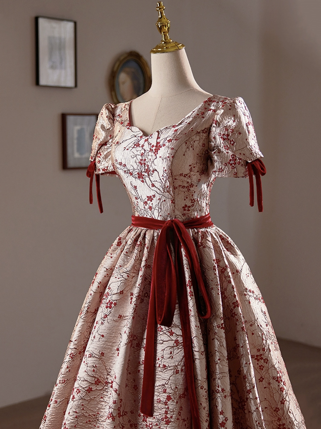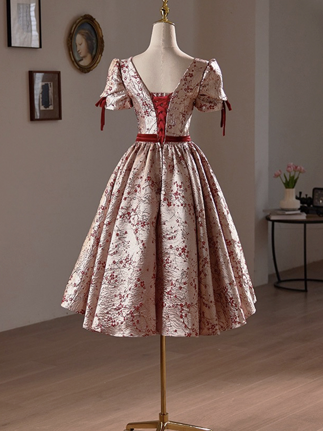 - A-Line Floral Satin Short Sleeve Knee Length Prom Dress -