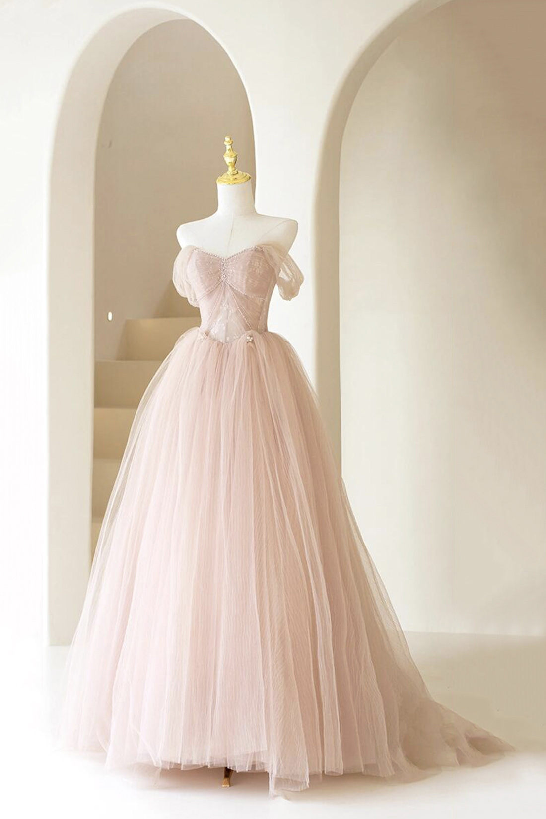 - Pink Tulle Lace Long A-Line Prom Dress -