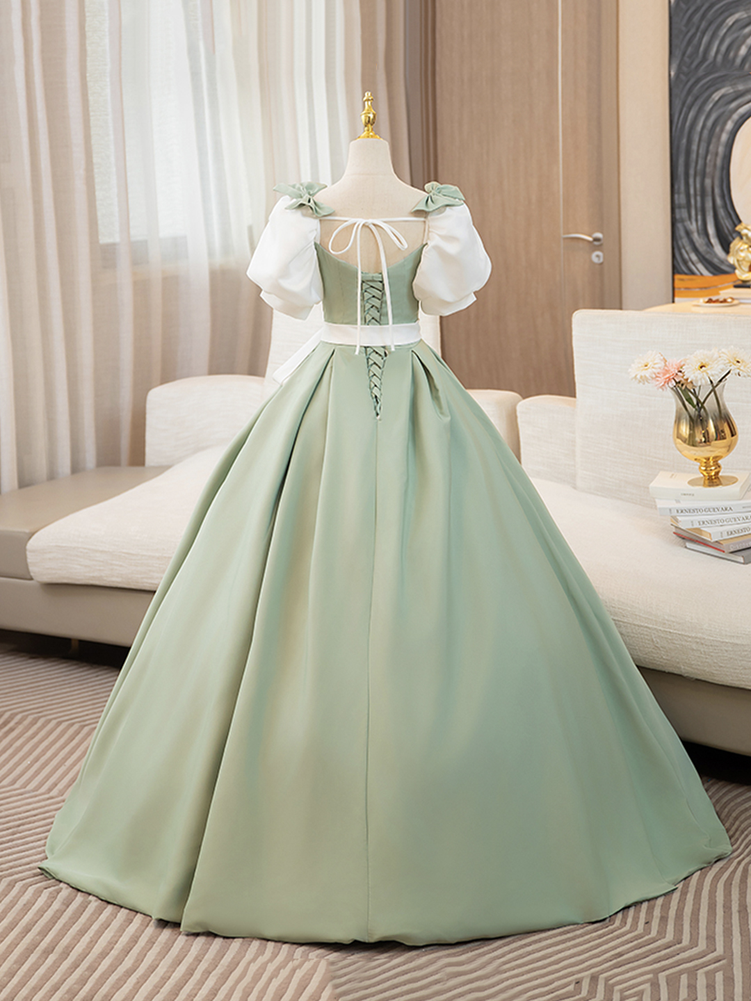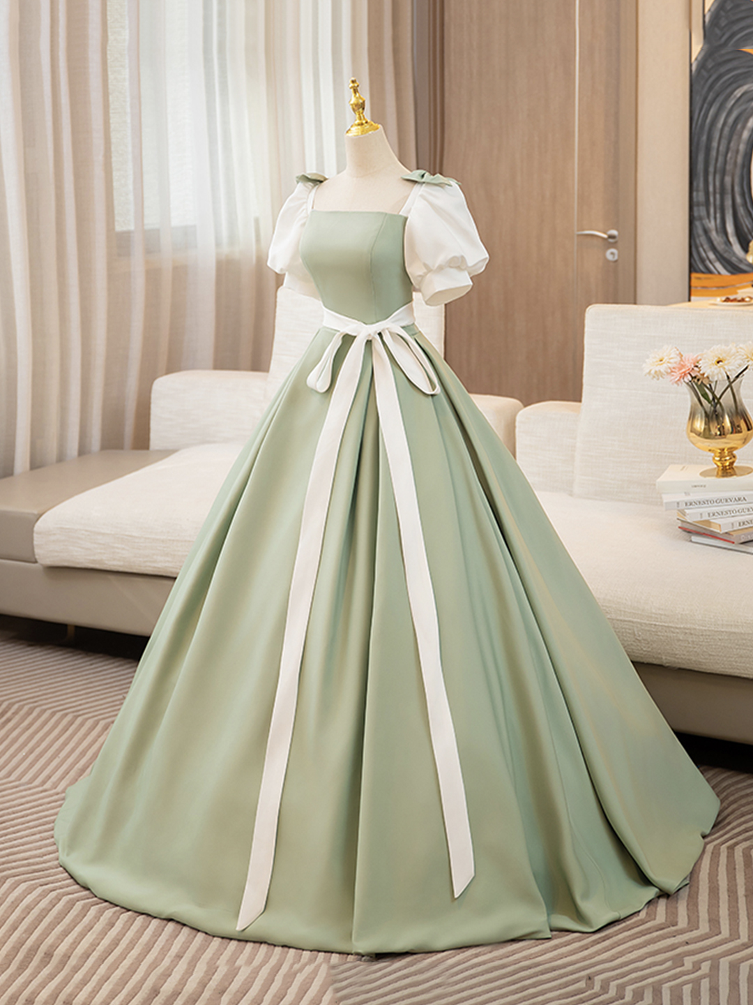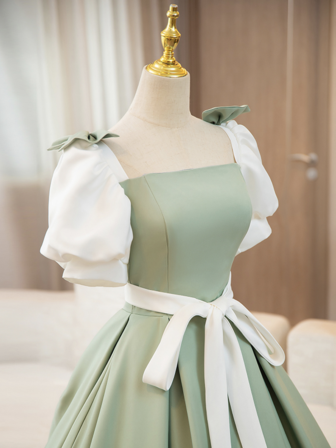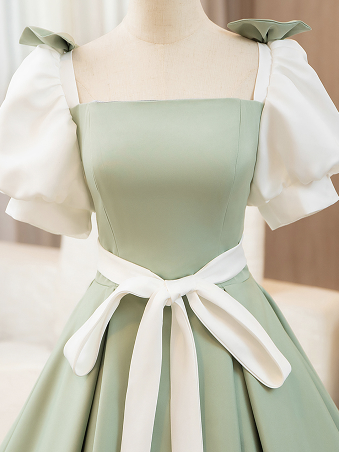 A-line White and Green Floor Length Prom Dress