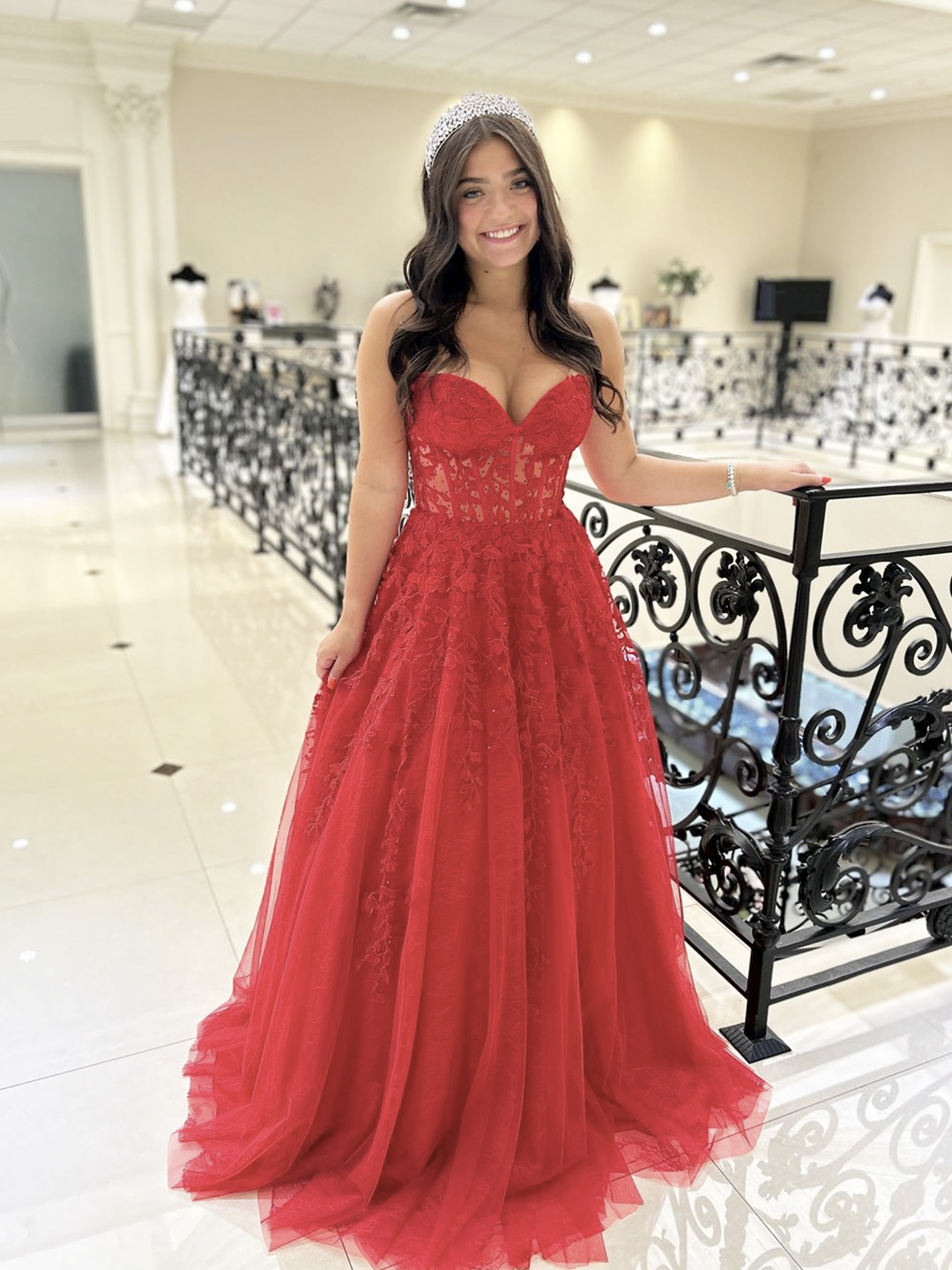- Red Tulle Lace Floor Length Prom Dress -