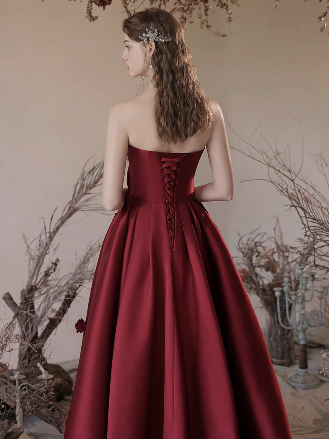- Burgundy Strapless Satin Floor Length Prom Dress -