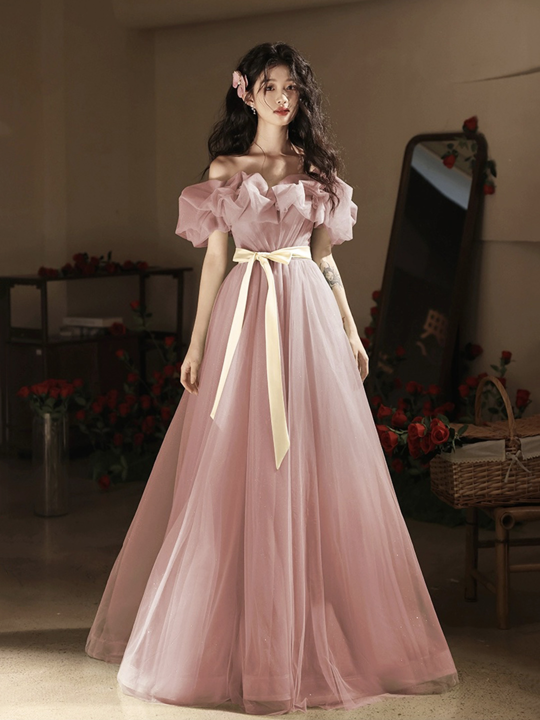 - Pink Tulle Floor Length Prom Dress, Off the Shoulder Evening Party Dress -