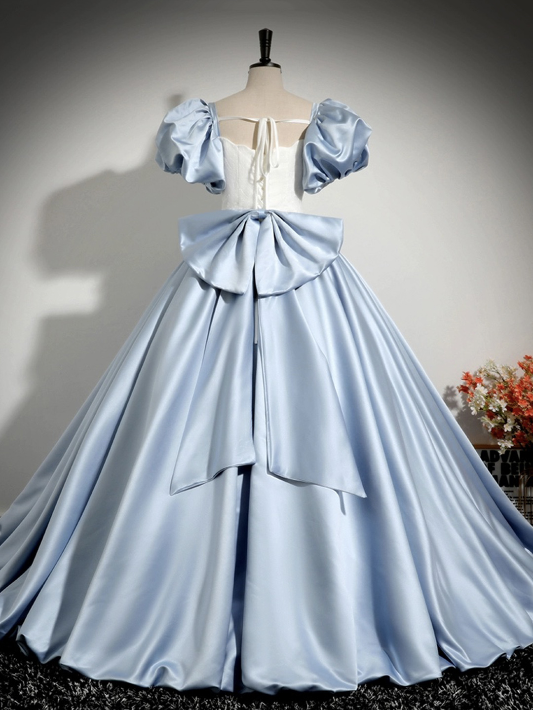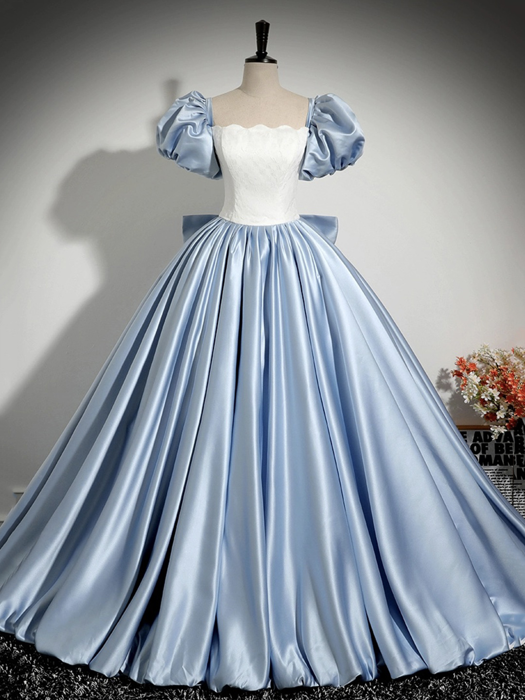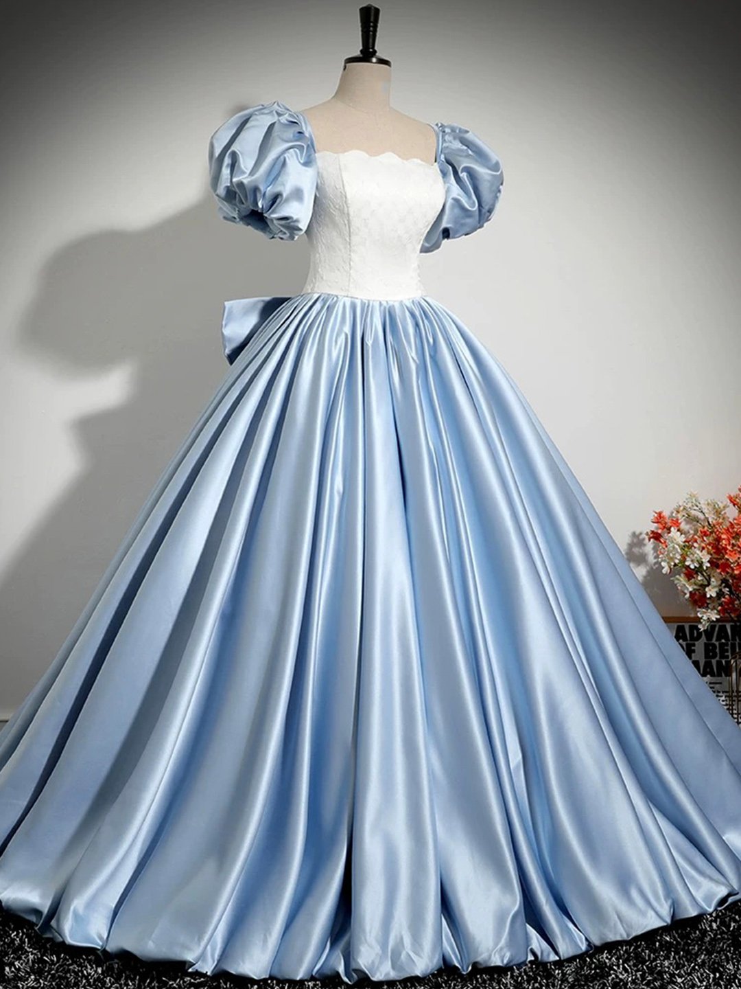- White and Blue Satin Long Prom Dress, Elegant A-Line Short Sleeve Evening Dress -