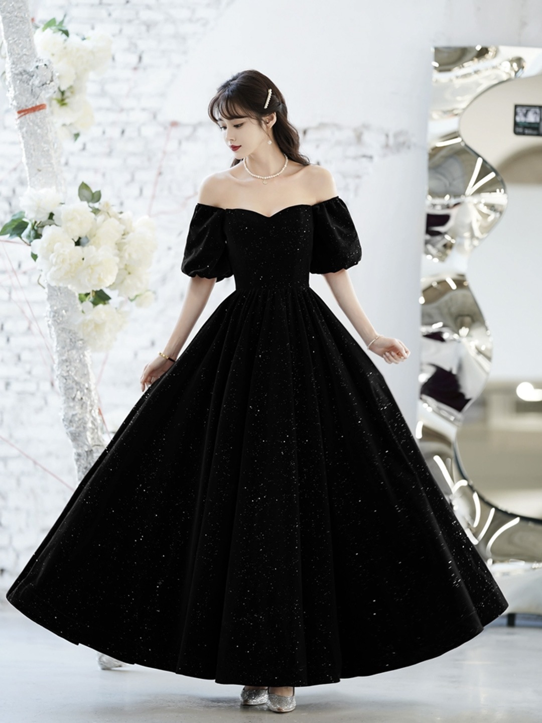 - Black Velvet Long Prom Dress, A-Line Short Sleeve Evening Party Dress -