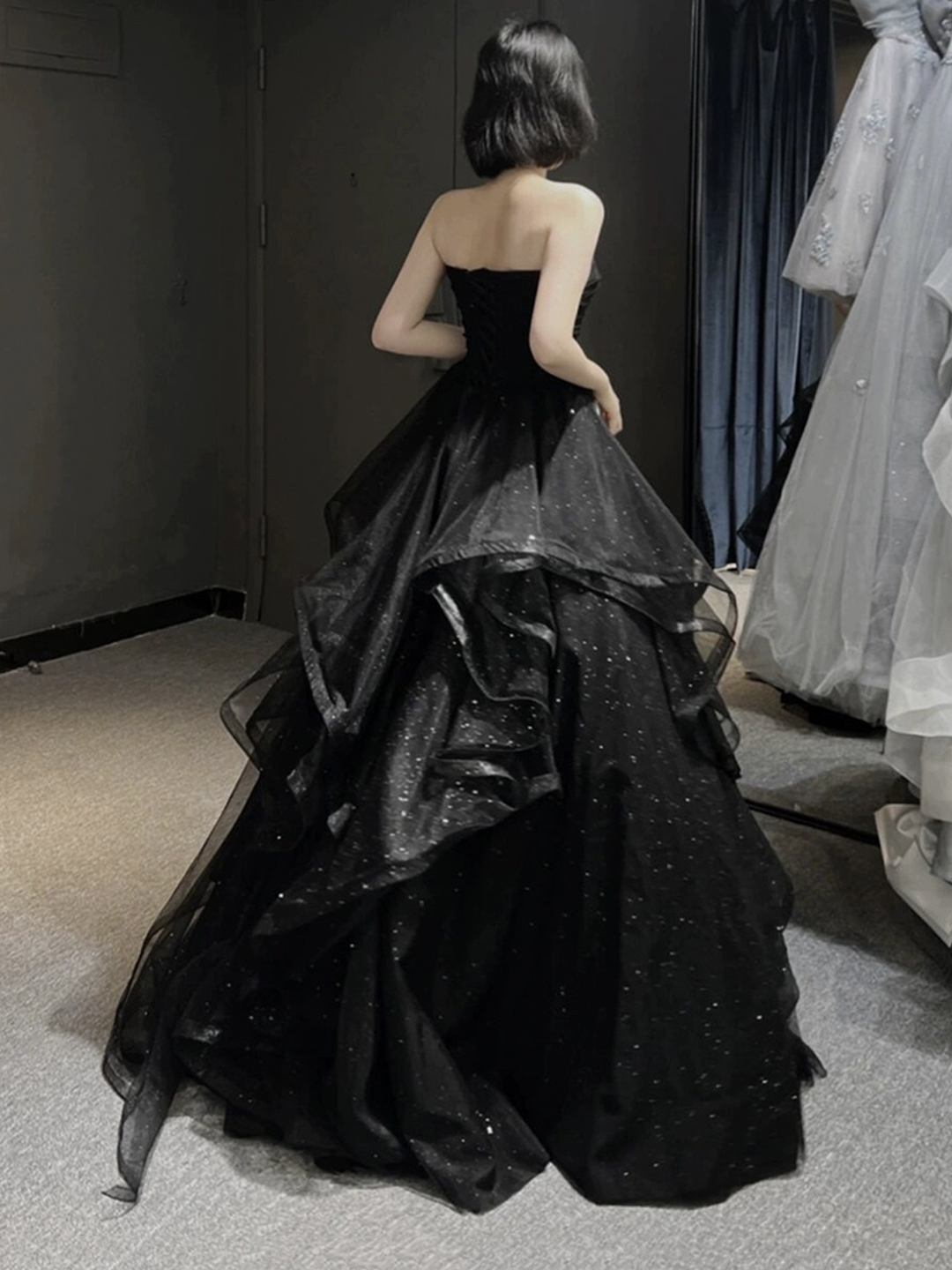 - Black Strapless Tulle Long A-Line Ball Gown, Black Evening Party Dress -