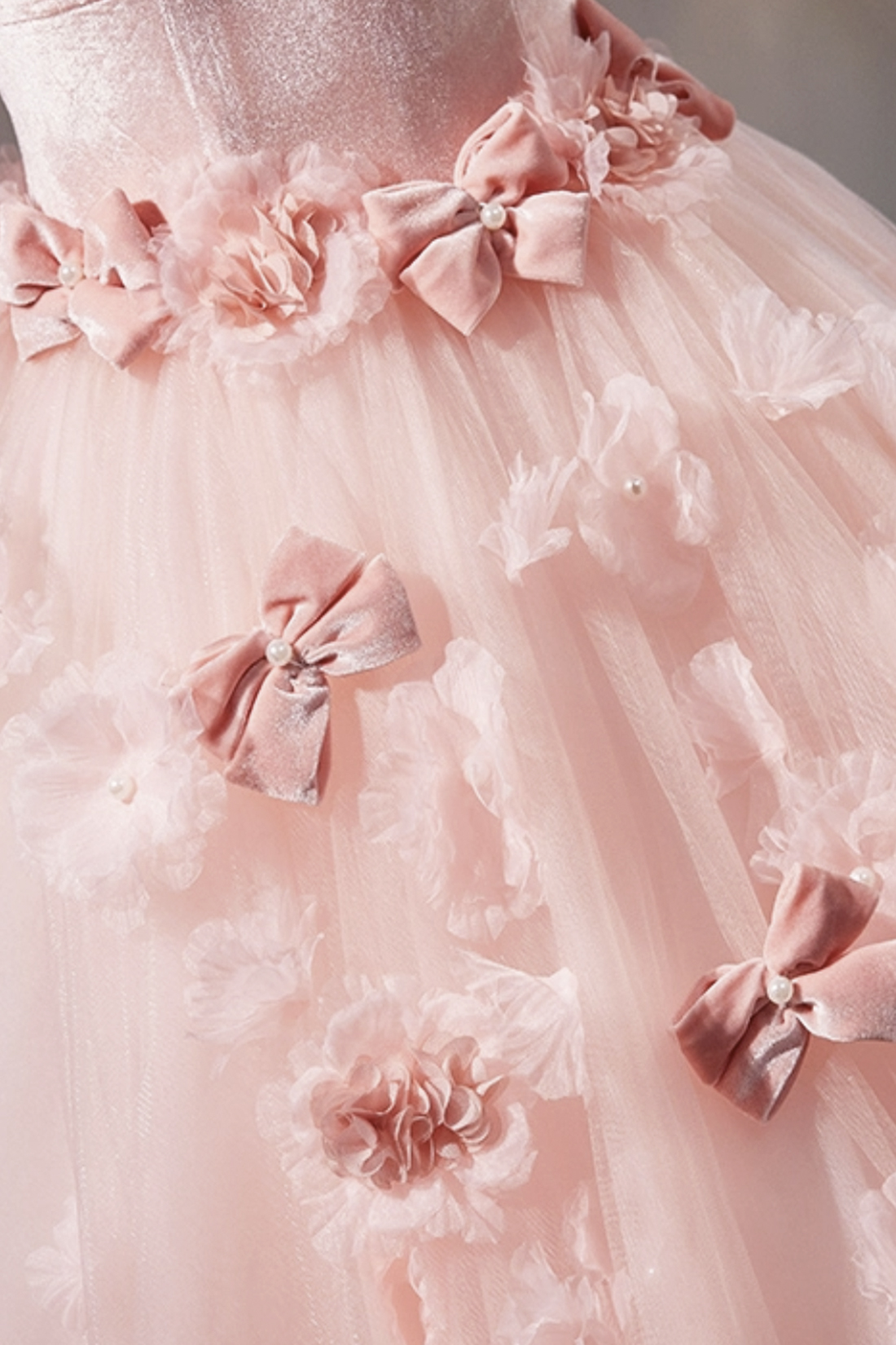 Pink Velvet Tulle A-Line Prom Dress with Flowers, Lovely Strapless Evening Sweet 16 Dress