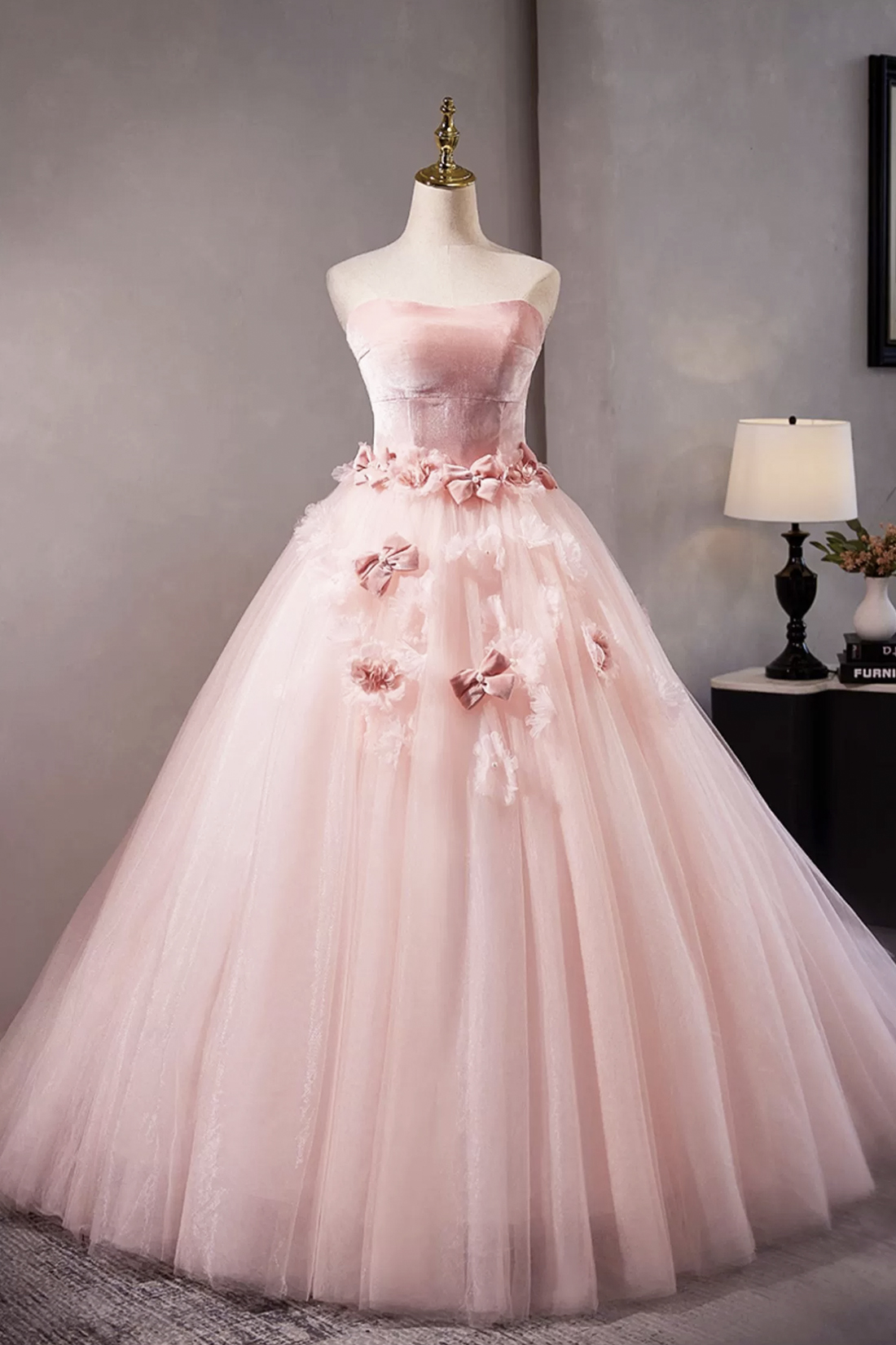 - Pink Velvet Tulle A-Line Prom Dress with Flowers, Lovely Strapless Evening Sweet 16 Dress -
