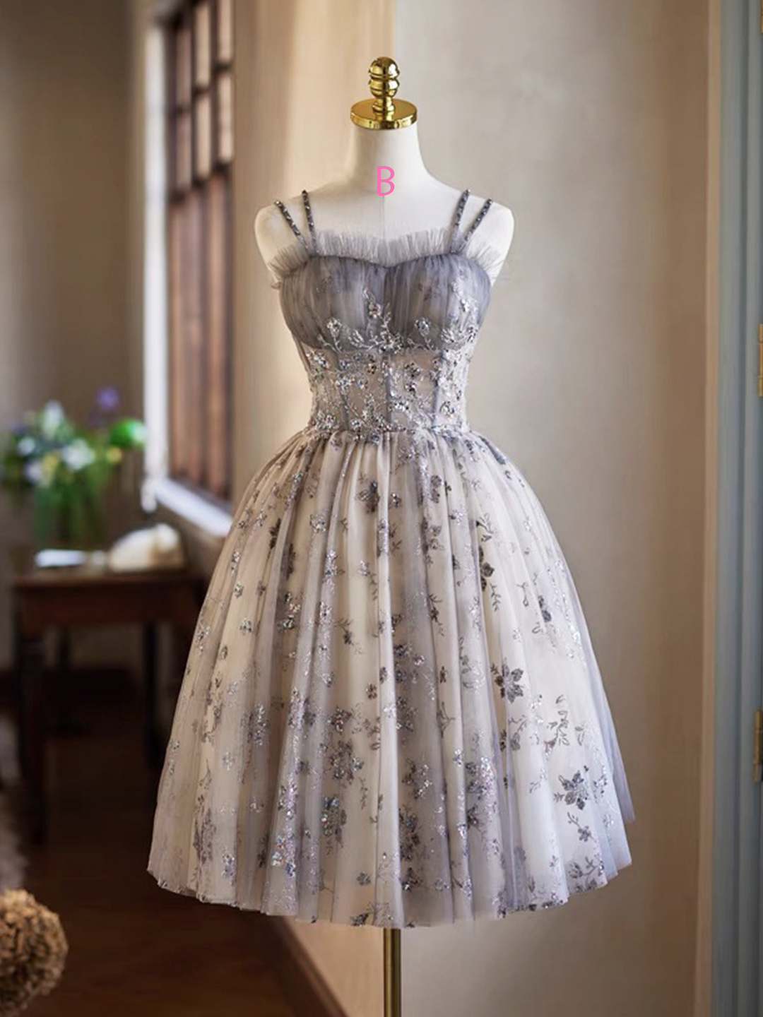 - Lovely Tulle Sequins Short Prom Dress, A-Line Spaghetti Strap Evening Party Dress -