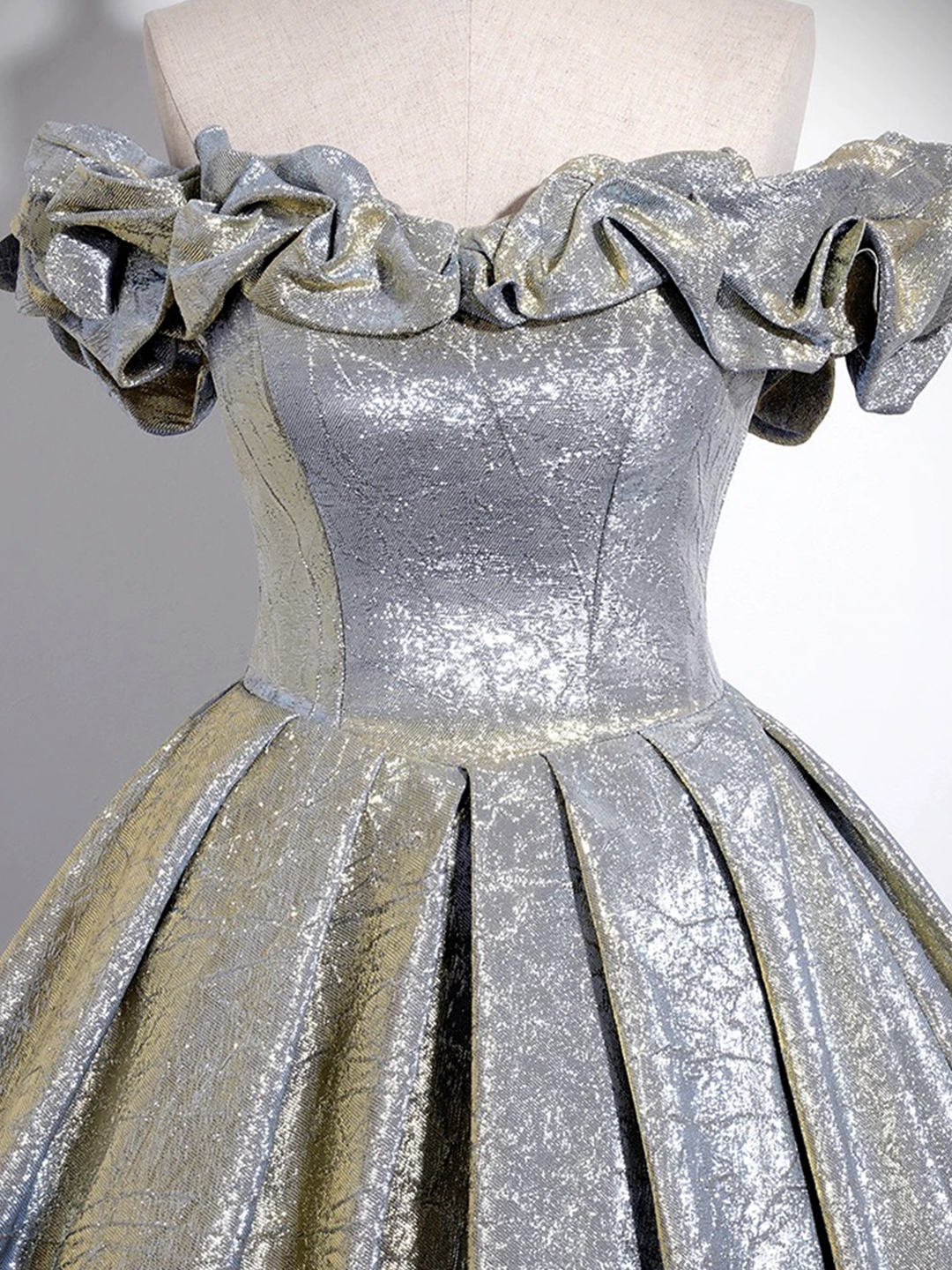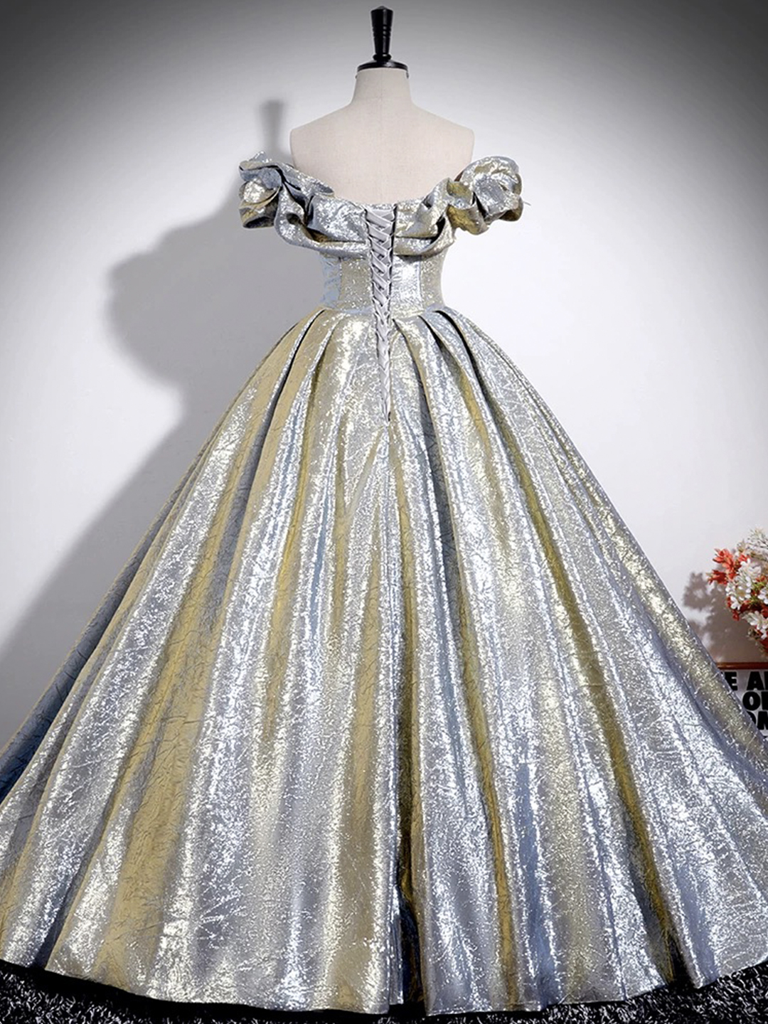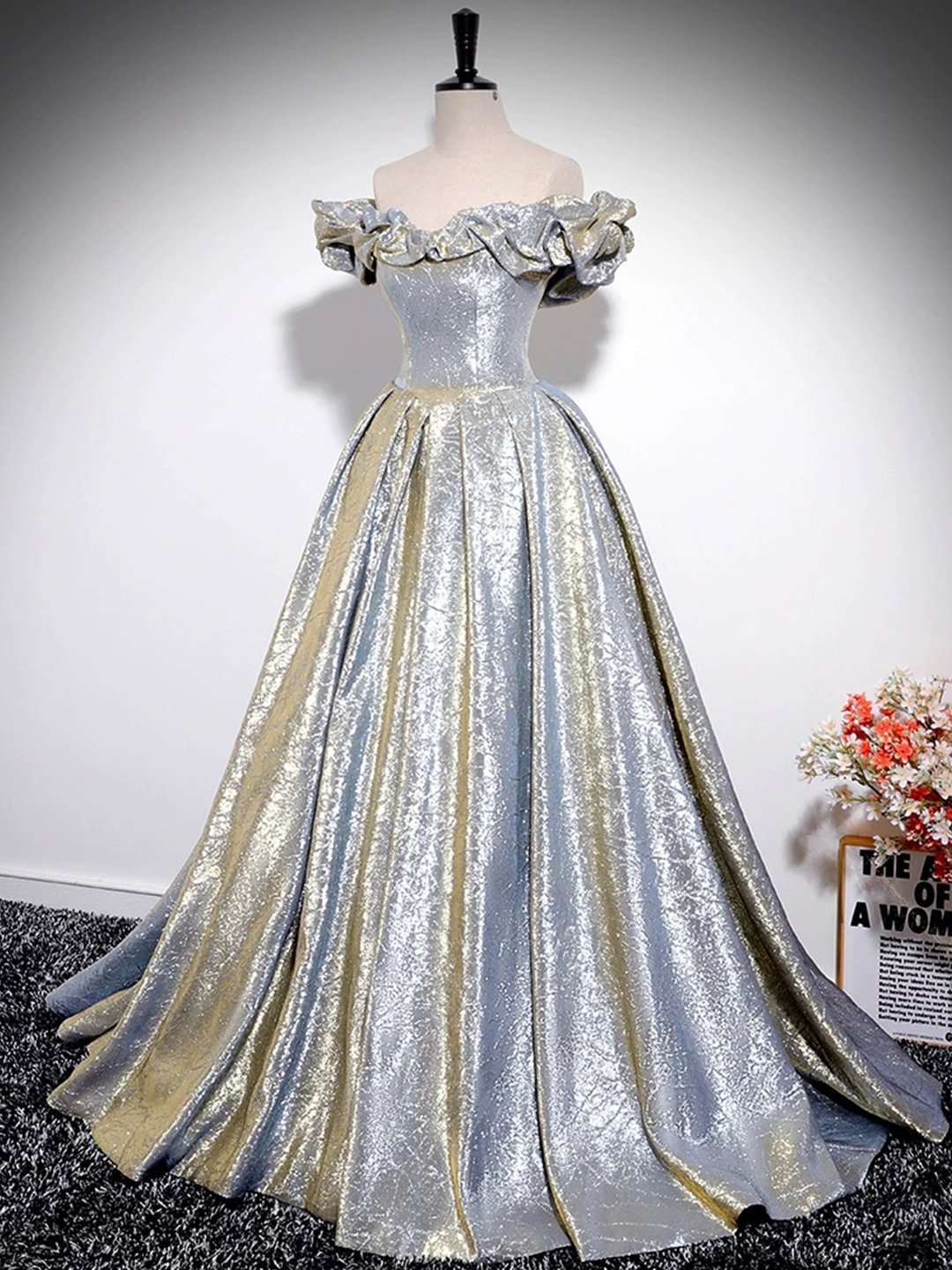 - Gold Silver Glitter Satin Long Prom Dress, A-Line Off the Shoulder Evening Party Dress -
