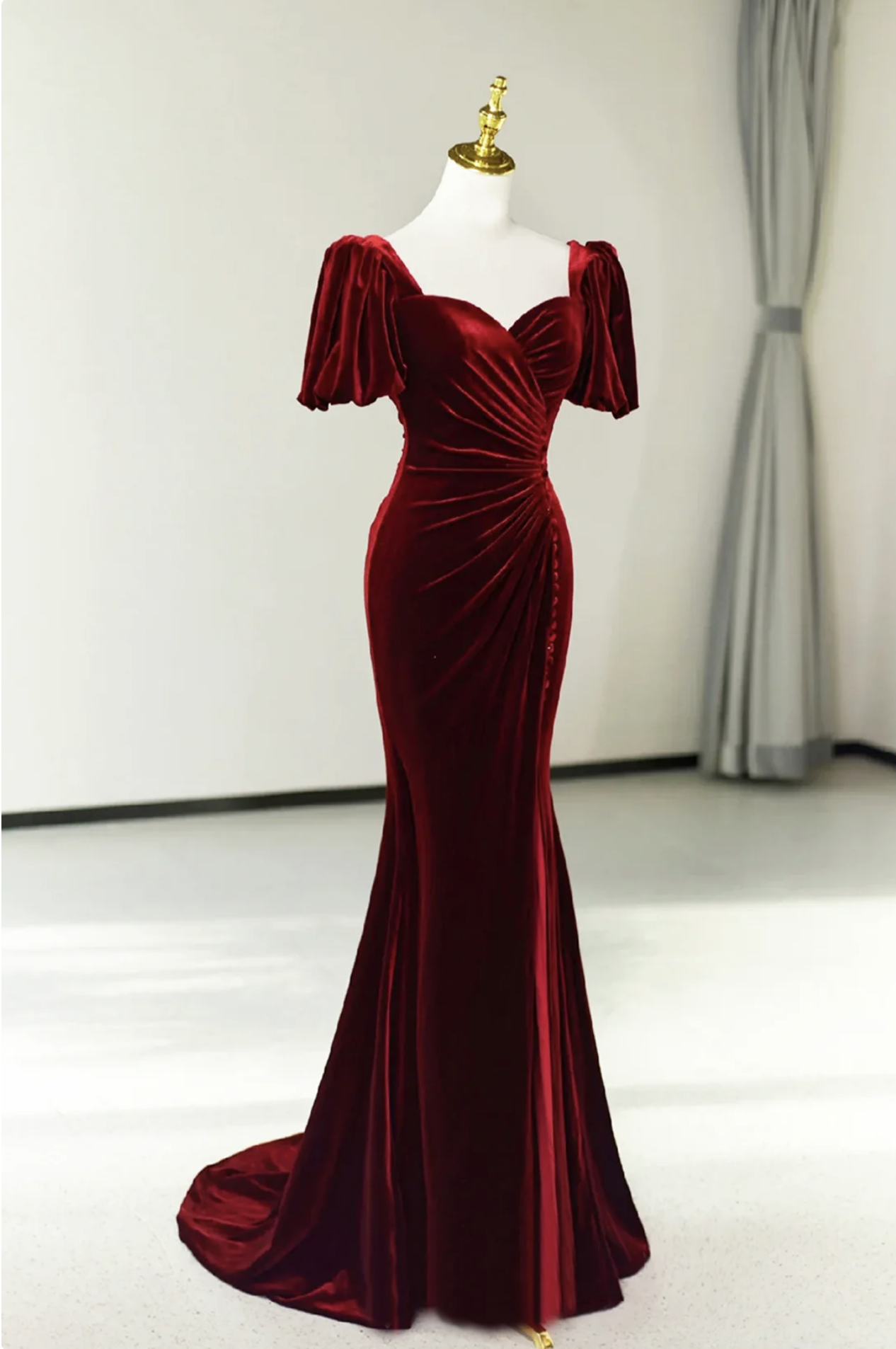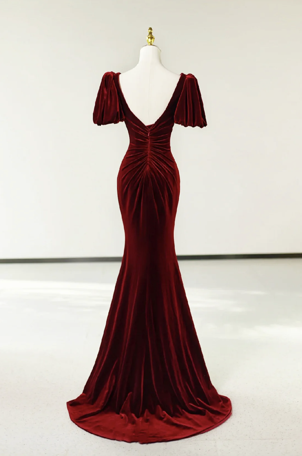 - Burgundy Velvet Long Prom Dress, Mermaid Short Sleeve Evening Party Dress -