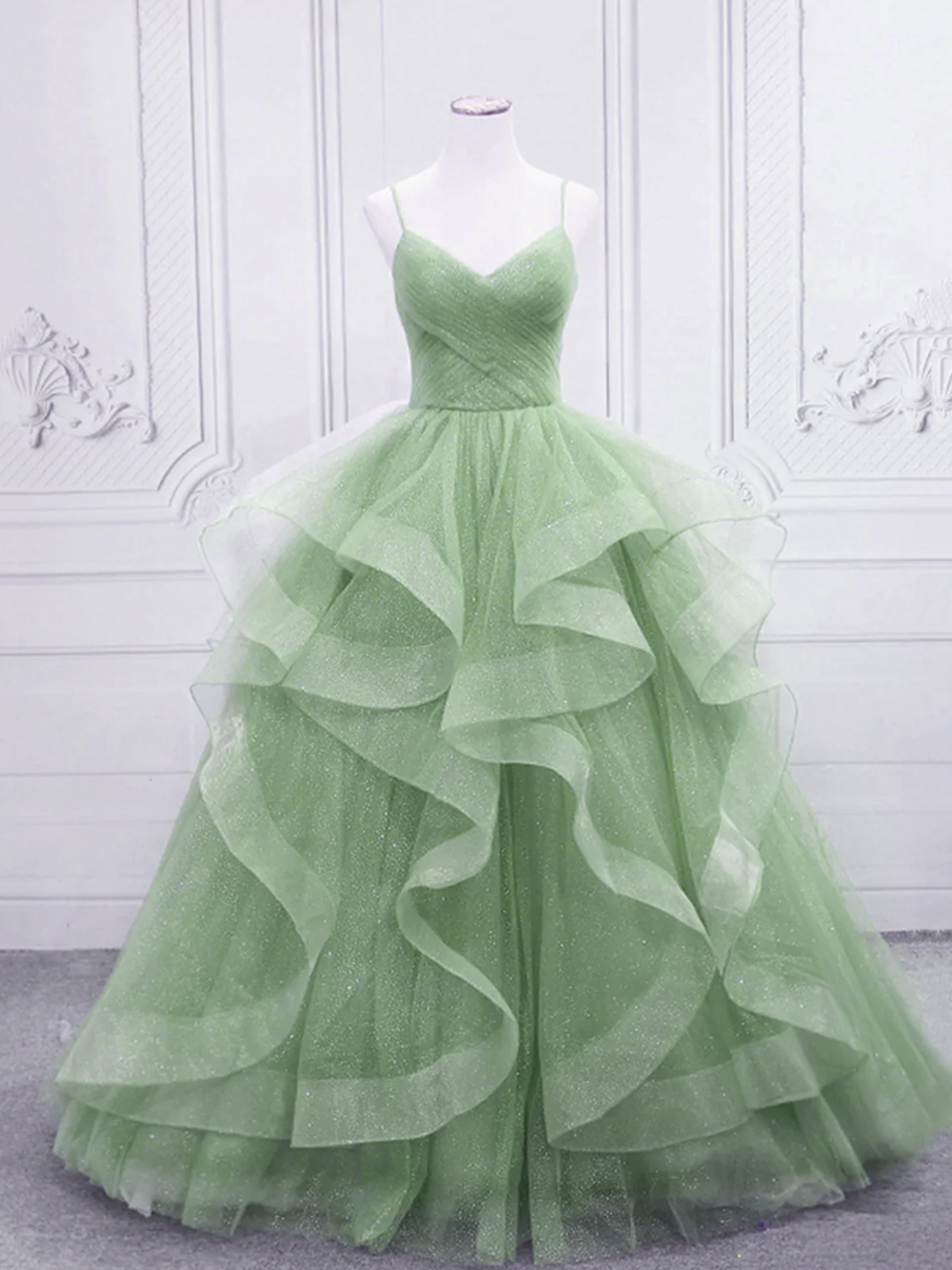 - Green Layers Tulle Floor Length Prom Dress, A-Line Spaghetti Strap Party Dress -