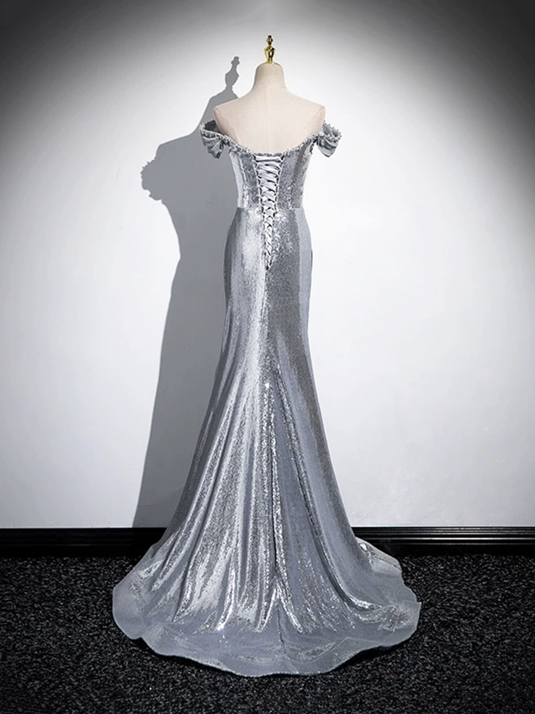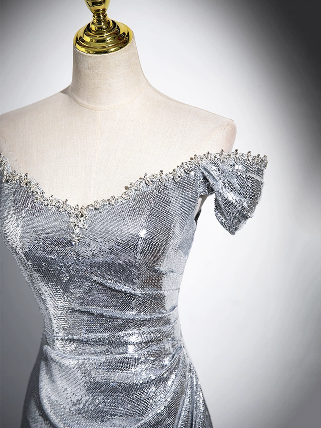 - Silver Sequins Long Prom Dress, Mermaid Off the Shoulder Evening Dress -