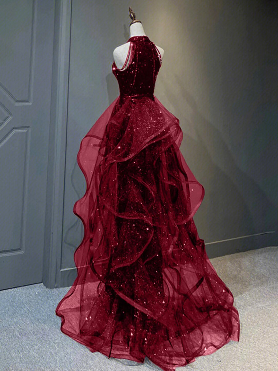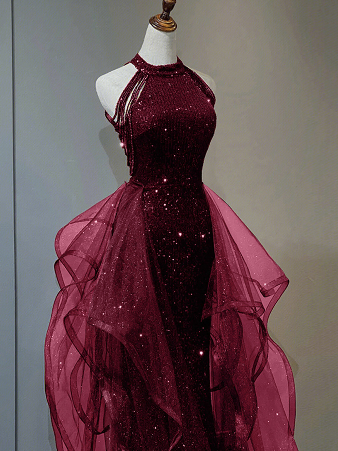 - Burgundy Tulle Sequins Long A-Line Halter Prom Party Dress -