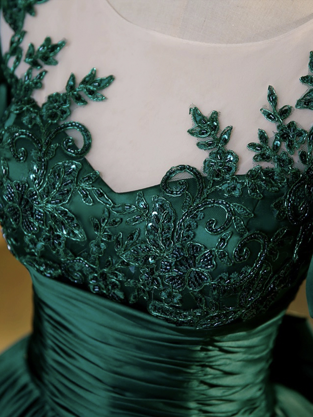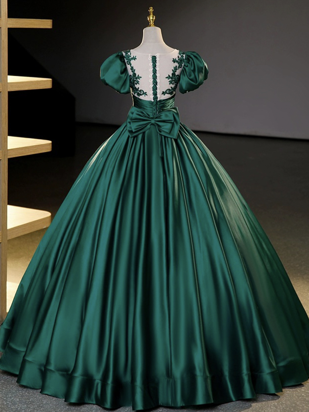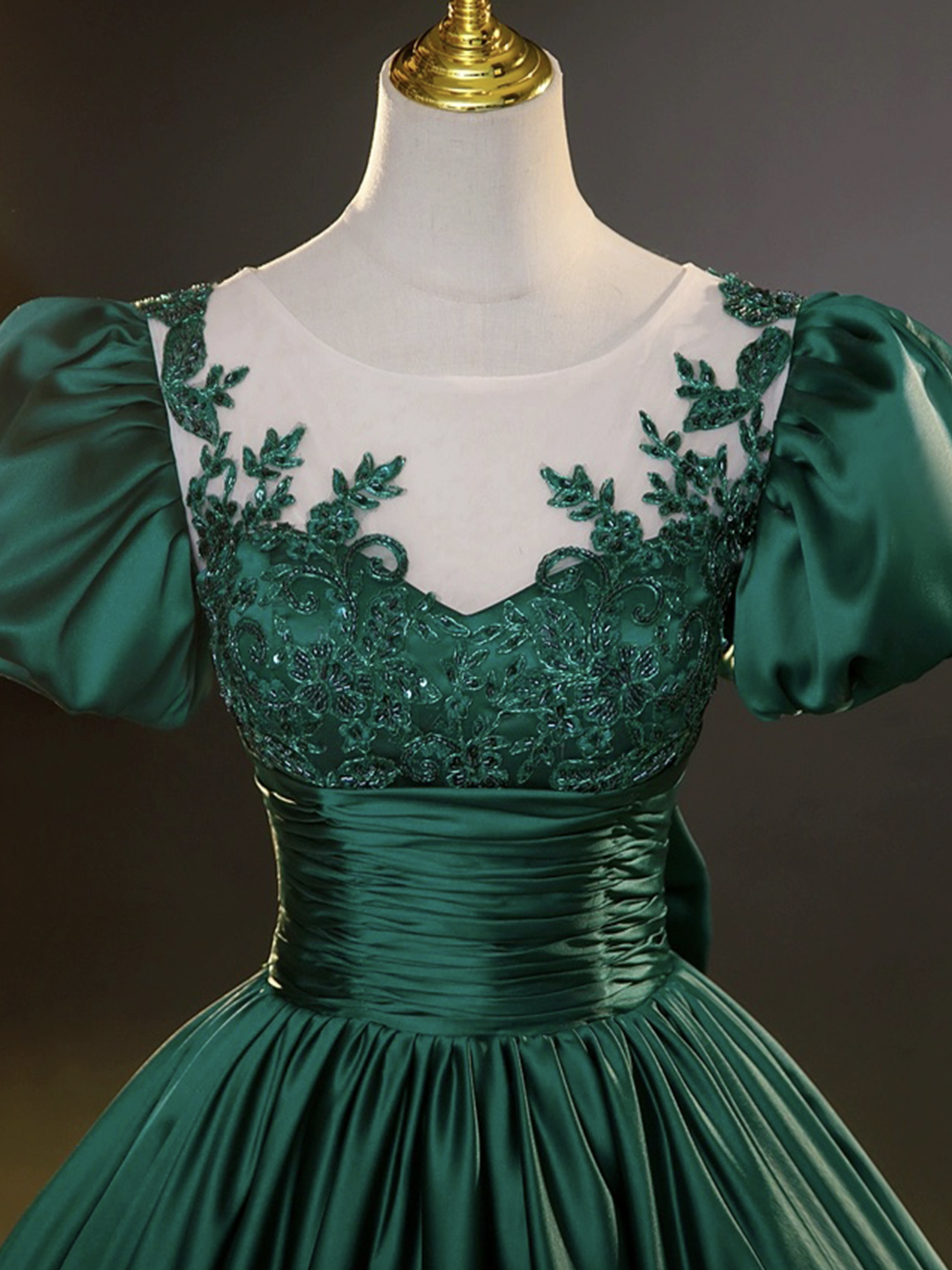 - Green Satin Lace Short Sleeve Floor Length Prom Party Dress -