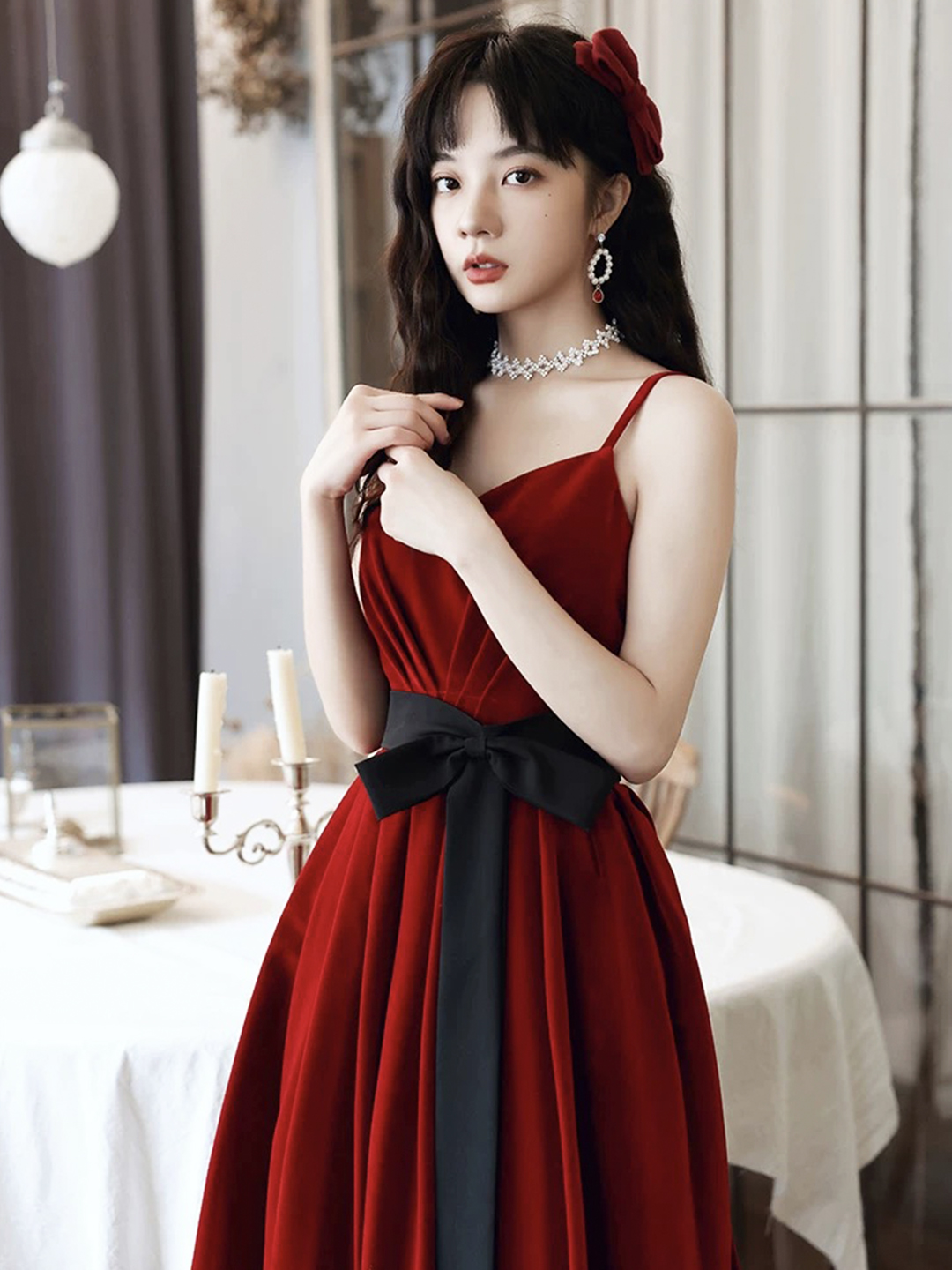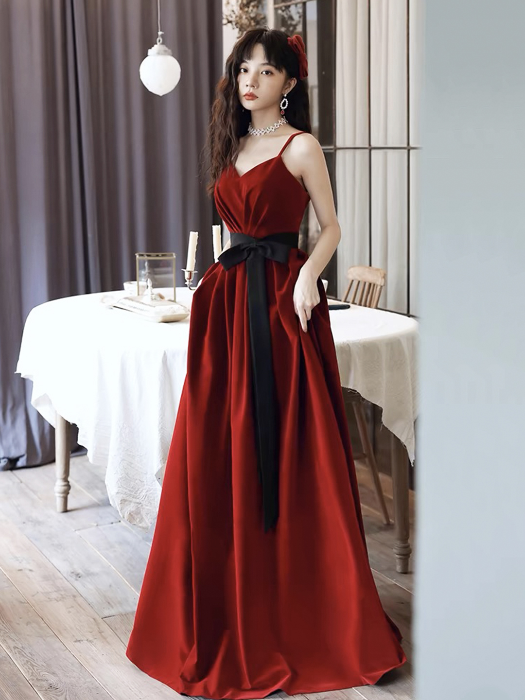 - Burgundy Spaghetti Strap Velvet Long A-Line Prom Dress -