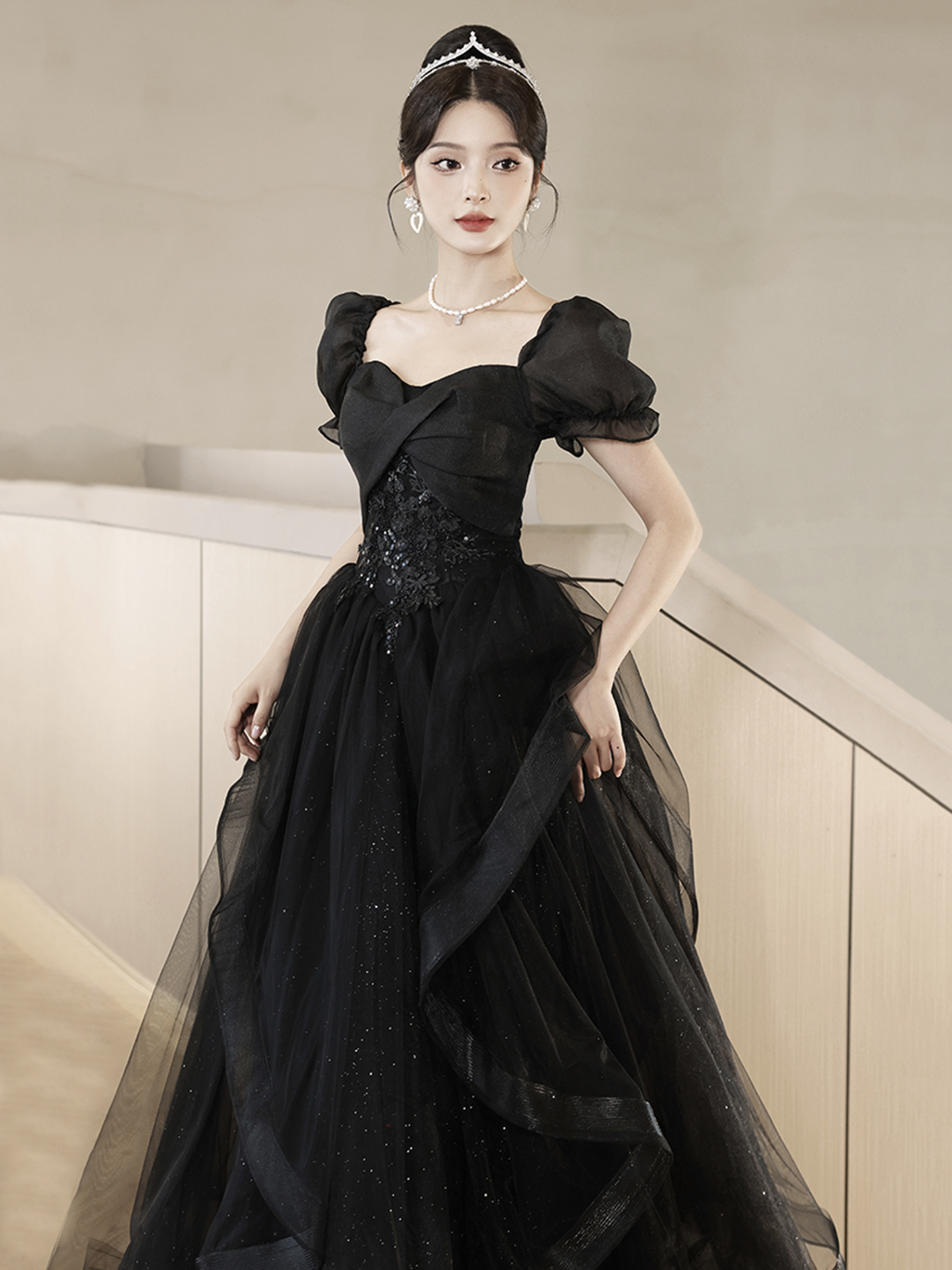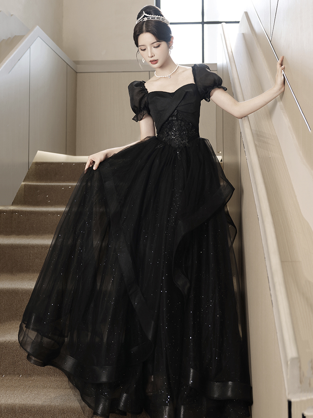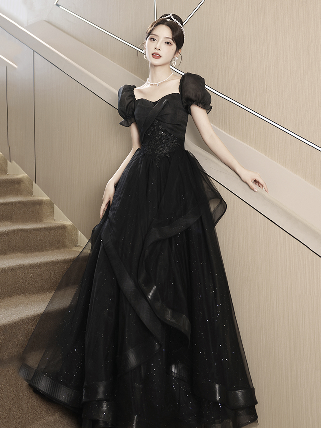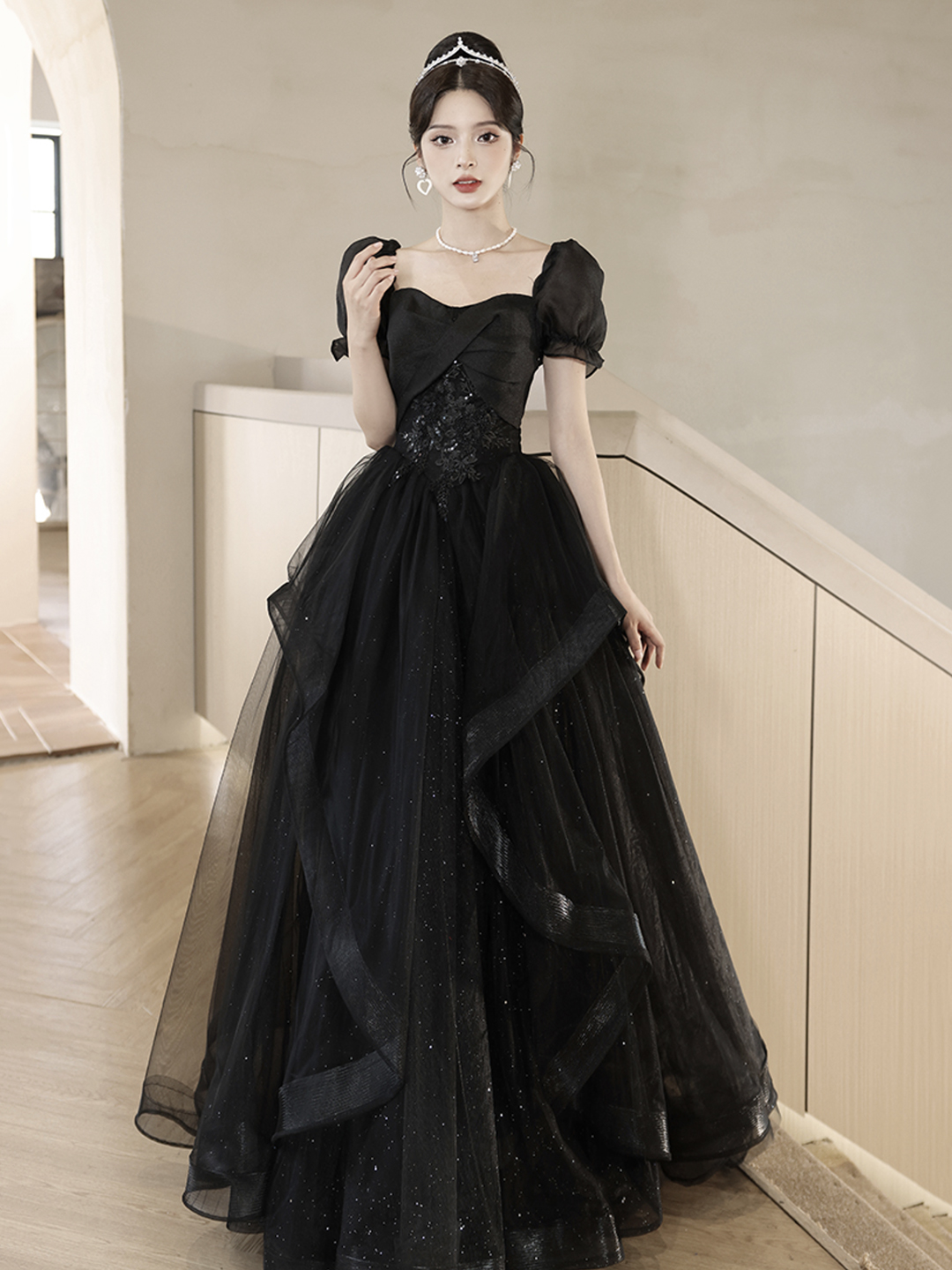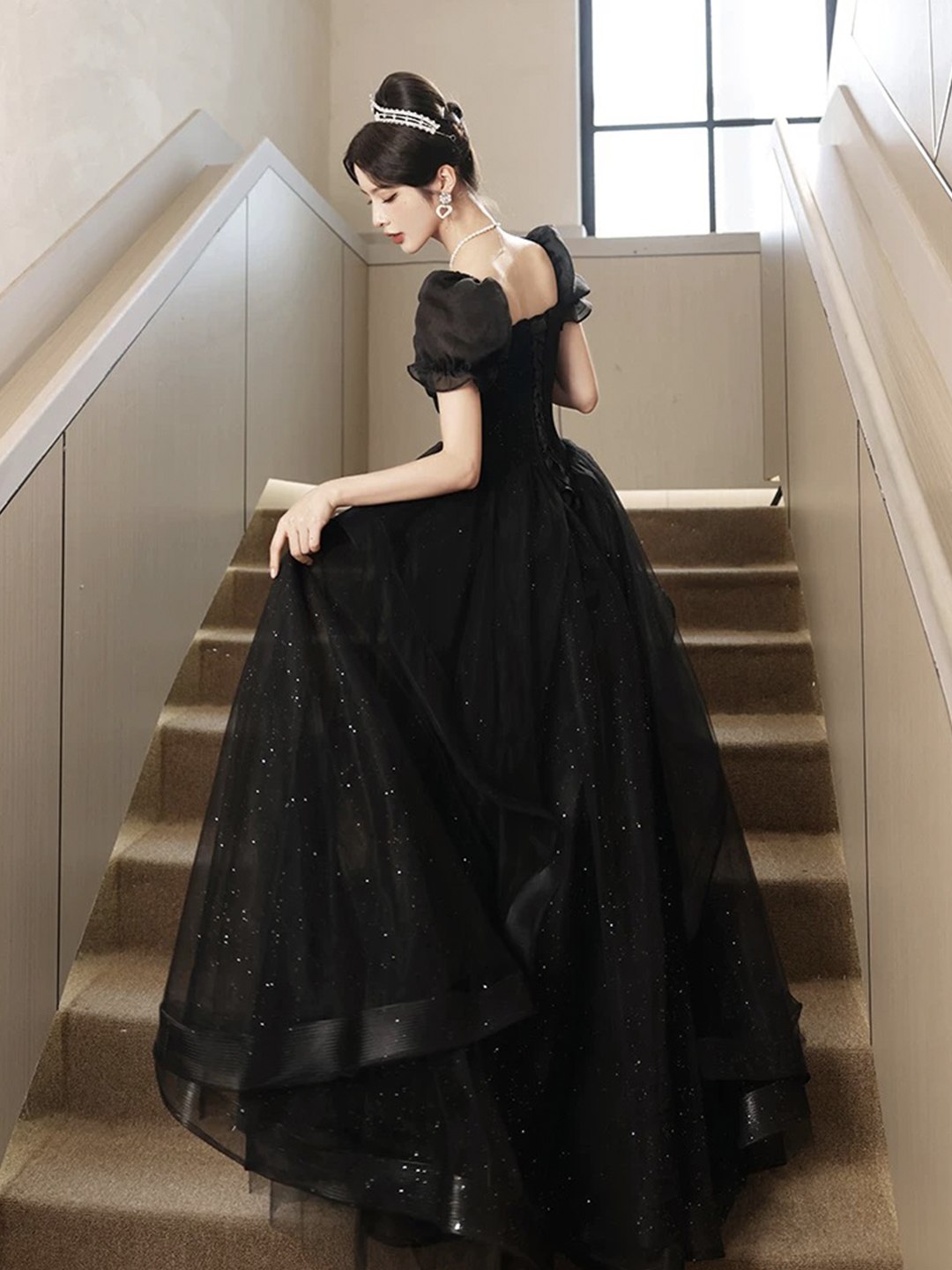 - Black Tulle Lace Long Prom Dress, Black A-Line Evening Party Dress -
