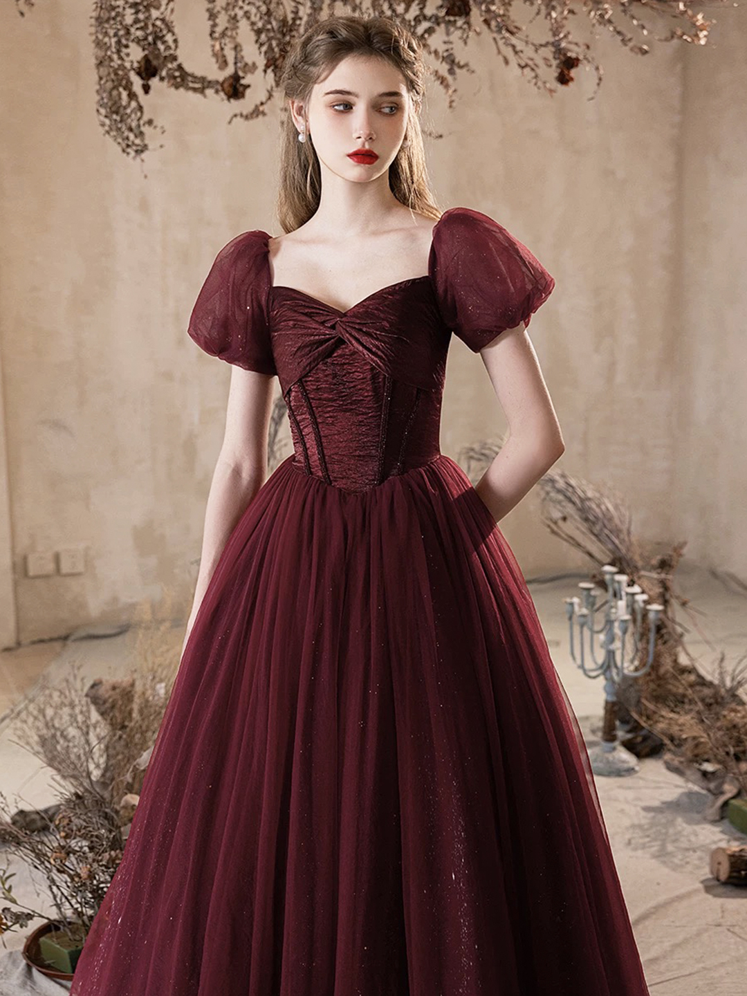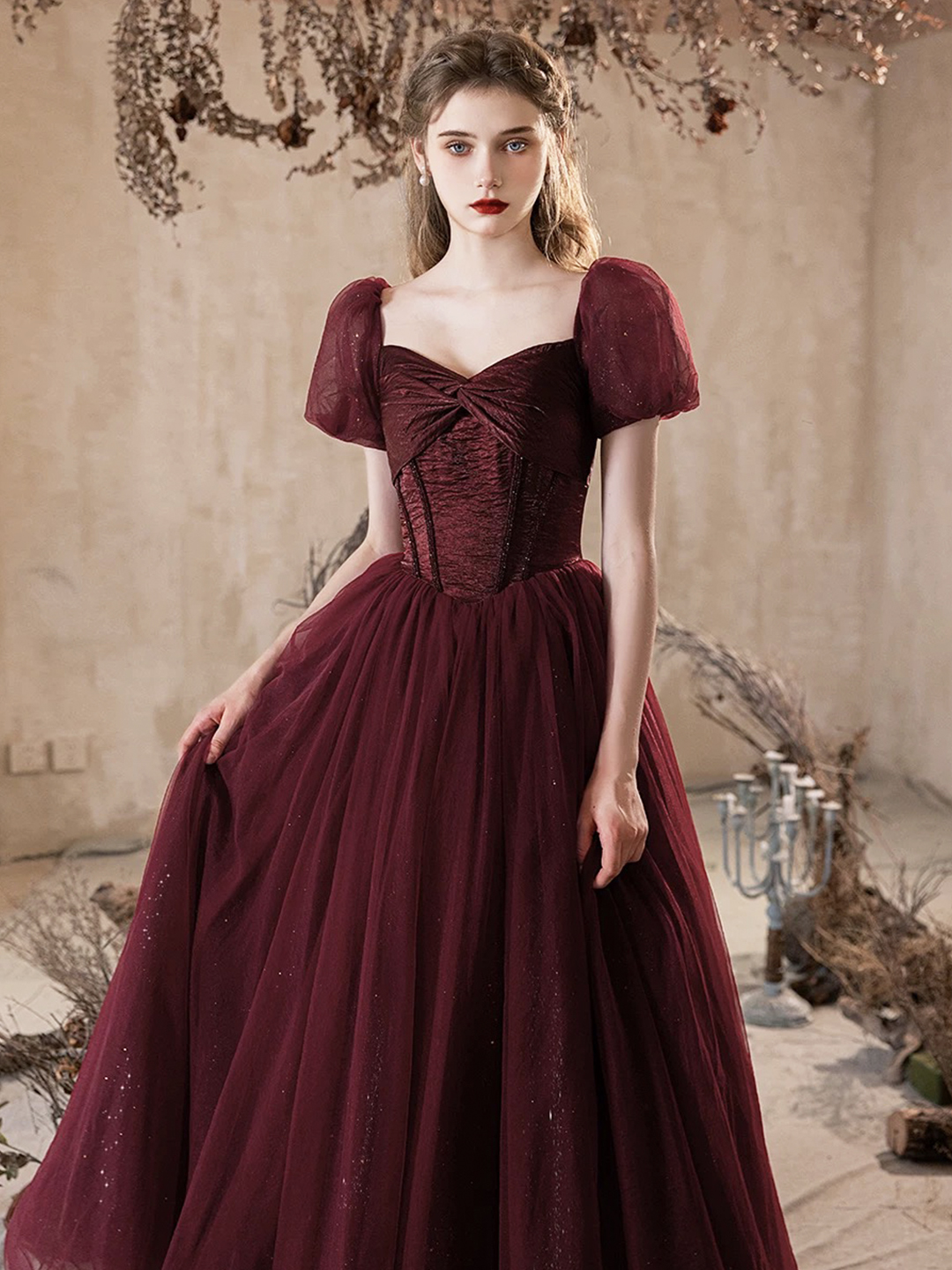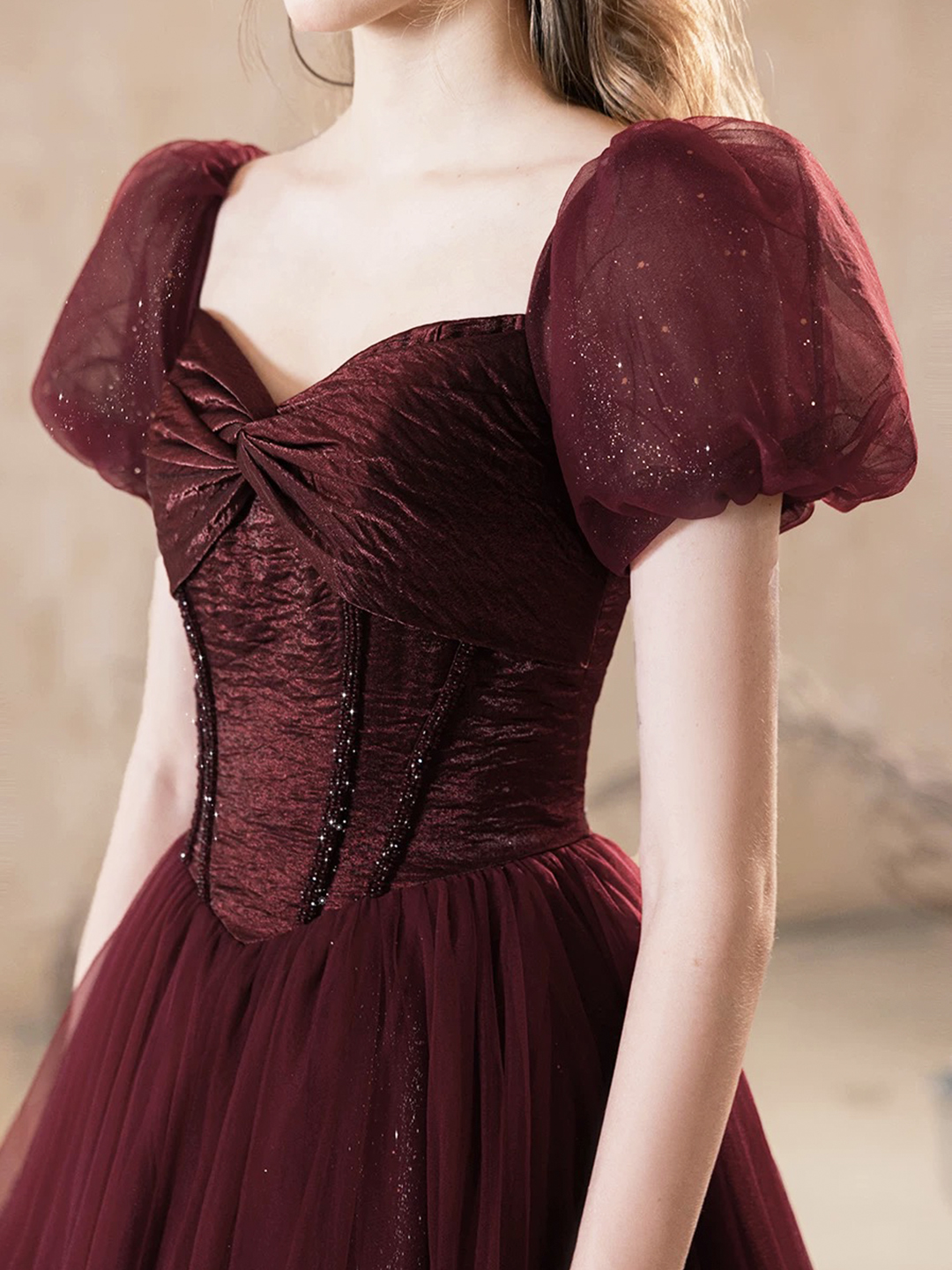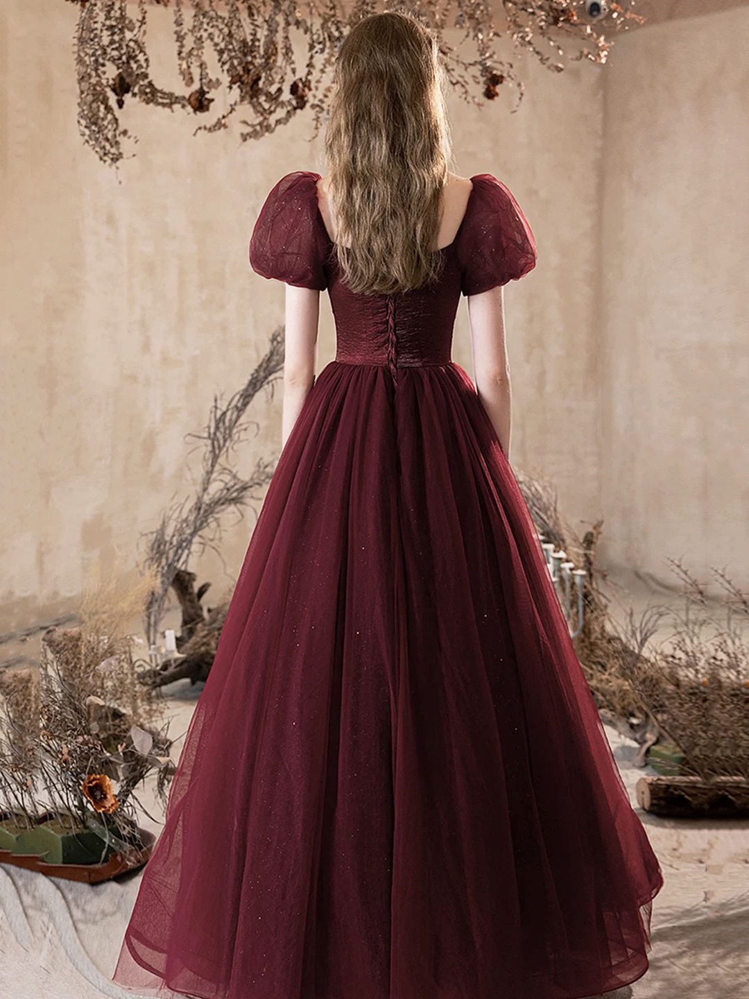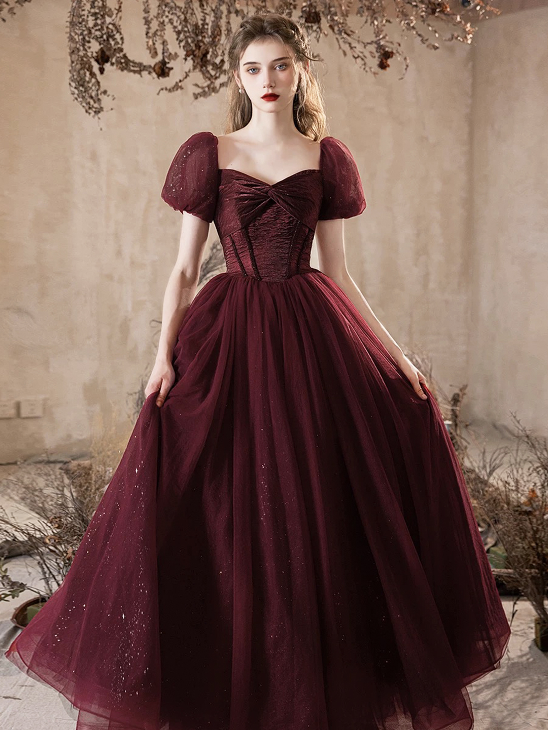 - Burgundy Shiny Tulle Floor Length Prom Dress, A-Line Short Sleeve Party Dress -