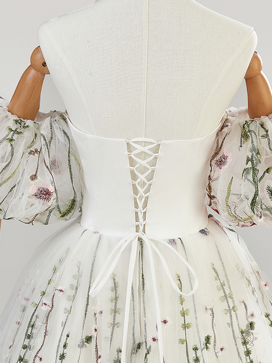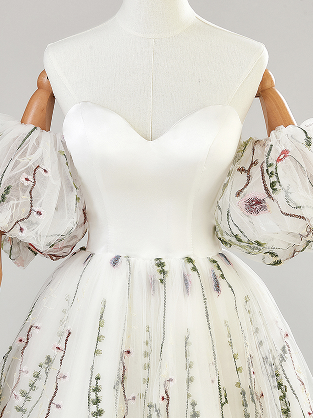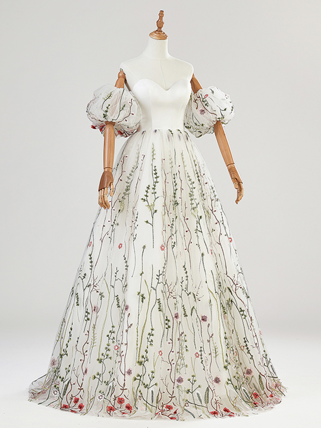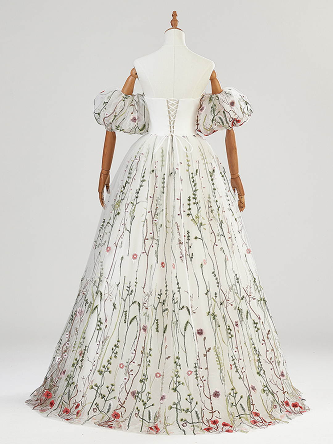 - White A-Line Tulle Lace Off the Shoulder Formal Party Dress -