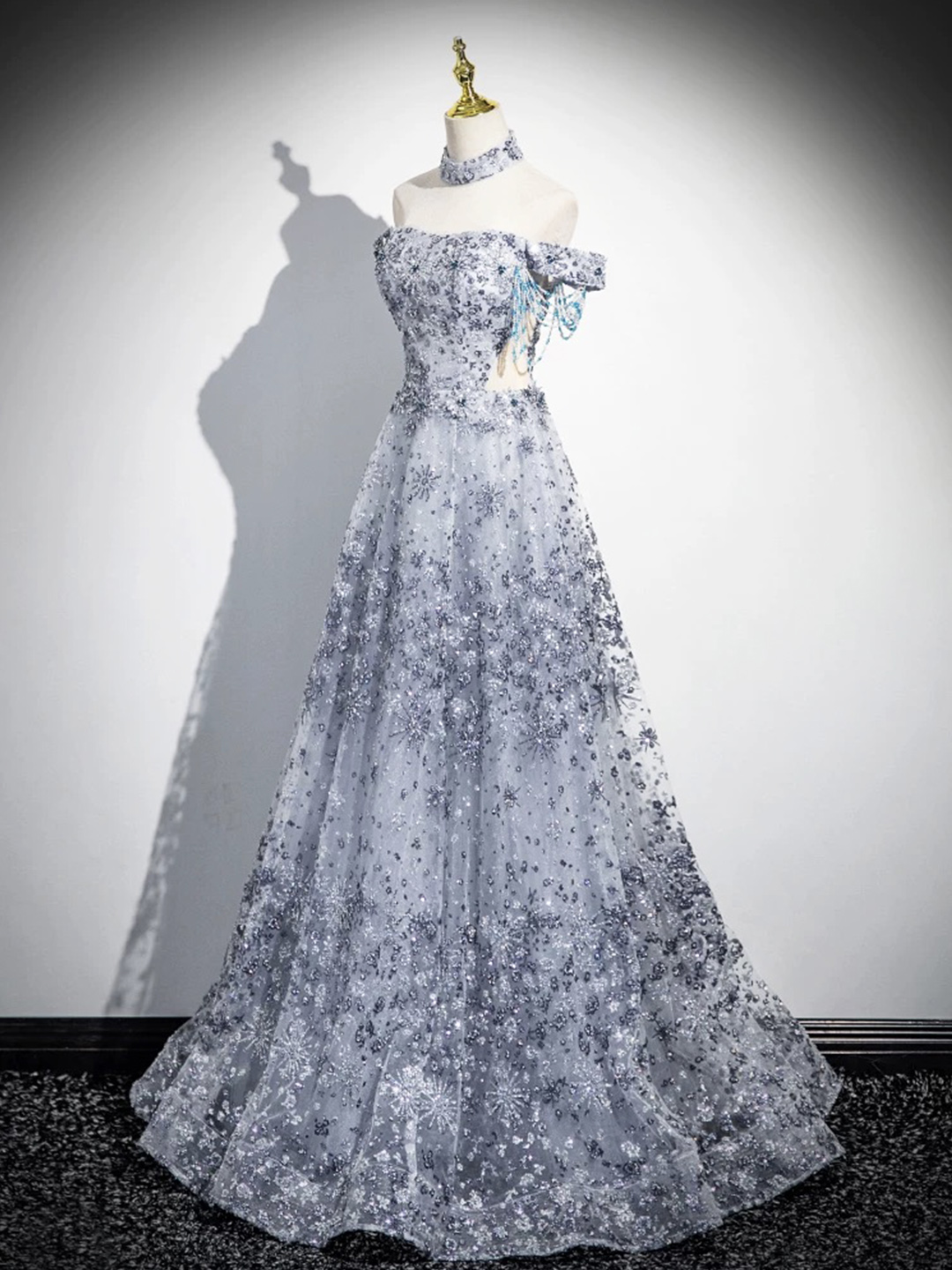 - Gray Tulle Sequins Floor Length Prom Party Dress -
