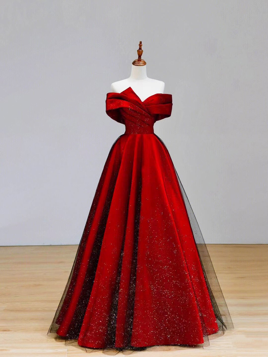 - Burgundy Satin and Black Tulle Floor Length Prom Dress -