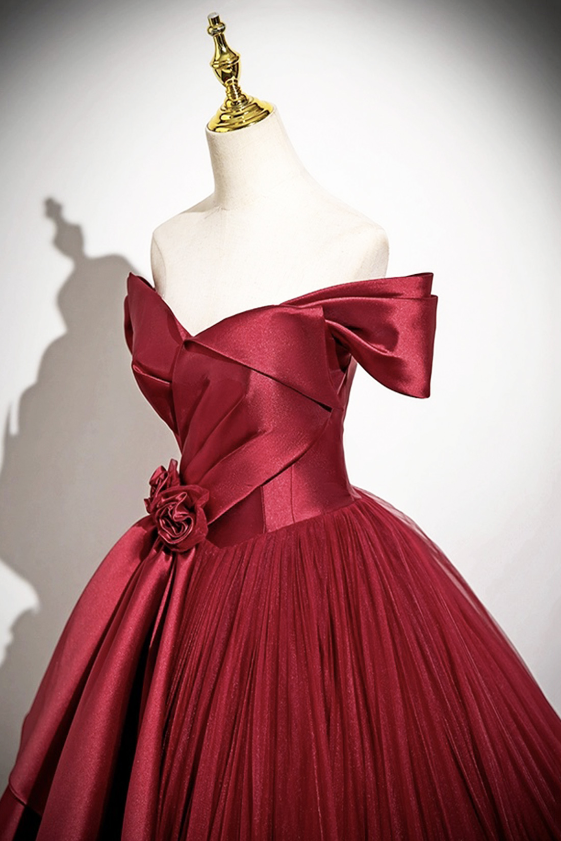 Burgundy Satin Tulle Floor Length Formal Prom Dress