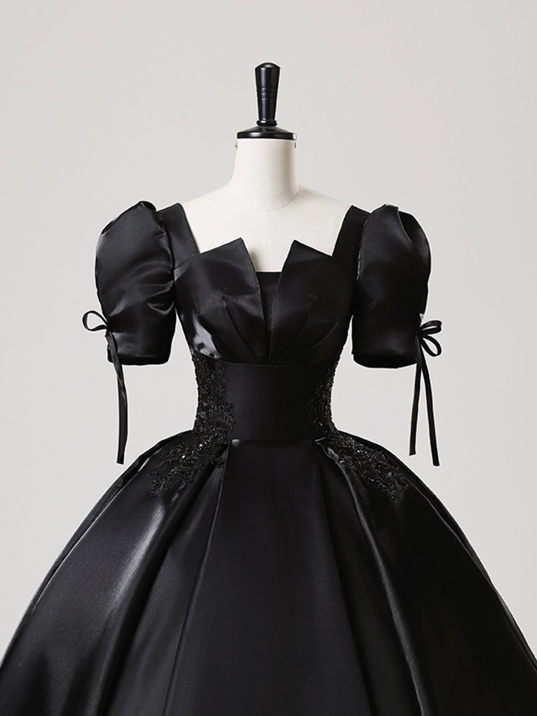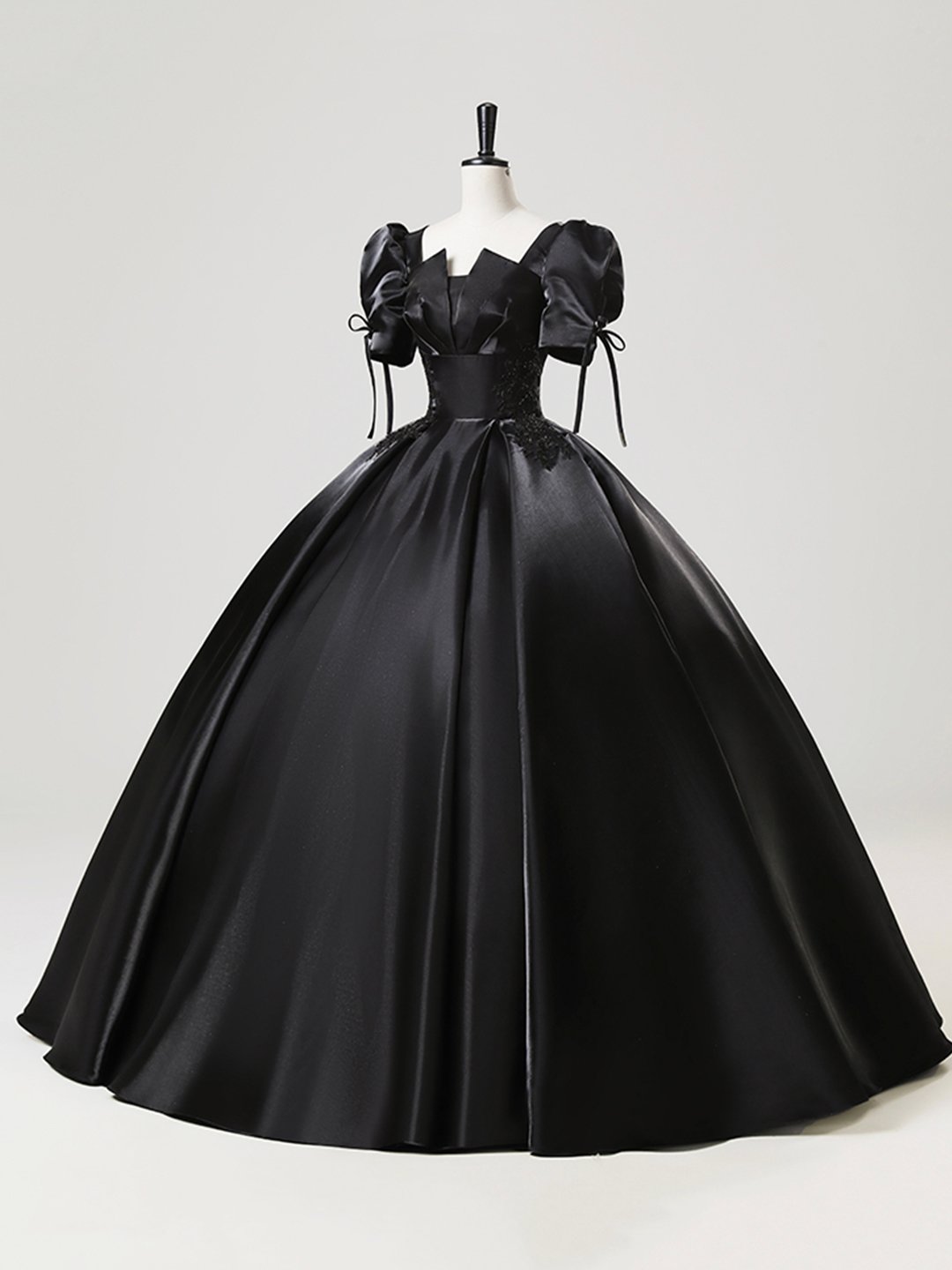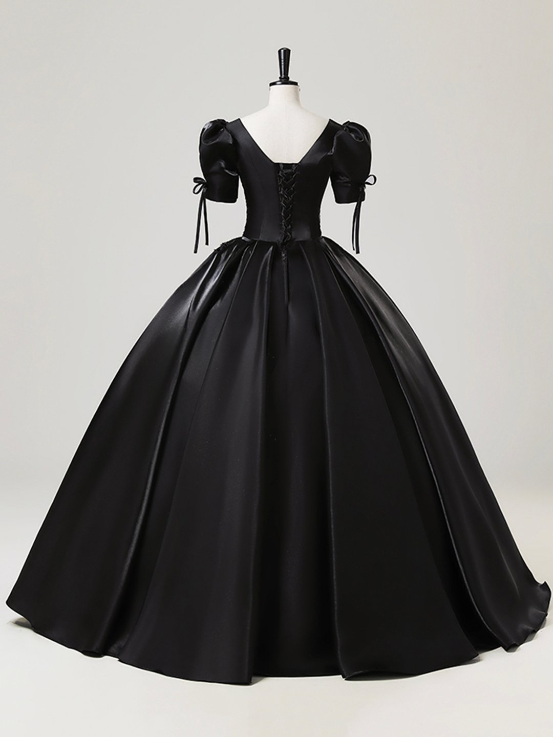 - Black Satin Lace Floor Length Prom Dress, Elegant Short Sleeve Party Dress -