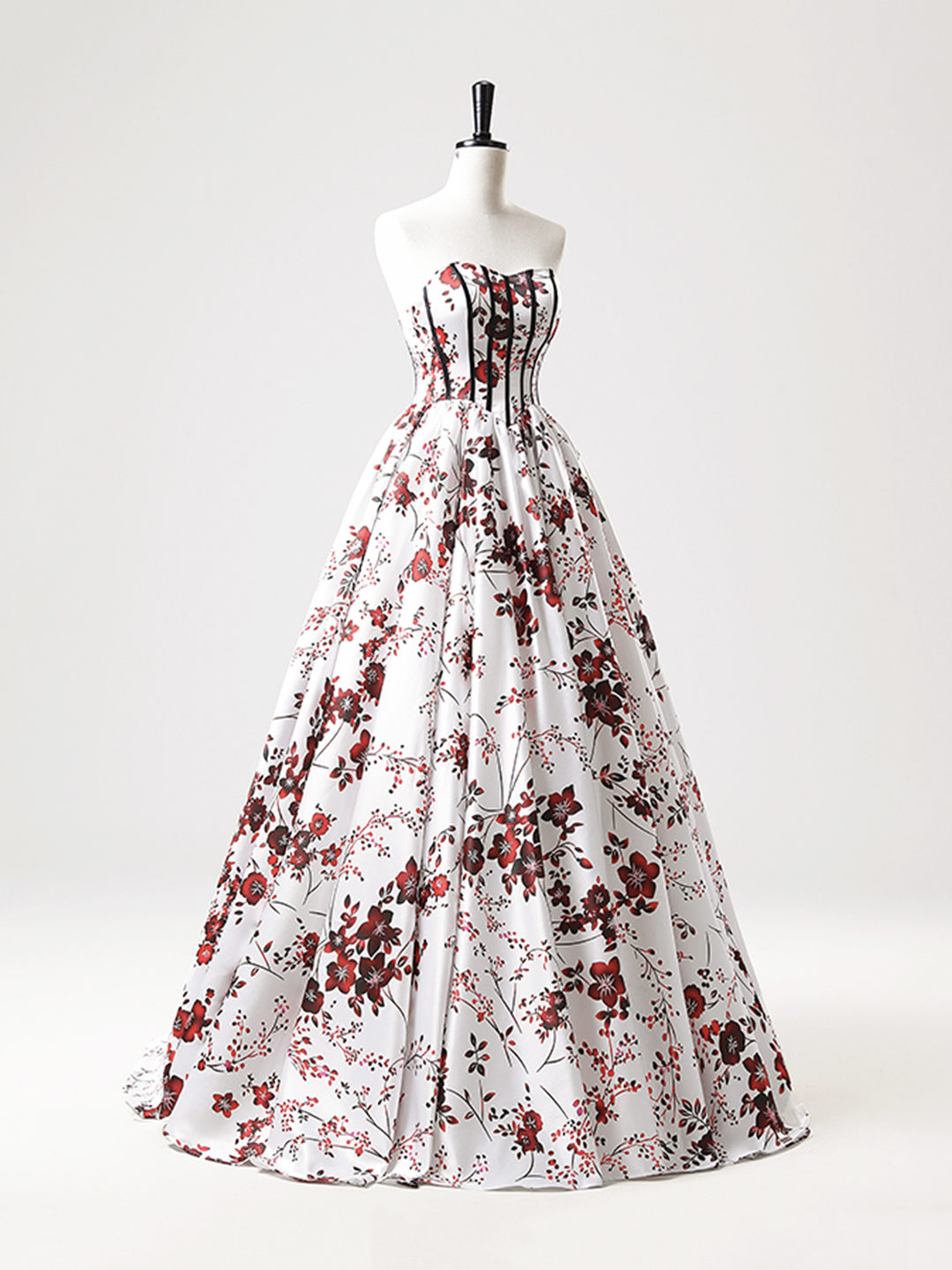 - White Floral Floor Length Prom Dress, A-Line Sweetheart Neck Party Dress -