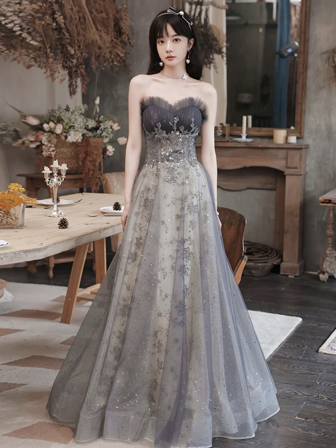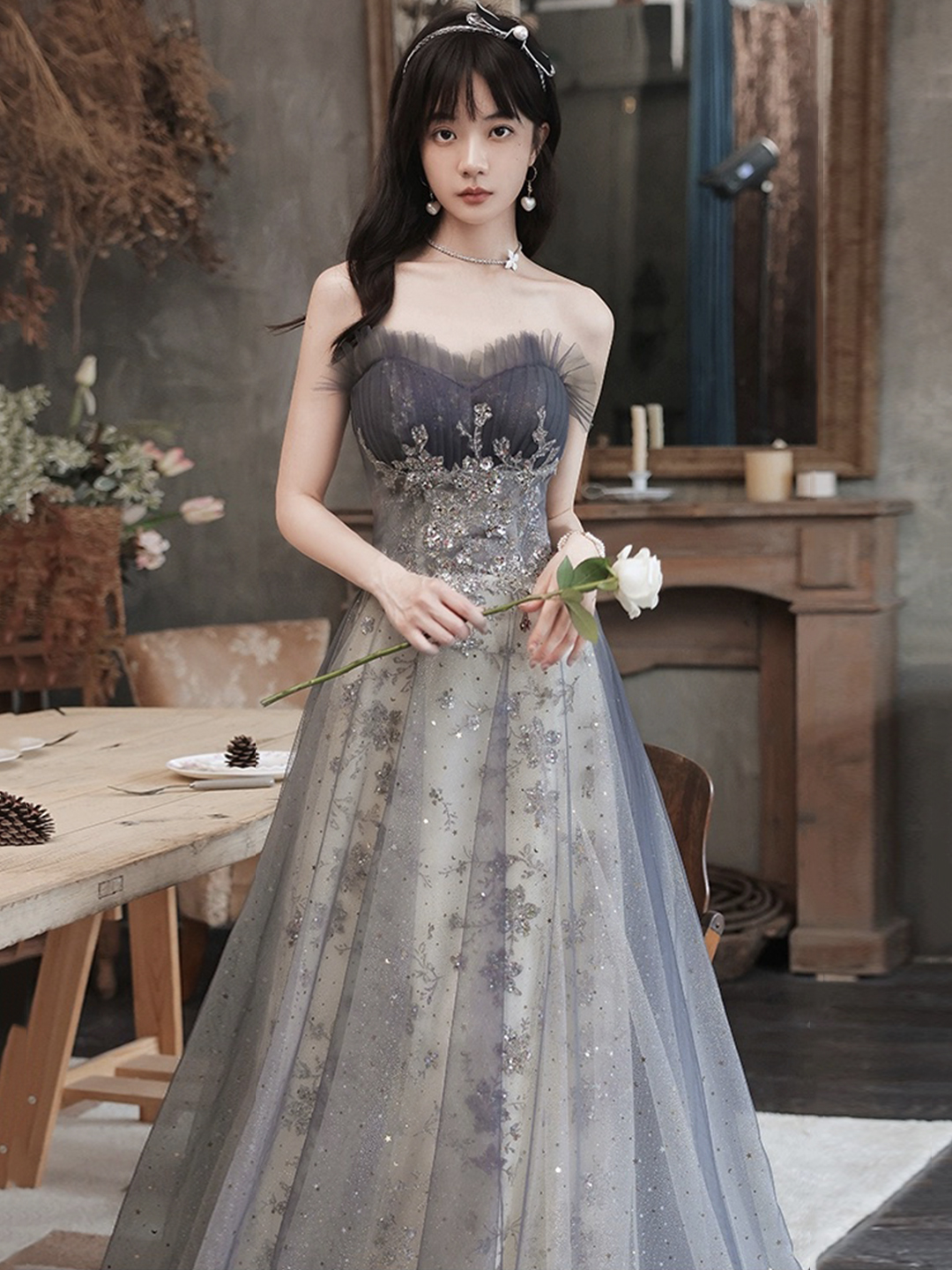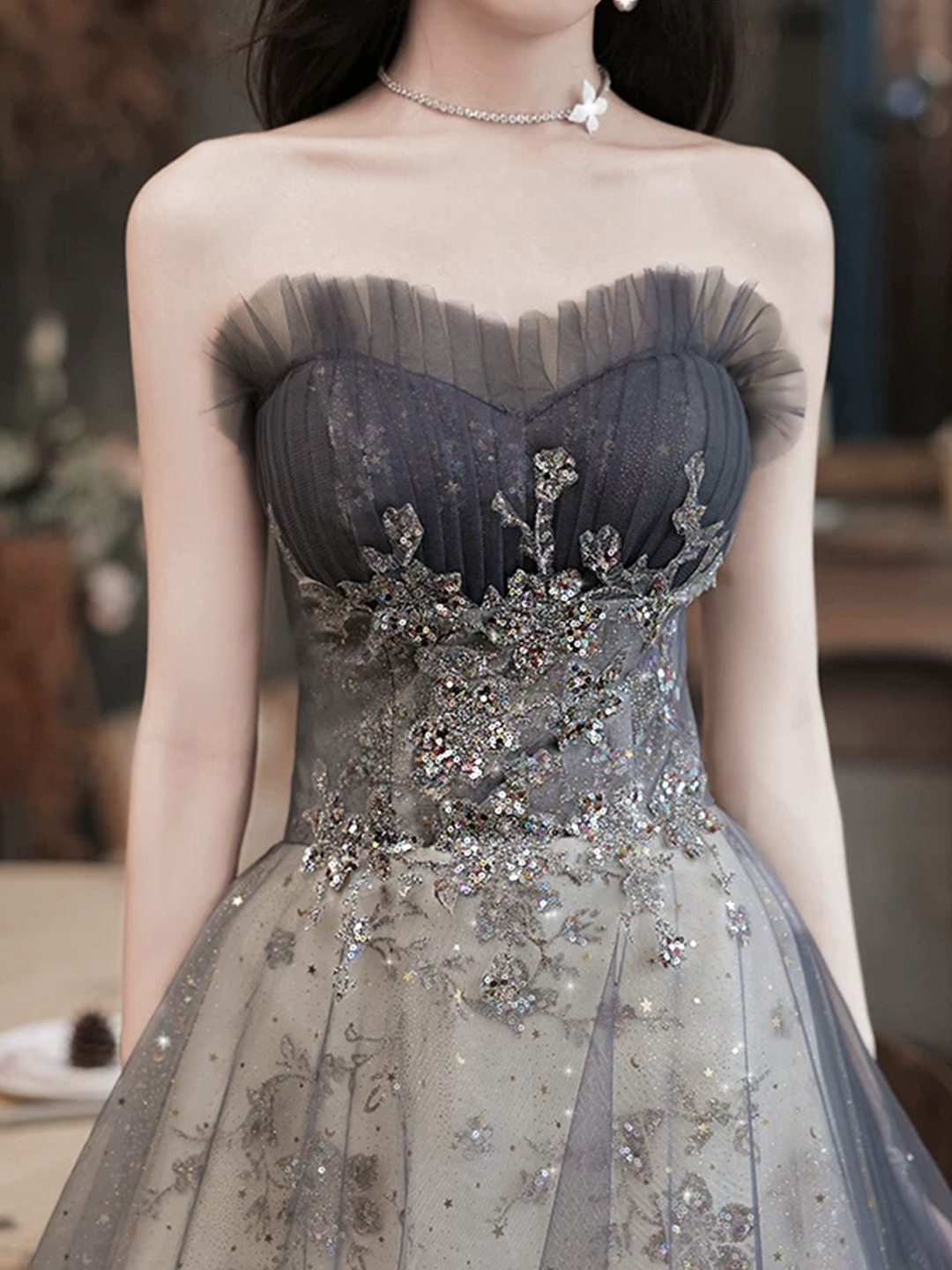 - Gray Strapless Sequins Long Prom Dress, Beautiful A-Line Party Dress -
