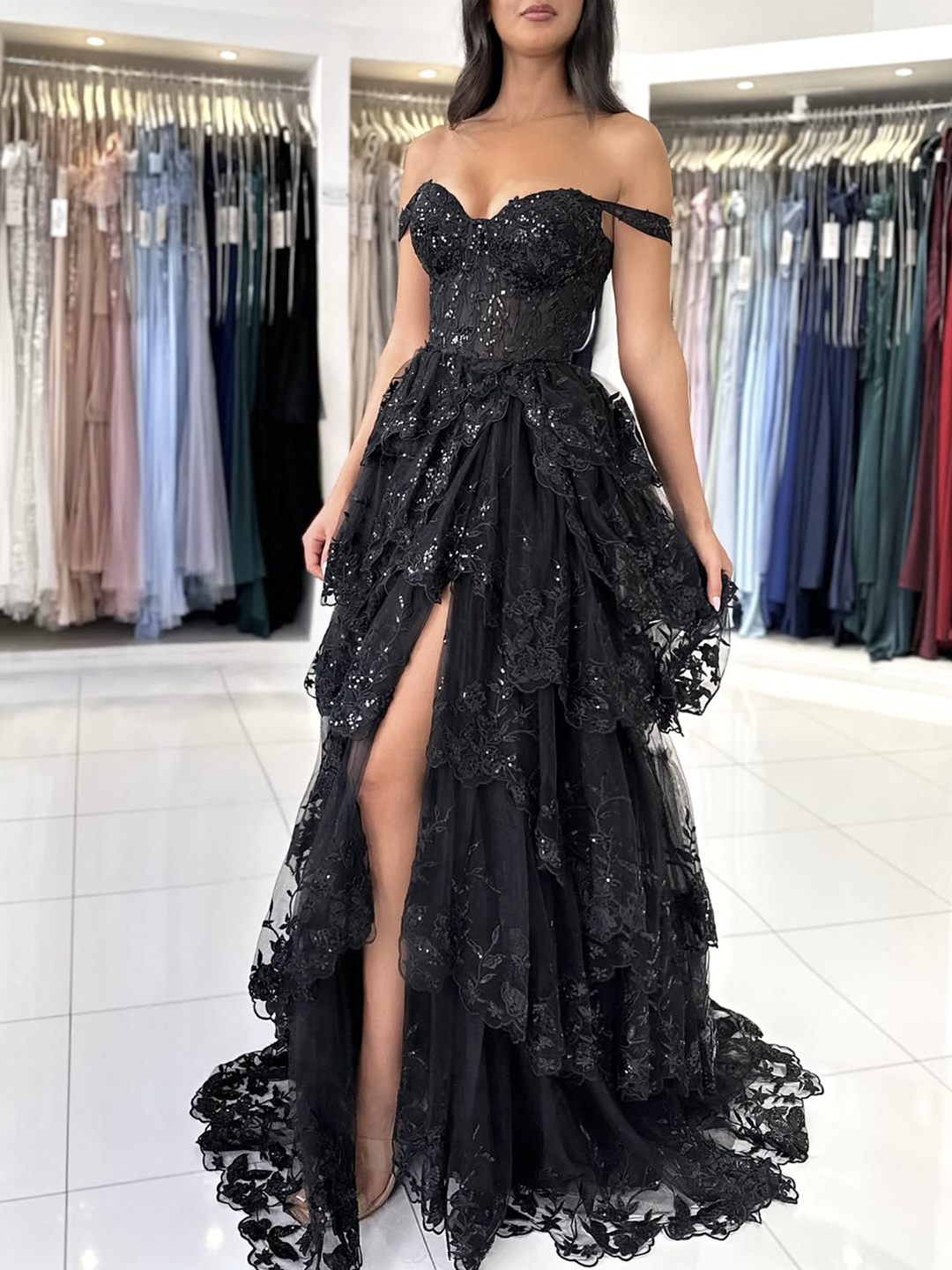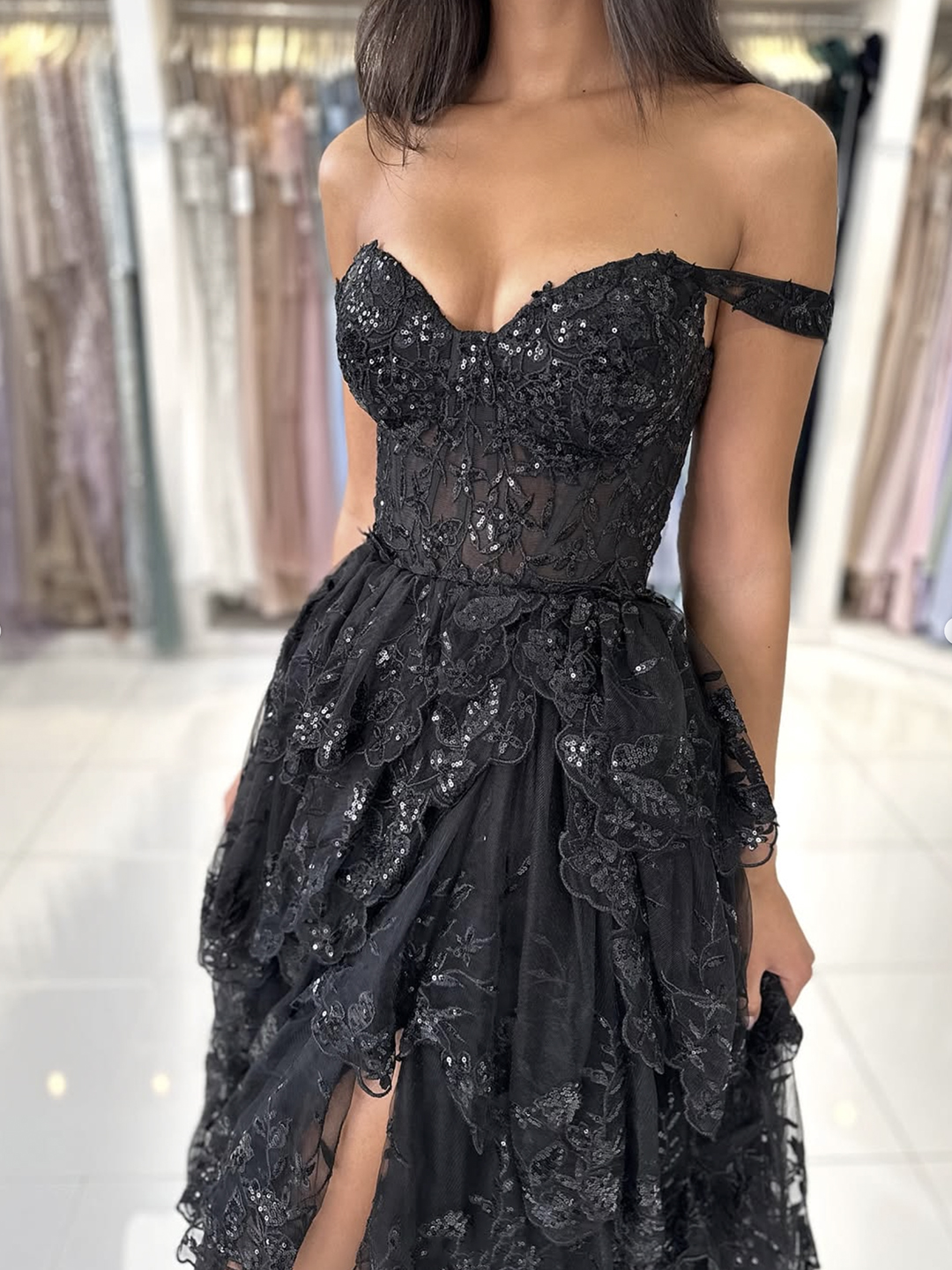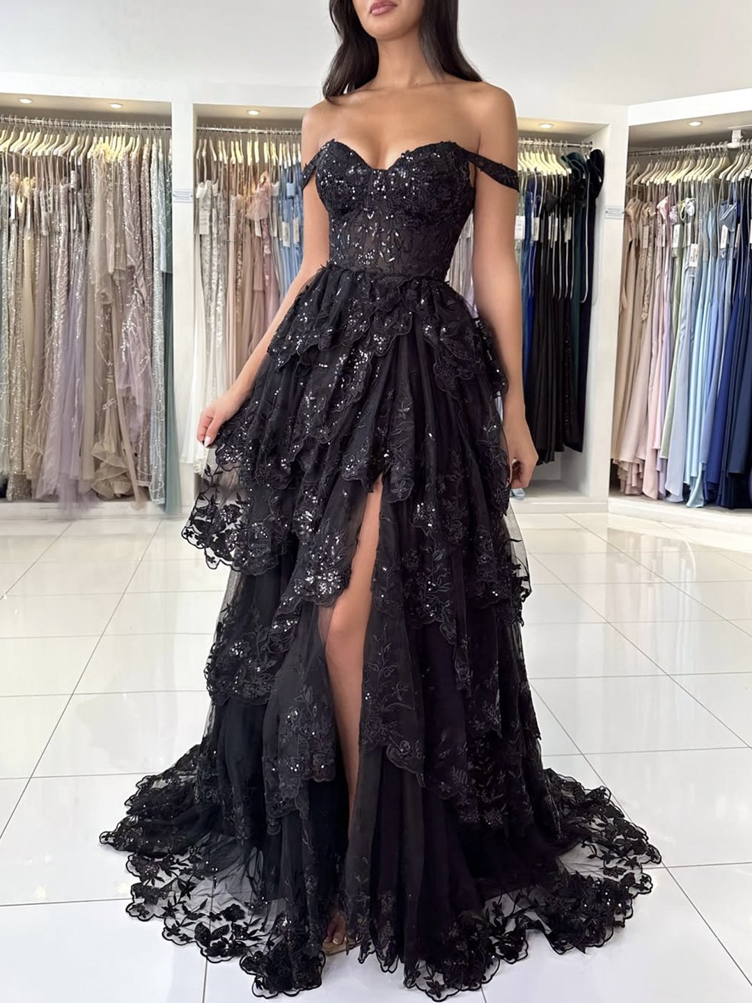 - Black Lace Sequins Layered Long Prom Dresses, Off the Shoulder Evening Party Dress -
