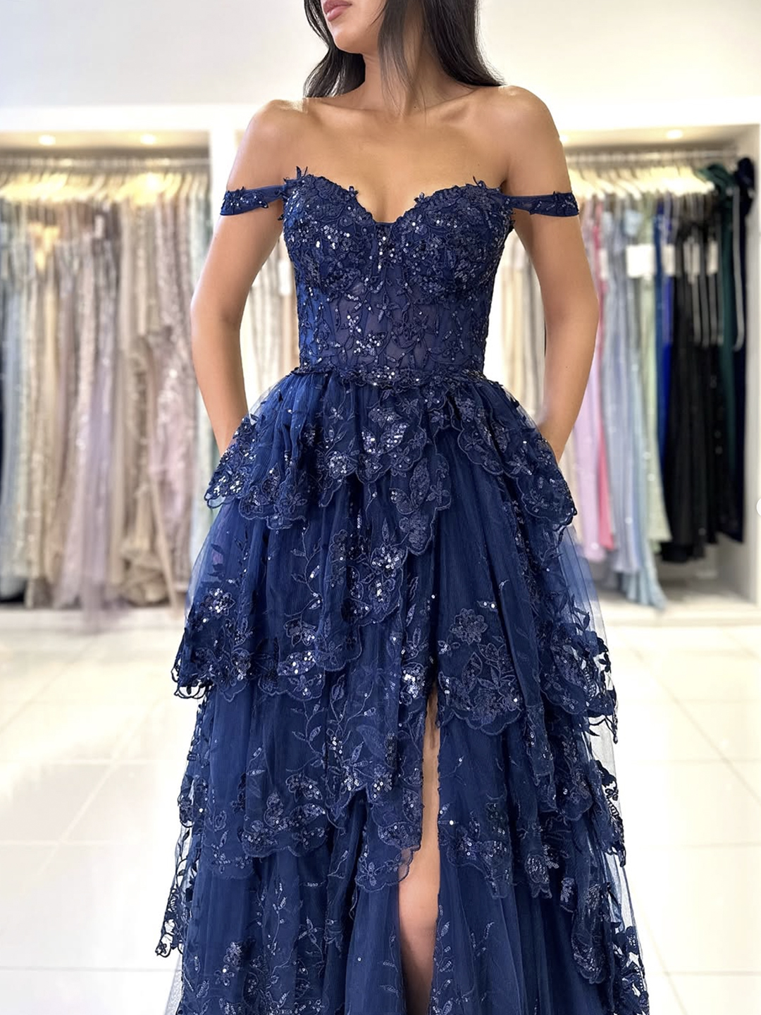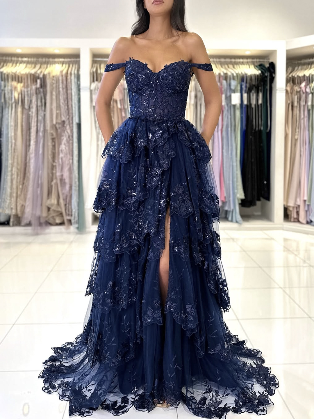 - Blue Lace Sequins Layered Long Prom Dresses, Off the Shoulder Evening Party Dress -