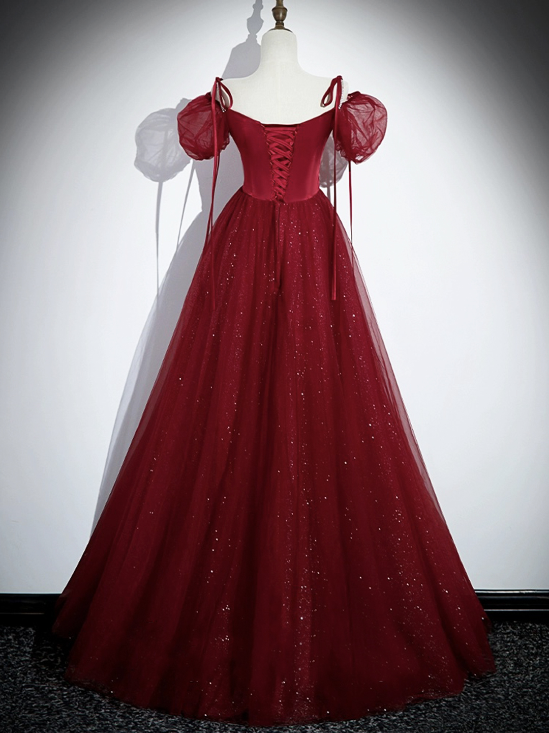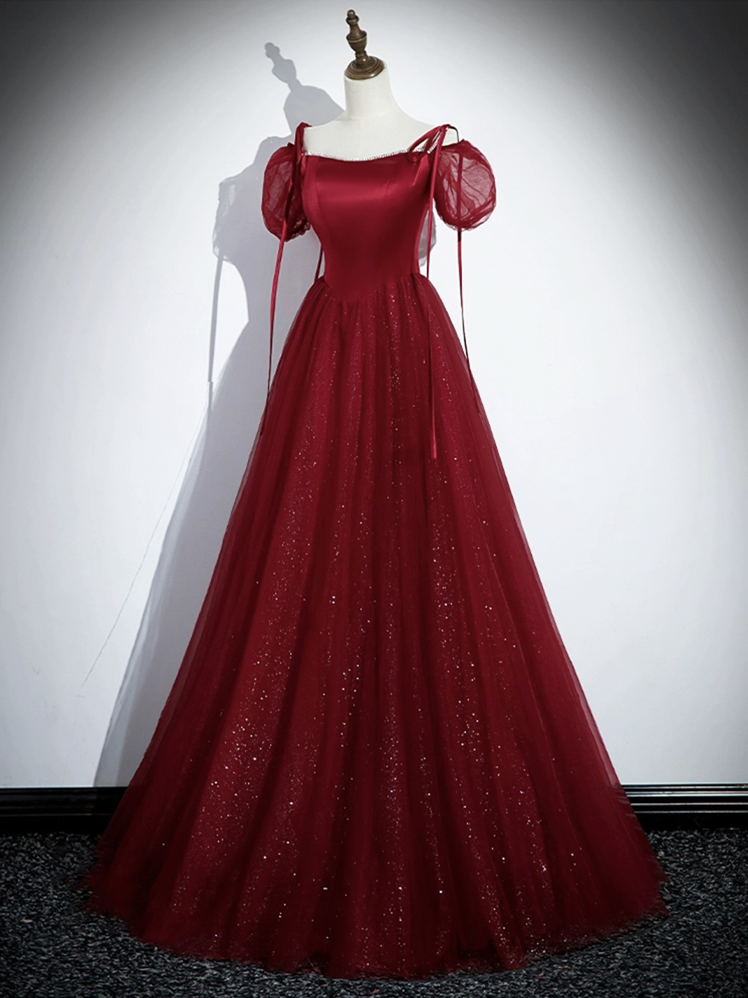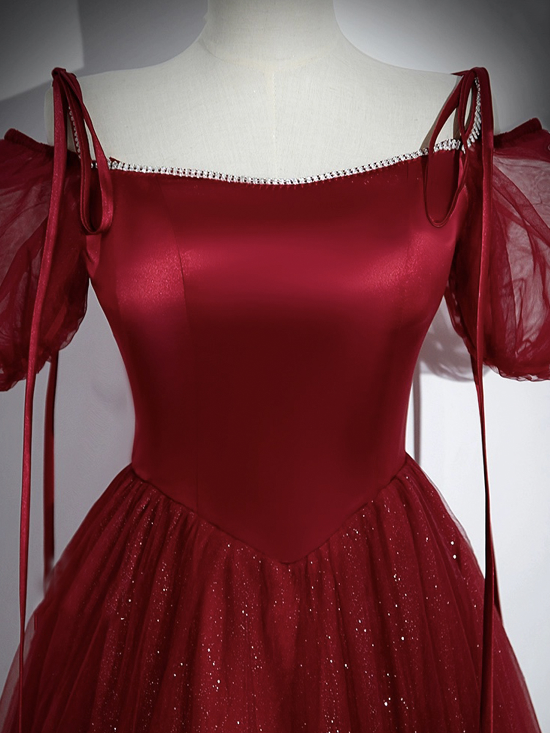 - Burgundy Satin Tulle Floor Length Prom Party Dress -