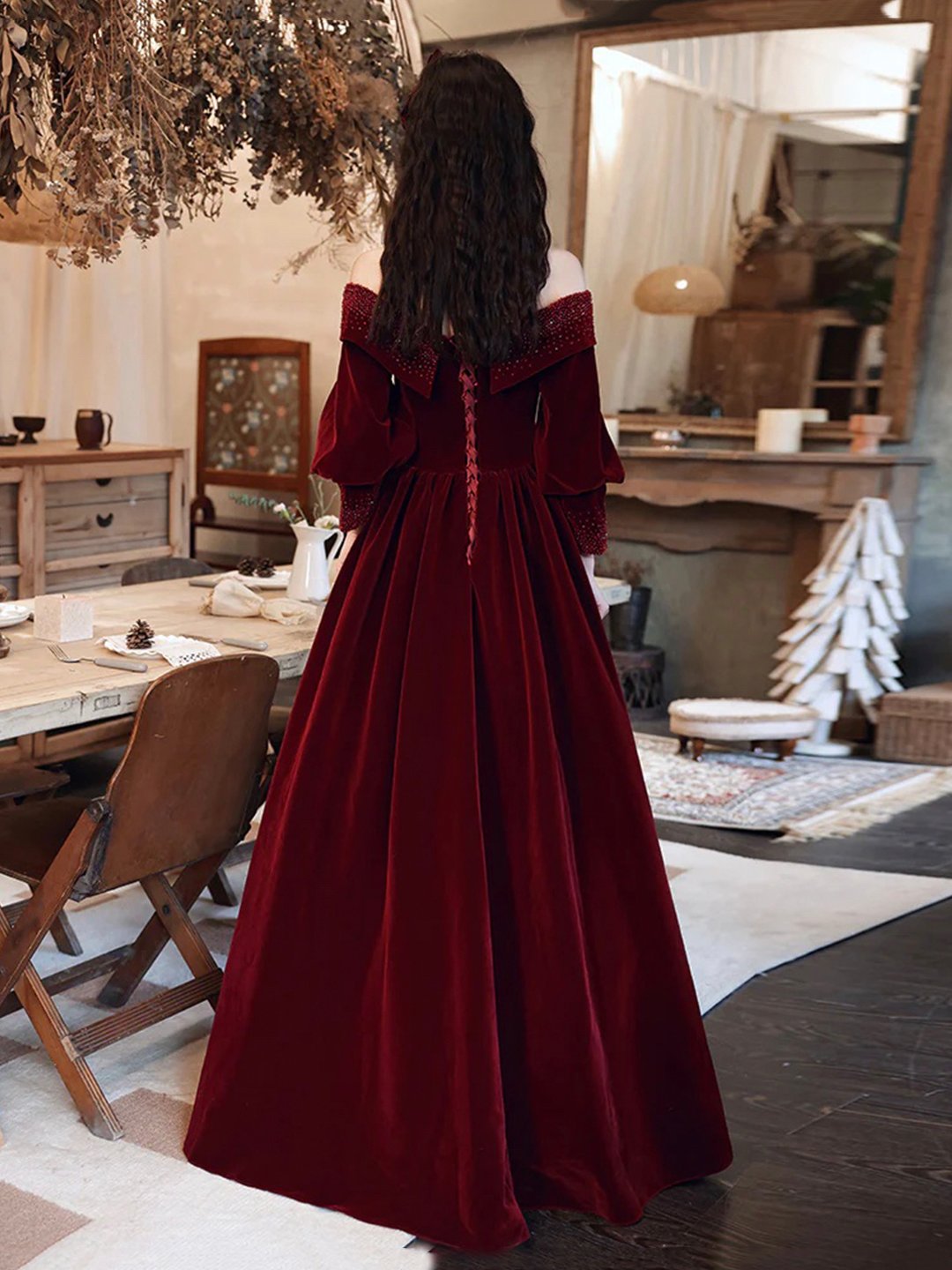 - Burgundy Velvet Long Sleeve Evening Paty Dress -