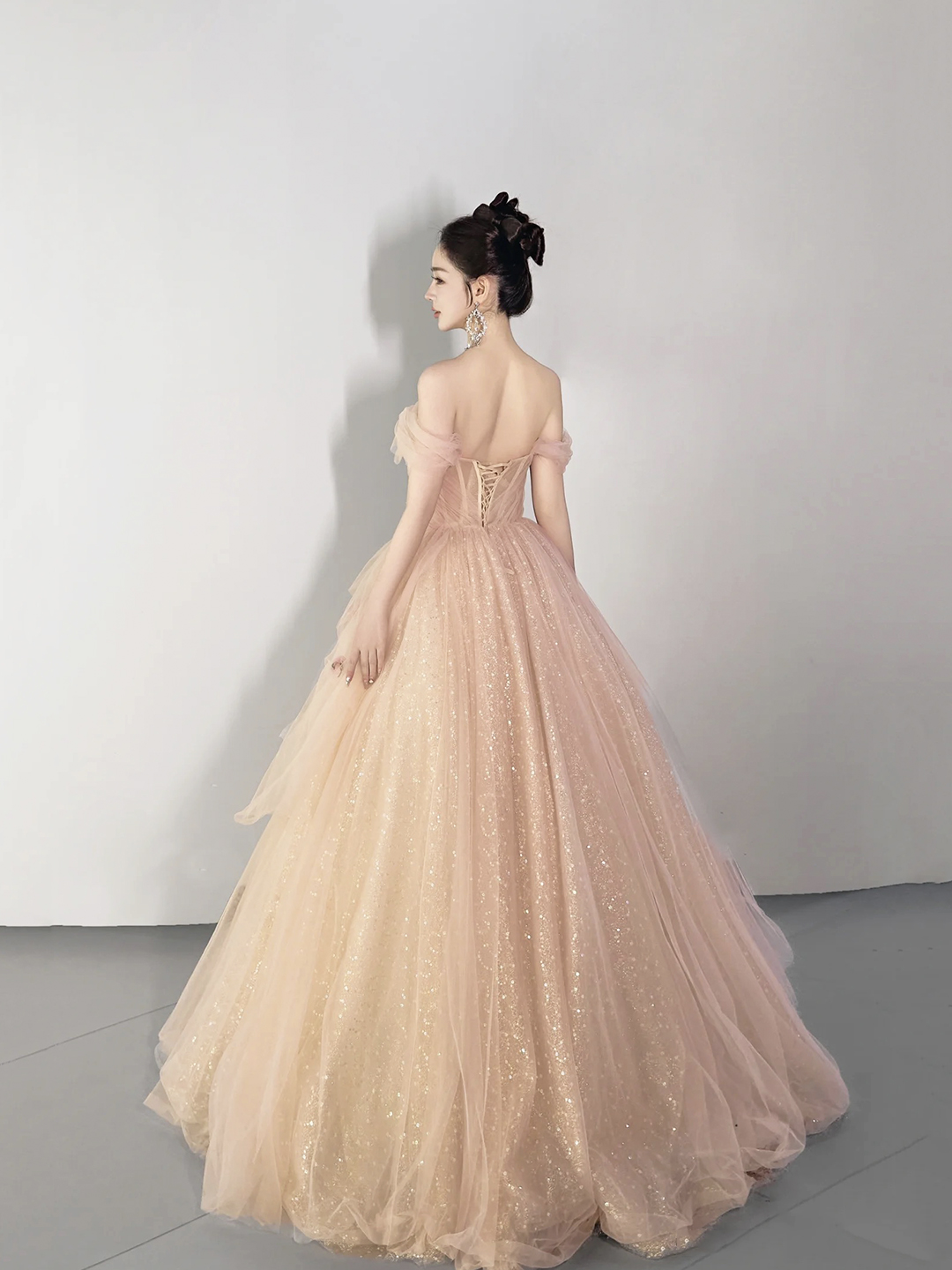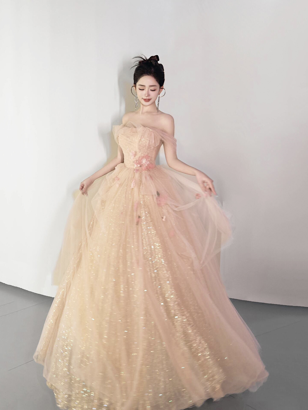 - Champagne Tulle Sequins Floor Length Prom Party Dress -