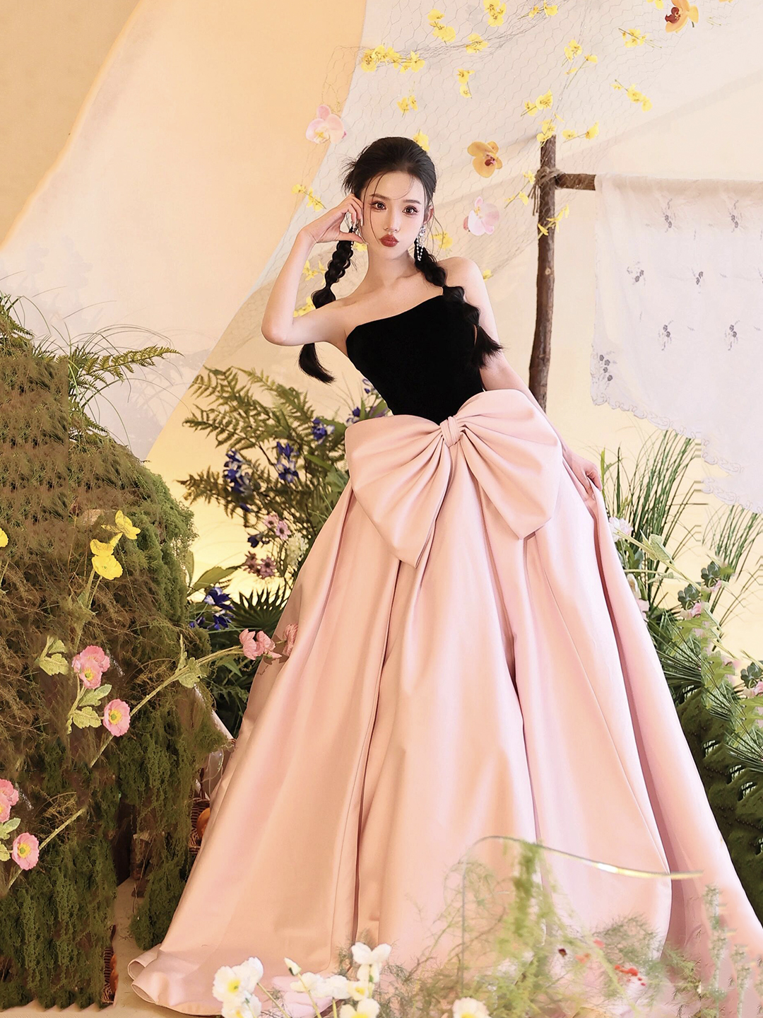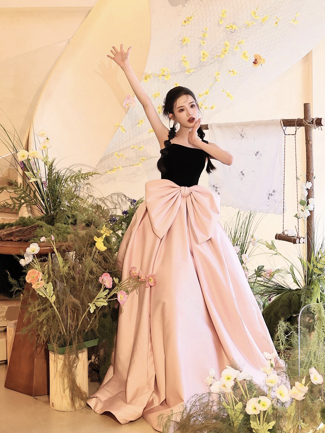 - Black Velvet and Pink Satin Long Prom Party Dress -