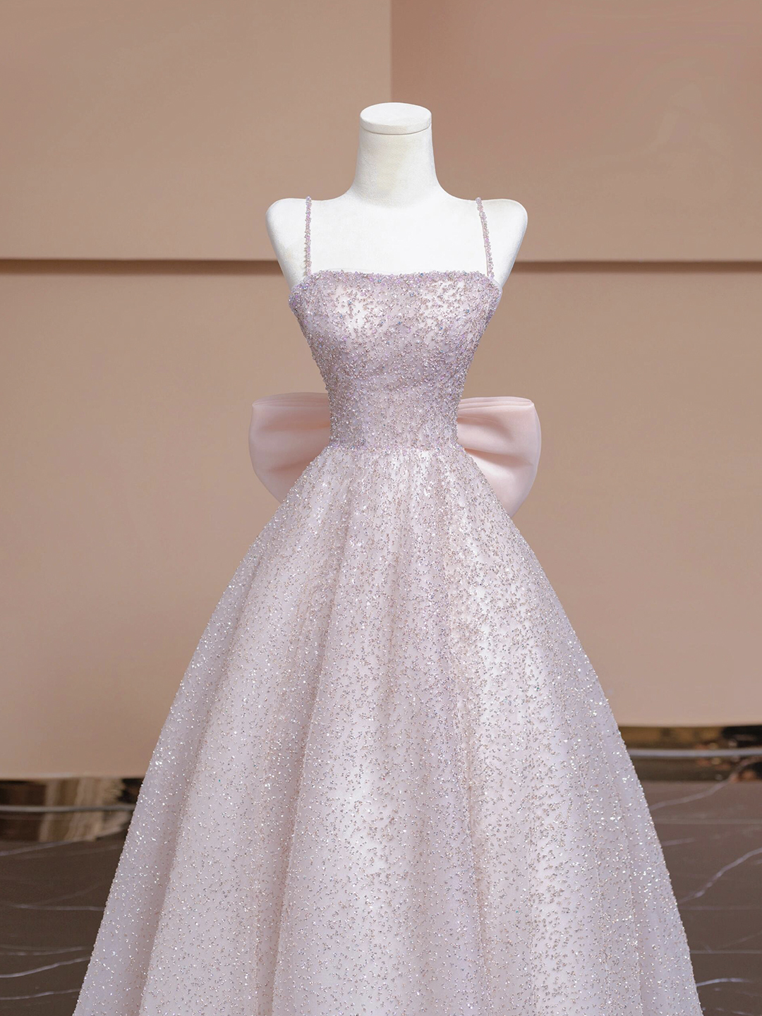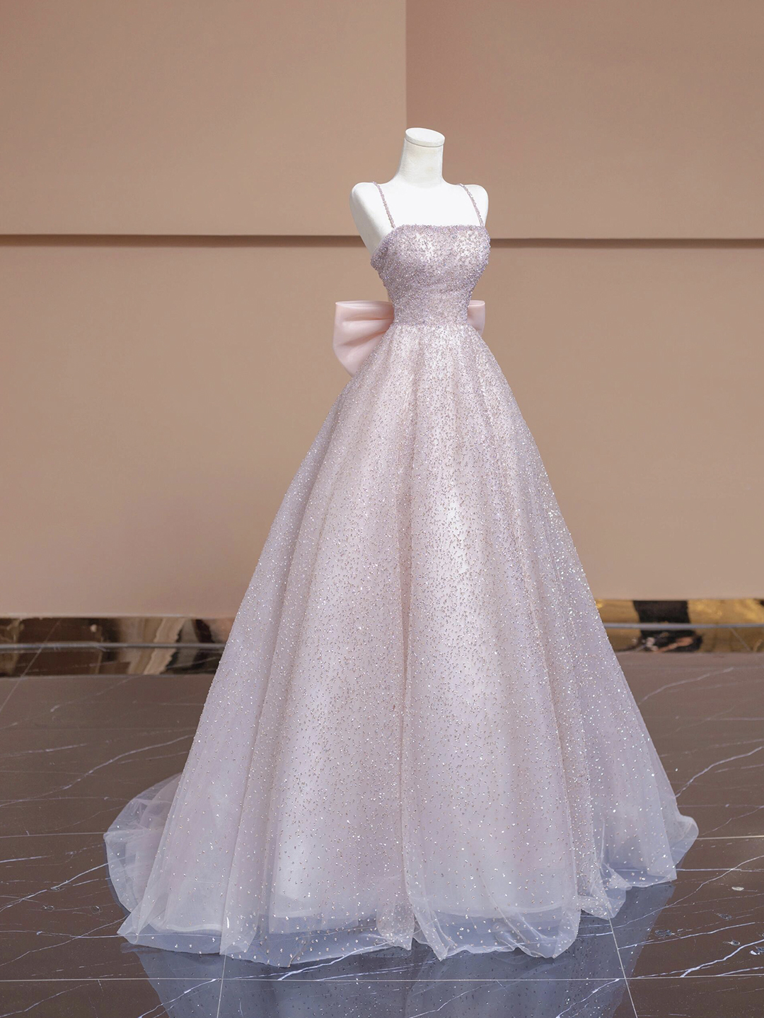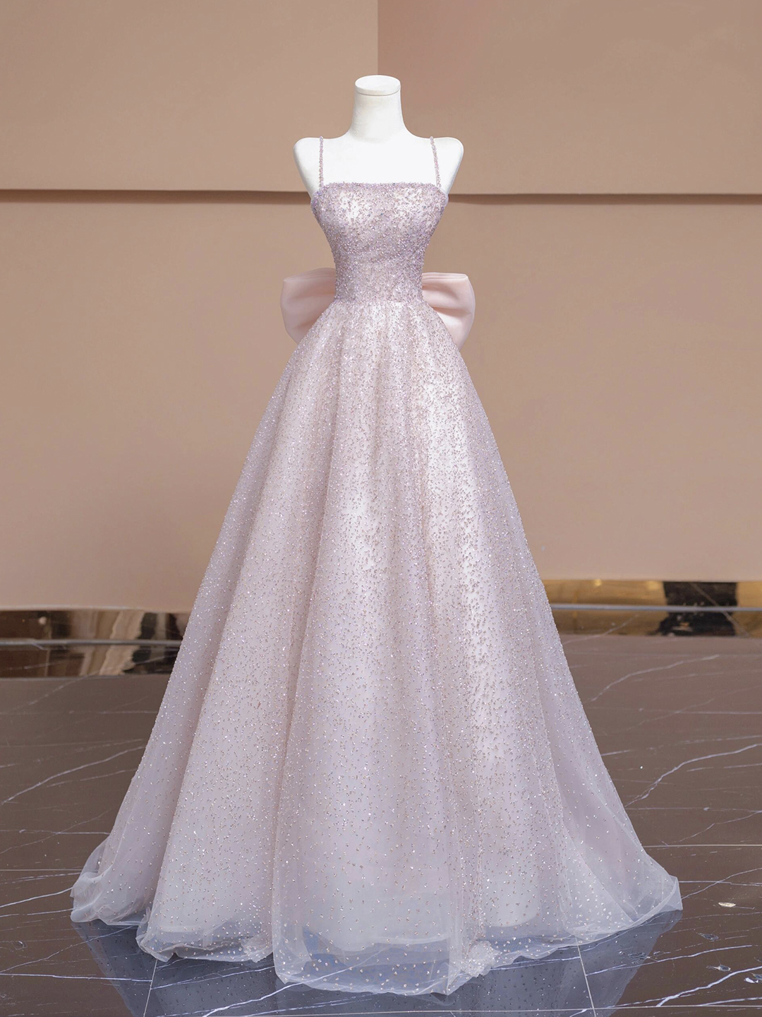 - Pink Tulle Sequins Long Prom Dress with Bow -
