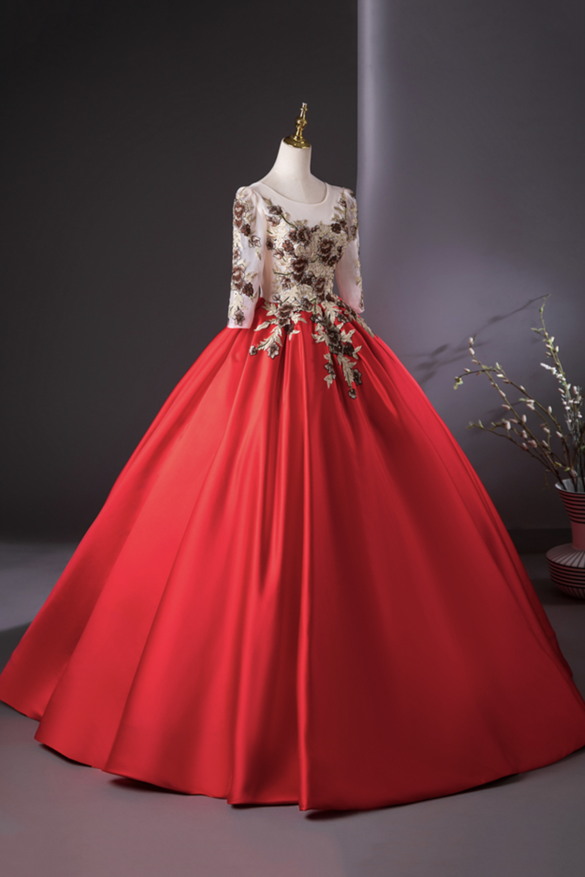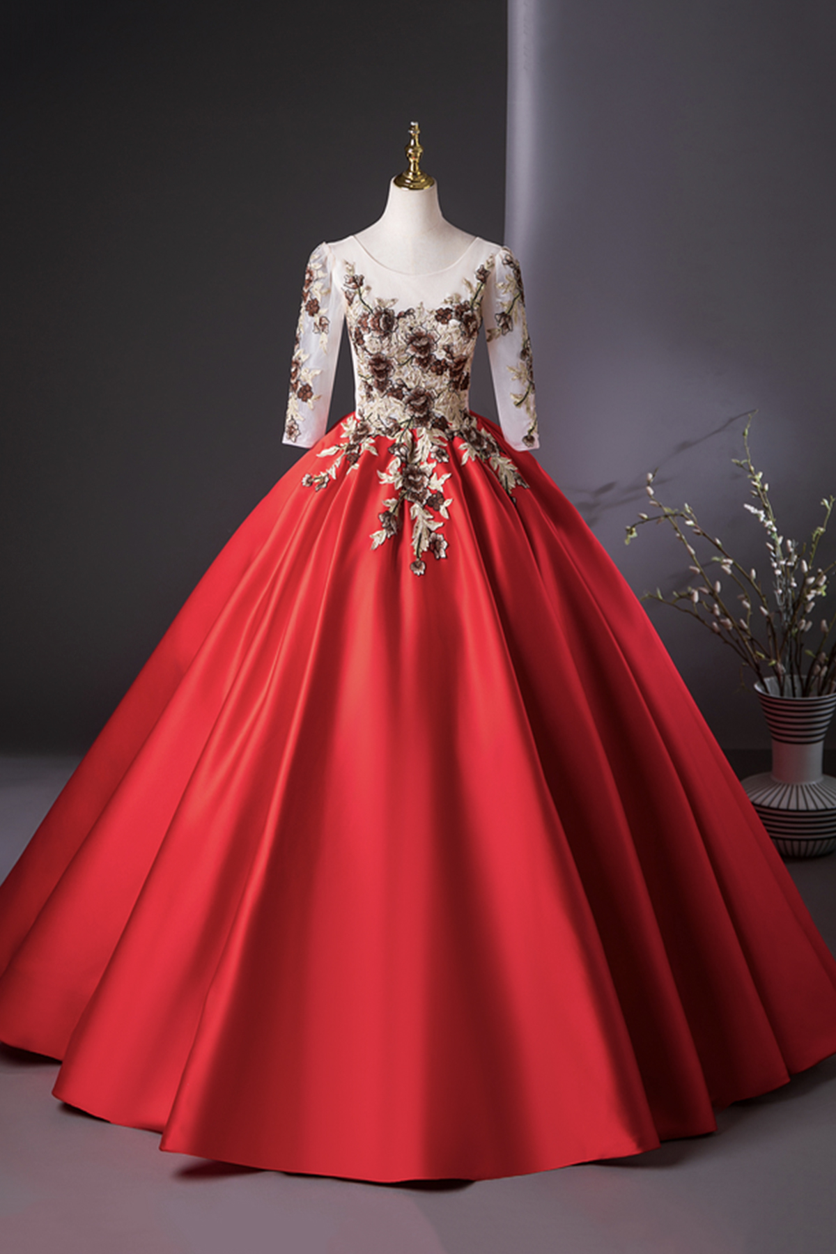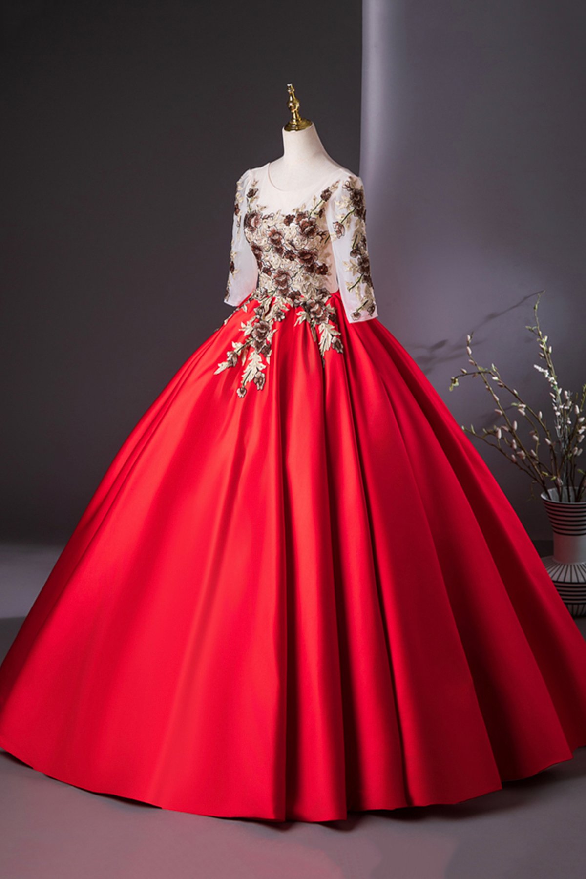 - Red Satin Lace 1/2 Sleeve Long Prom Formal Dress -